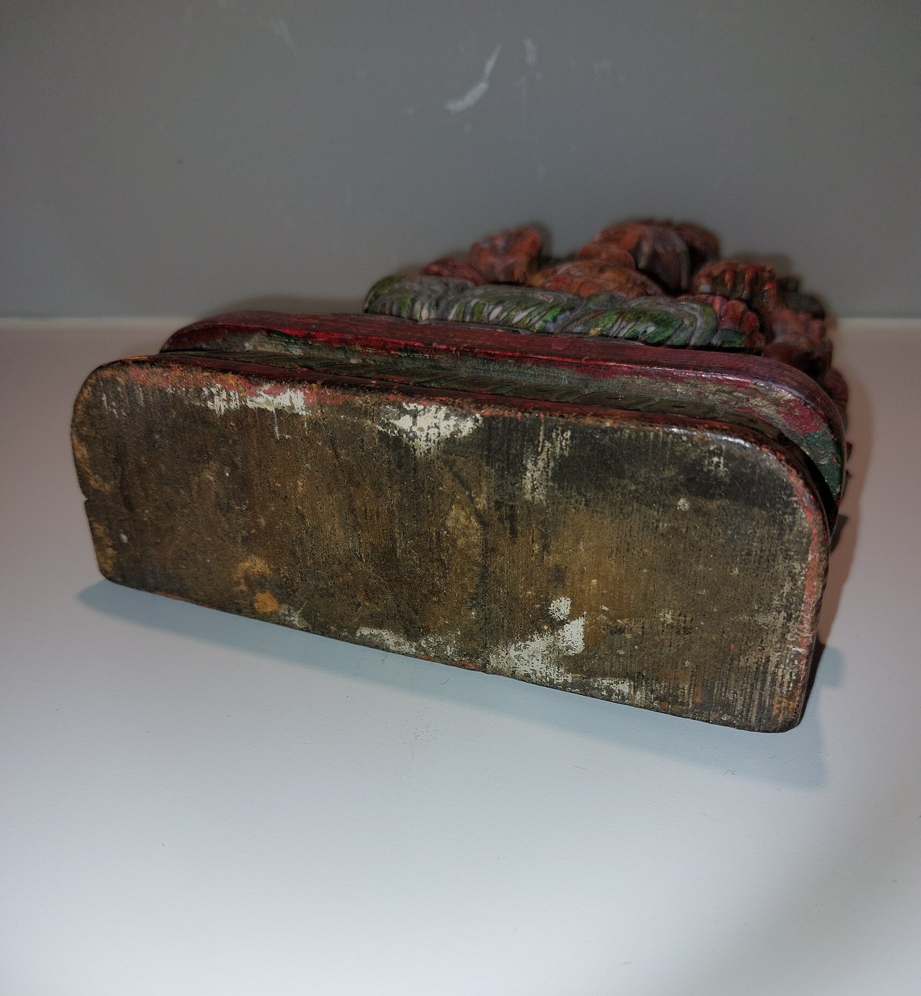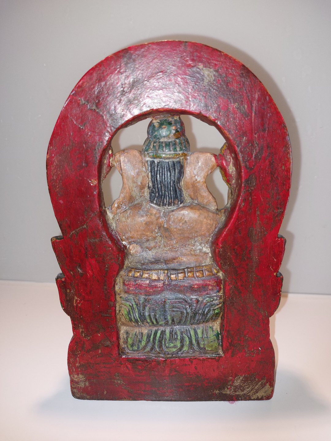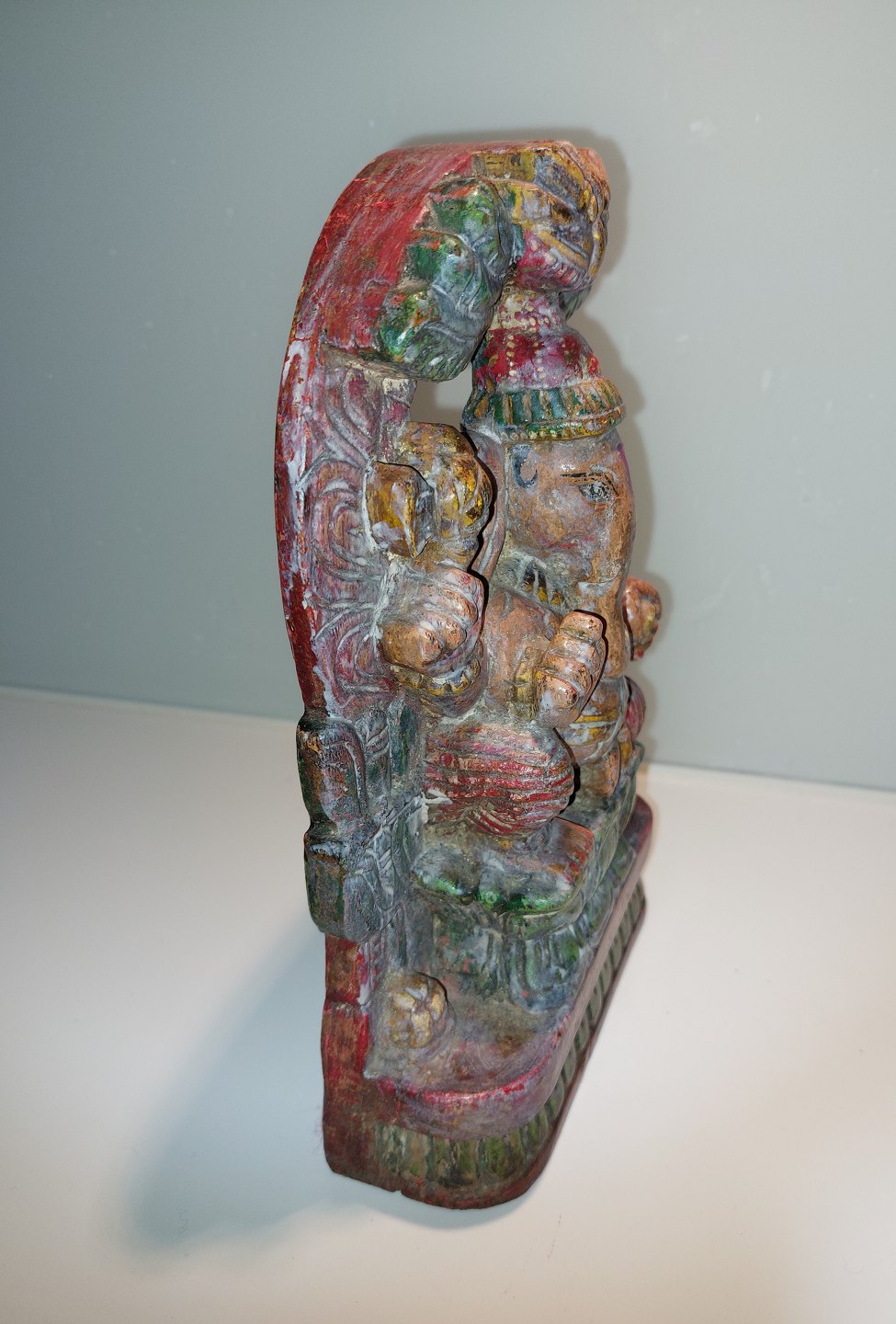 Bemalet figur skåret i træ forestillende den indiske elefantgud Ganesh. Fremstår I god stand. Mål: H. 24,5 cm L. 15,5 cm D. 6,5.cm