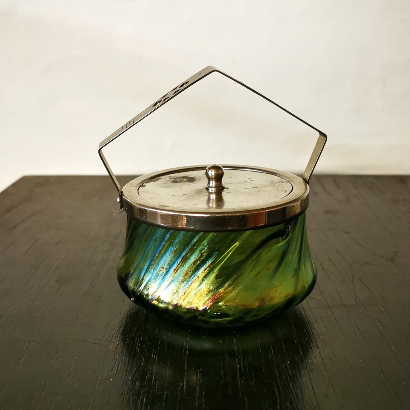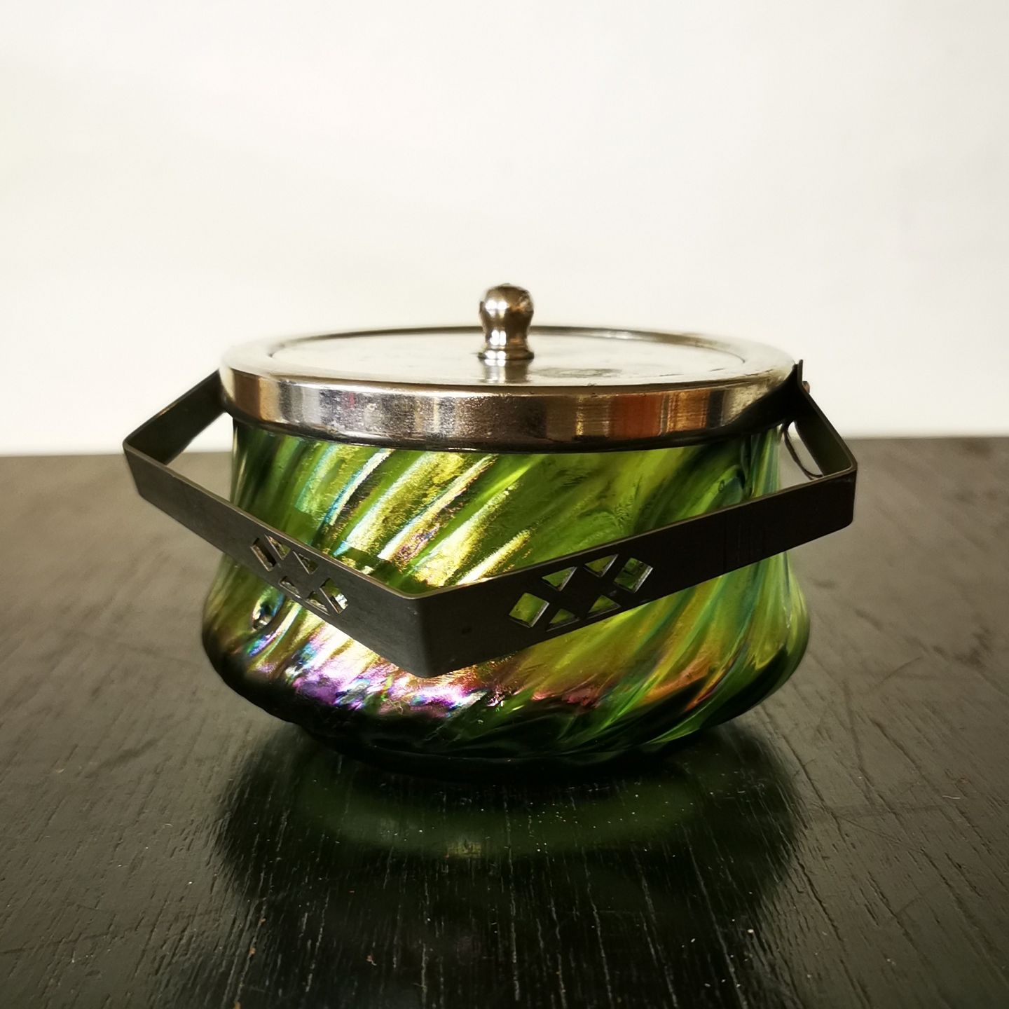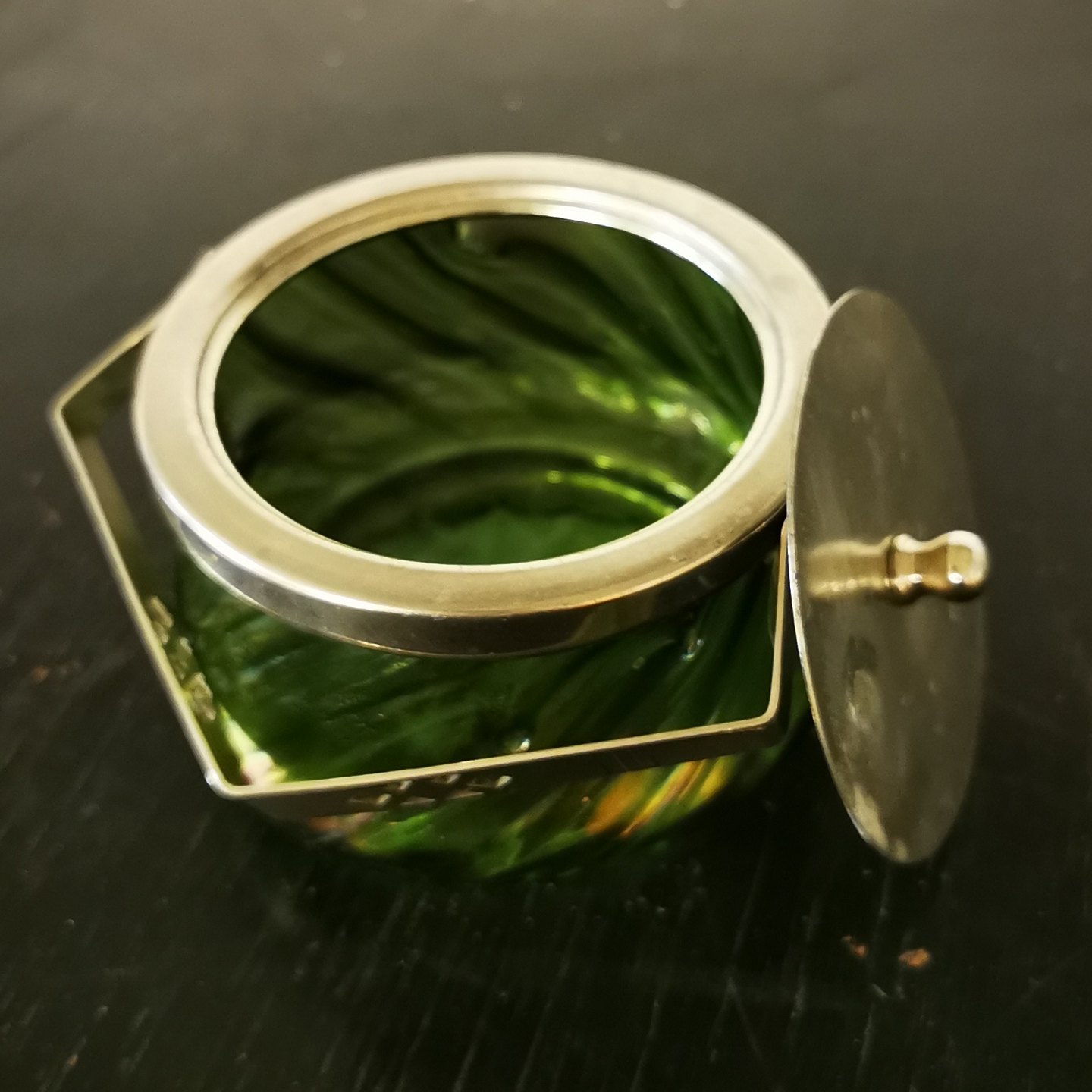 Grøn sukkerskål i glas med metal låg og hank. Formodes fremstillet i Bøhmen i begyndelsen af 20. Århundrede. I god stand. Mål: H. 7 cm (13 cm høj med opståede hank). Top diameter på 9 cm.