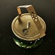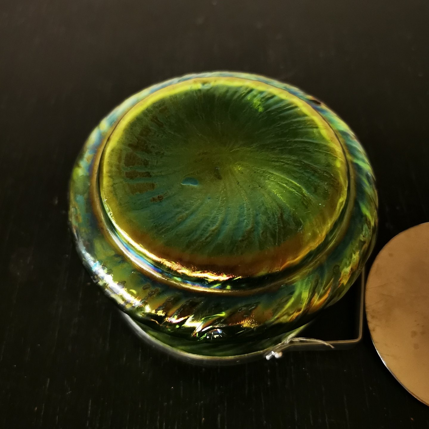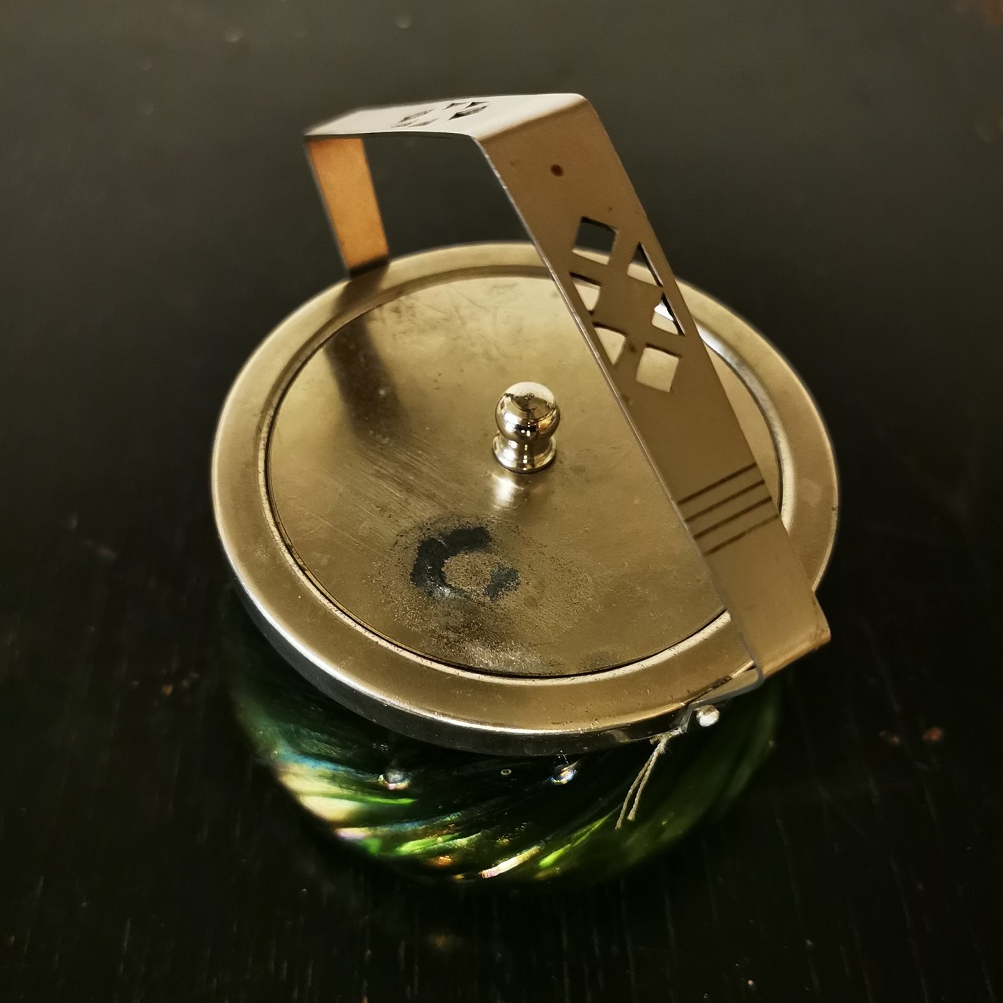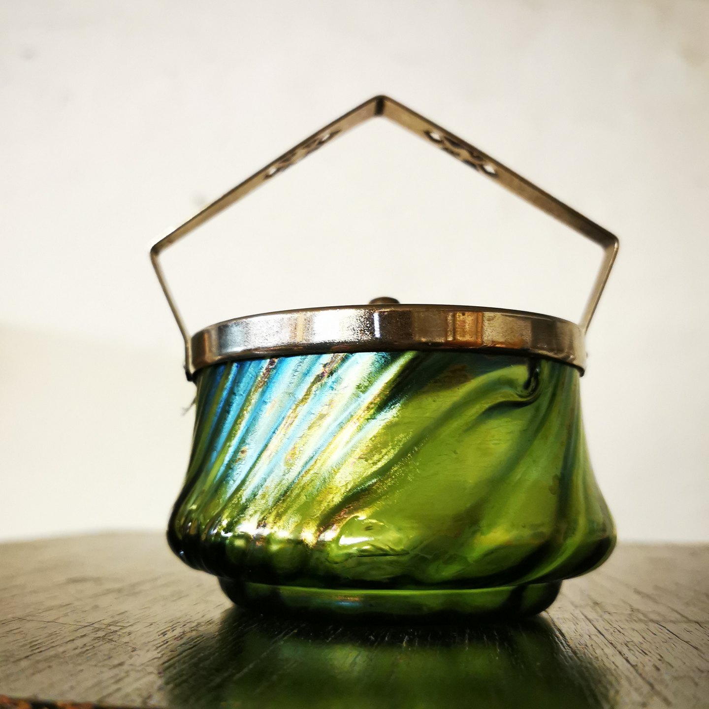 Grøn sukkerskål i glas med metal låg og hank. Formodes fremstillet i Bøhmen i begyndelsen af 20. Århundrede. I god stand. Mål: H. 7 cm (13 cm høj med opståede hank). Top diameter på 9 cm.