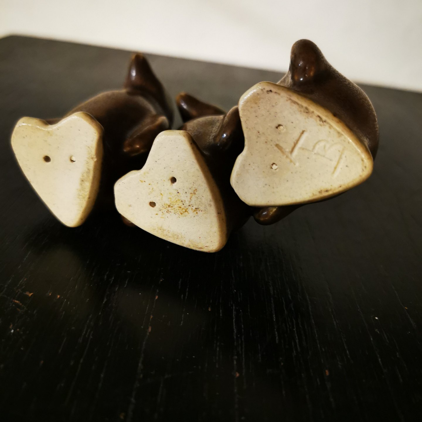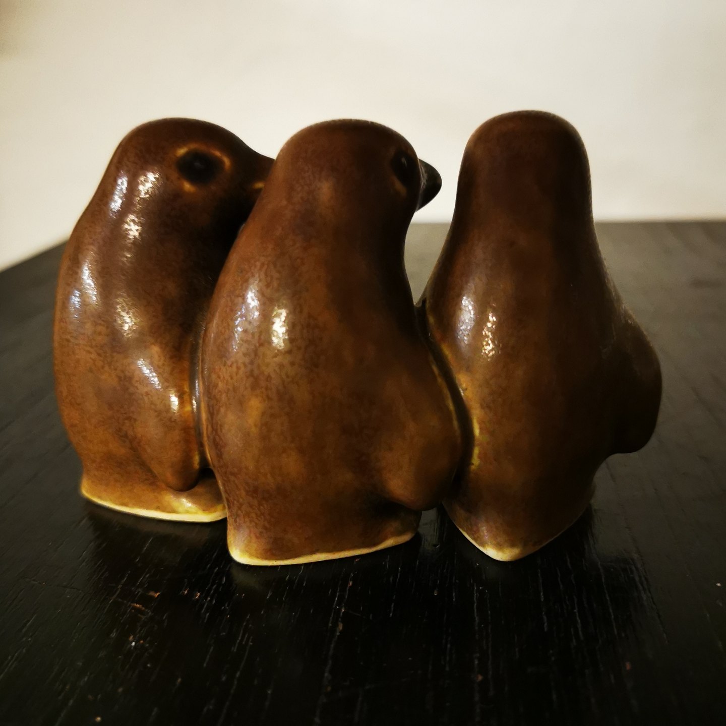 Figur i keramik med tre pingvinunger stående sammen. Produceret på Knud Basse´s værksted i Vang på Bornholm. Dækket af brun "harepelsglasur". Indridset kunstnersignatur på bunden med KB. Mål: H. 7 cm L. 11½ cm
