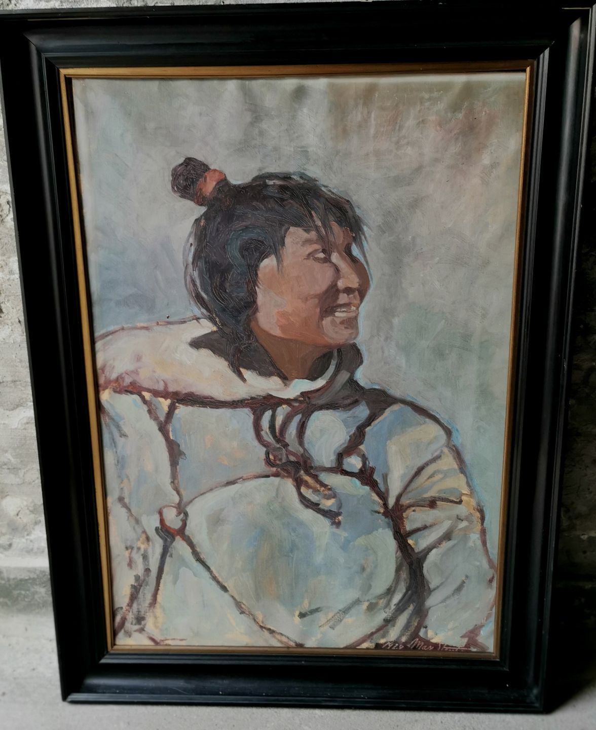 Olie på lærred: Portræt af smilende grønlandsk kvinde i anorak. Malet af Max Stentzer (1882-1968) i 1928. Både ramme og lærred fremstår i god stand uden skader eller reparationer. Mål incl. ramme: 72 x 92 cm.