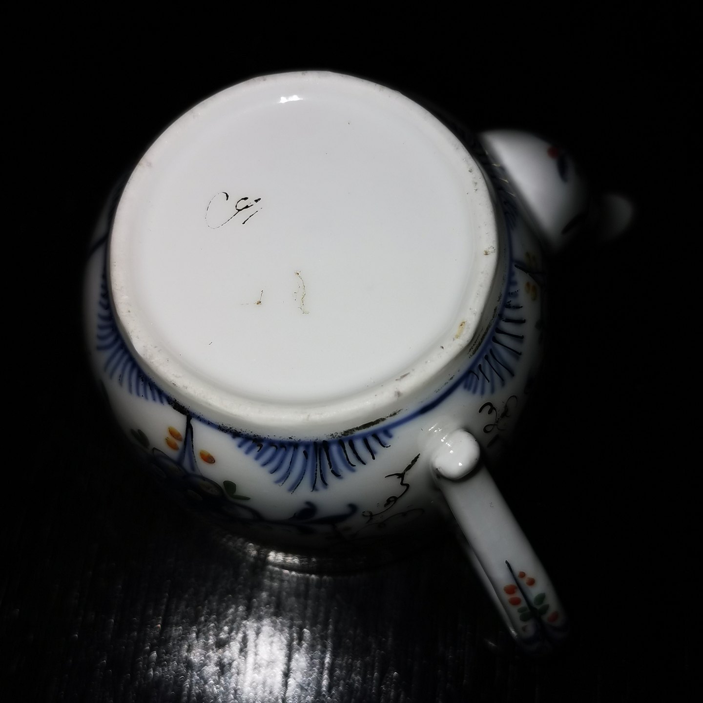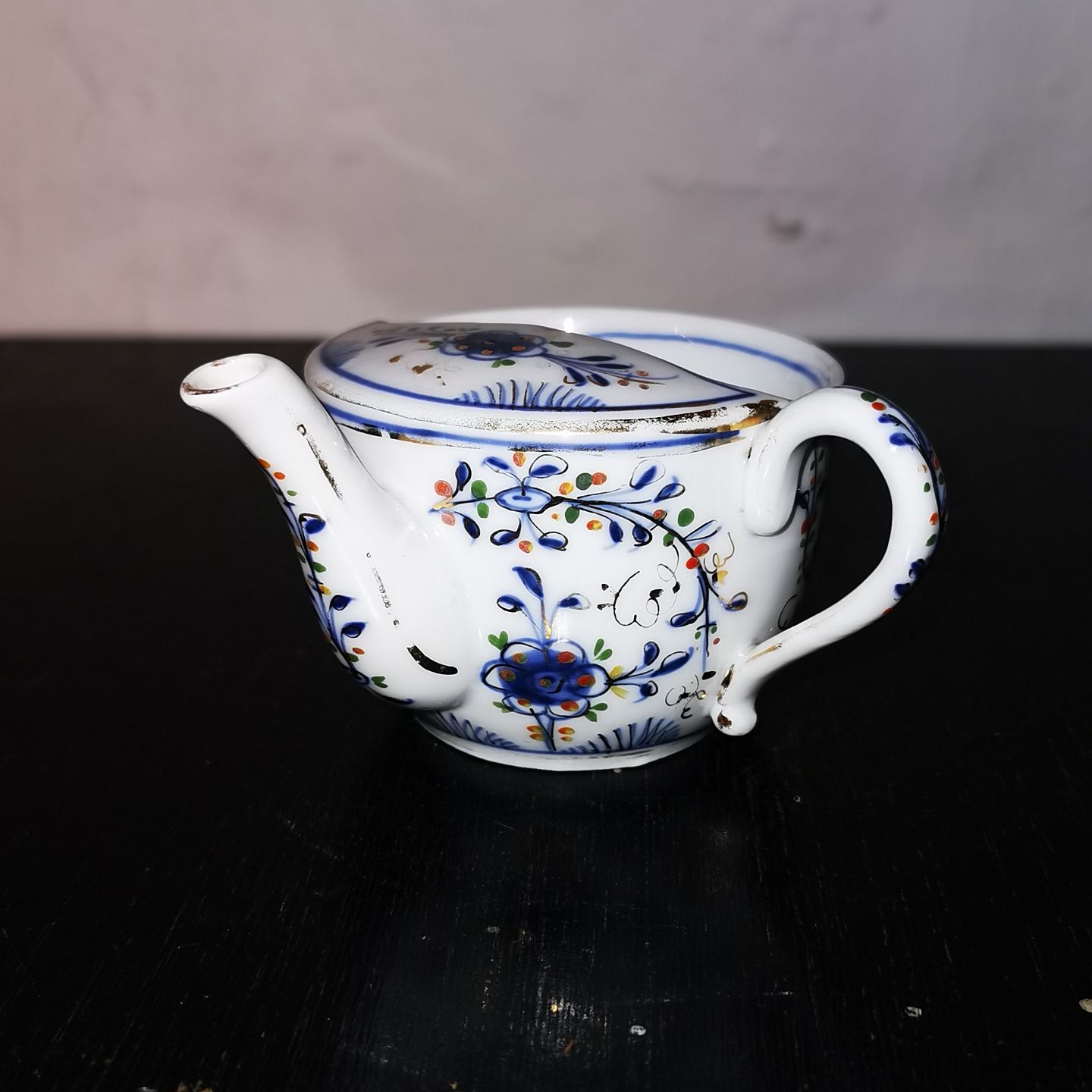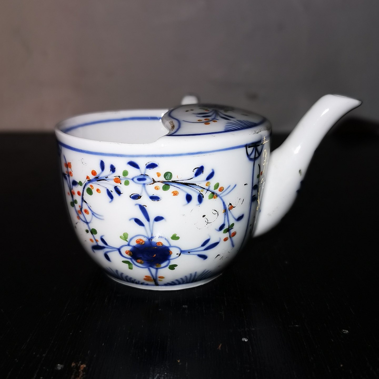 Kande i musselmalet porcelæn. Til hjælp når sengeliggende svagelig person skal indtage væske. Mere jævne udgaver er brugt på hospitaler og plejehjem. Denne flotte musselmalede udgave er sikkert anvendt i privat hjem. Fremstillet i begyndelsen af 20. århundrede. I perfekt stand. Hvem der har lavet den vides ikke, men kvaliteten af dekorationen er meget fin. H. 6½ cm.