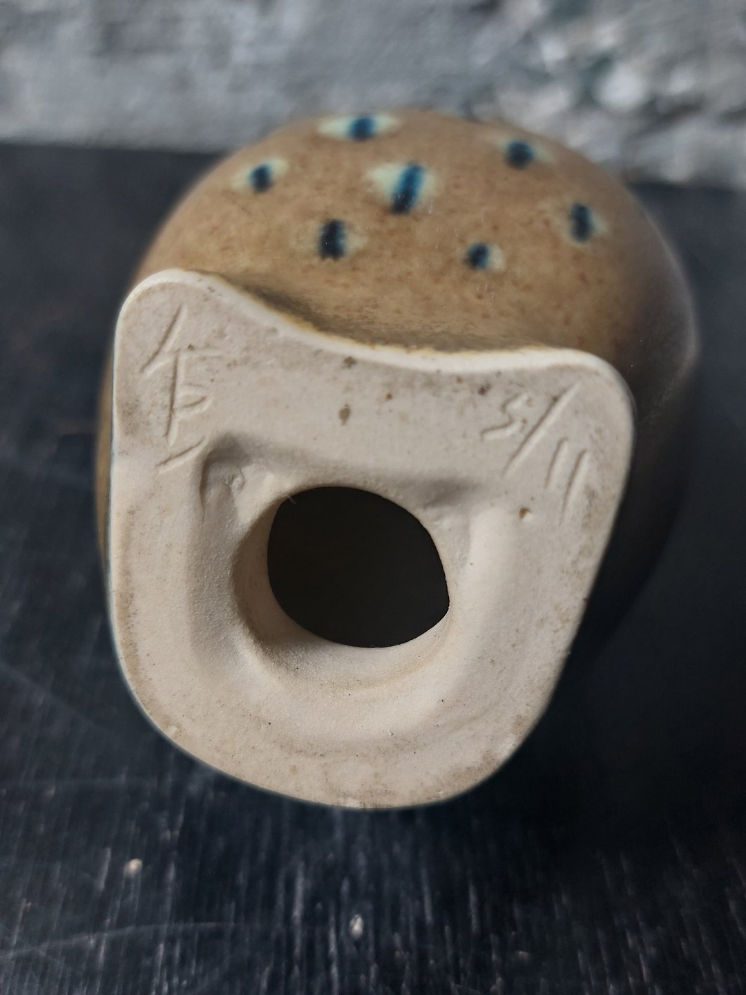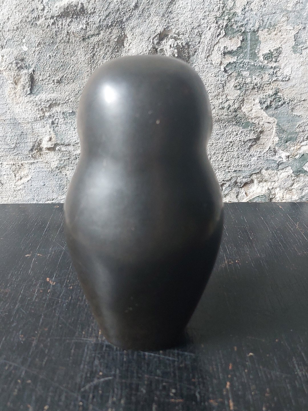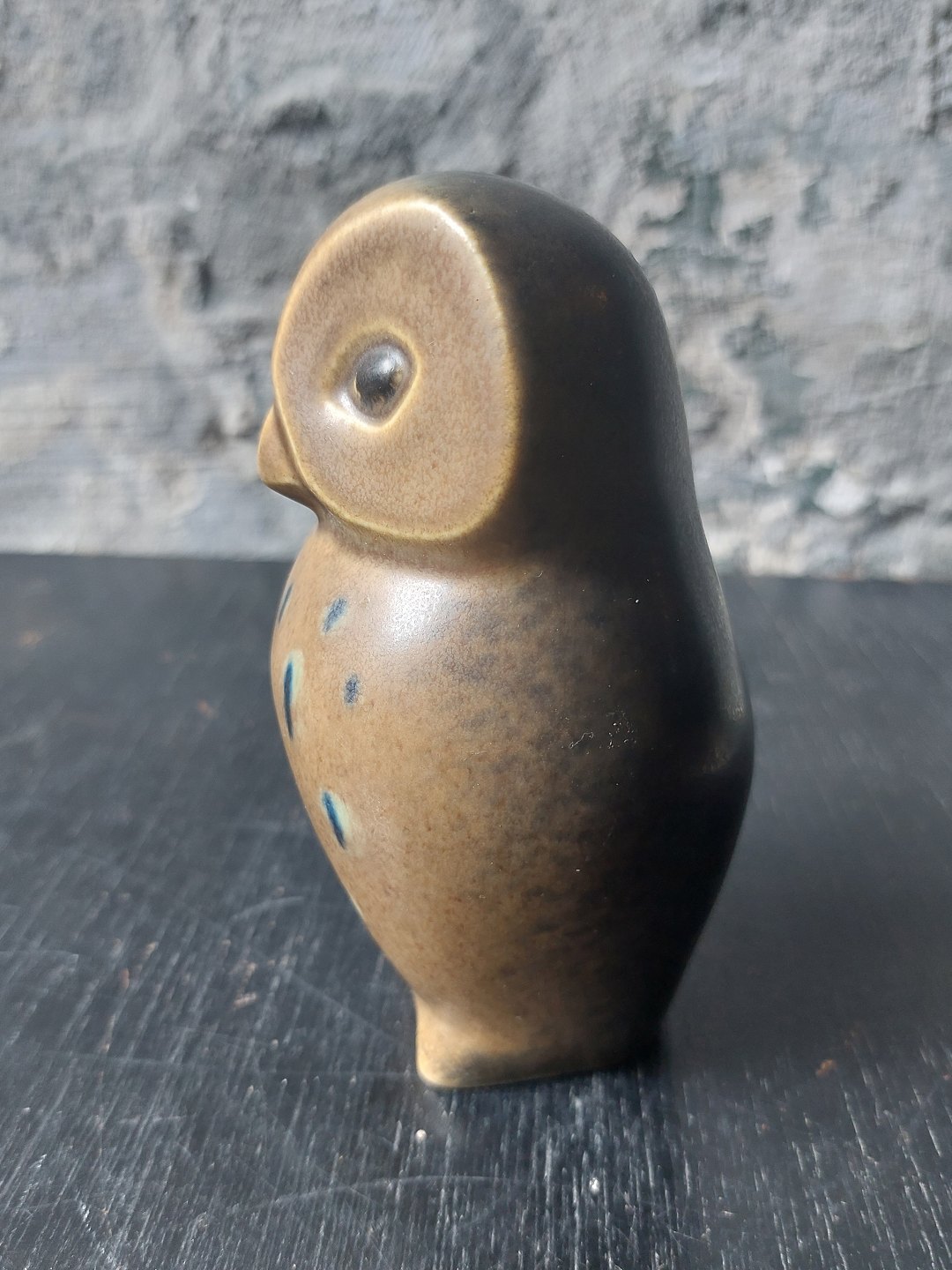 Figur af stående ugle i keramik. Udført af Knud Basse i Vang på Bornholm. Figuren er dækket af en især brun glasur. Fremstår i god stand uden skader eller reparationer. Kunstnersifnatur samt modelnummer på bunden. H. 13 cm.