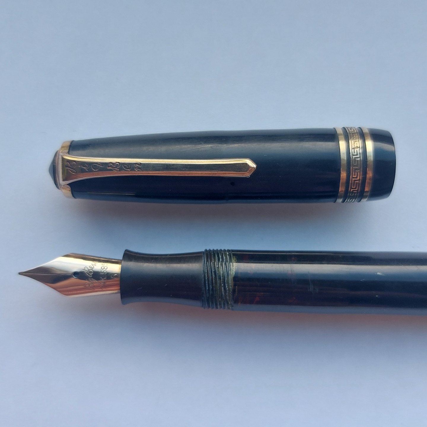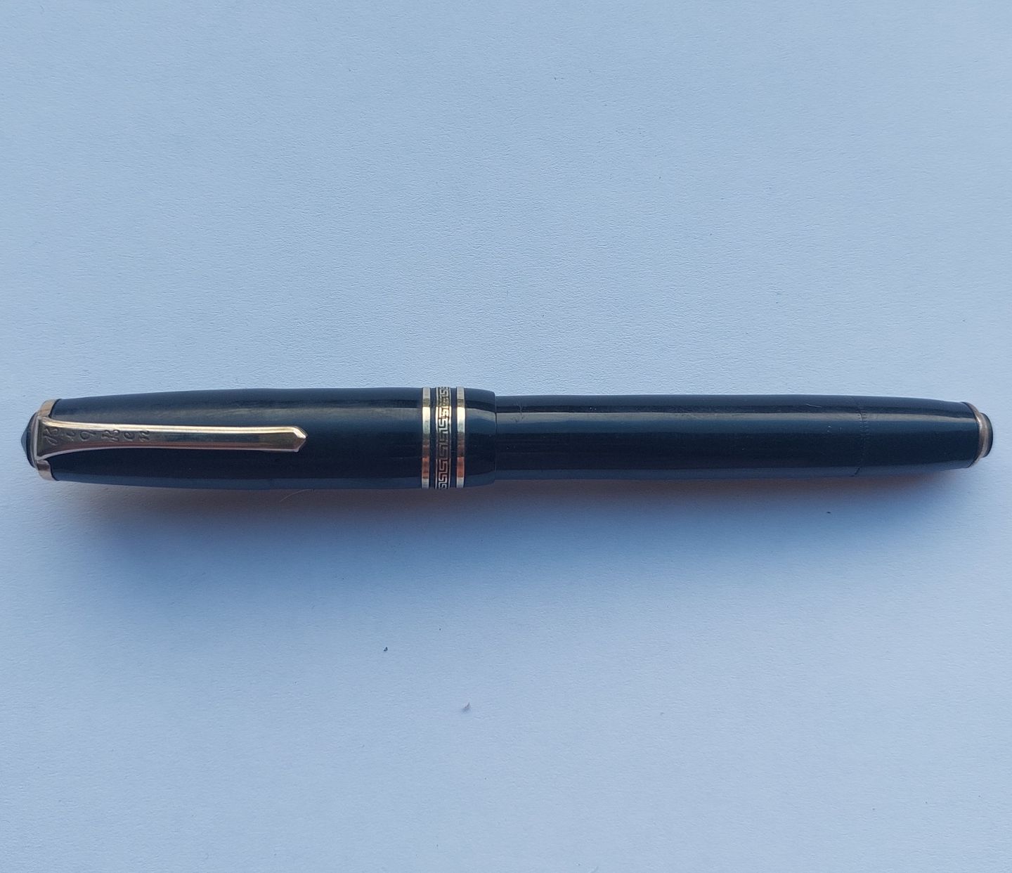 Sort Big Ben fyldepen fra ca. 1950. Piston blæk påfylder. Er blevet testet. Holder blæk og således klar til at blive brugt. Hætten, med a la greque bort dekoration, er lidt bølget, men sidder fint på pennen. Hætten indgraveret BIG BEN British Product No. 451 168. Mål: L. 13.5 cm