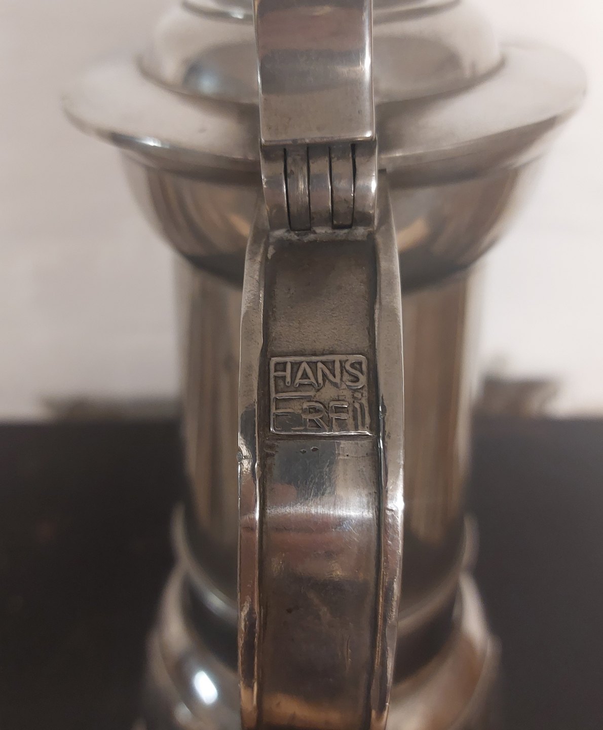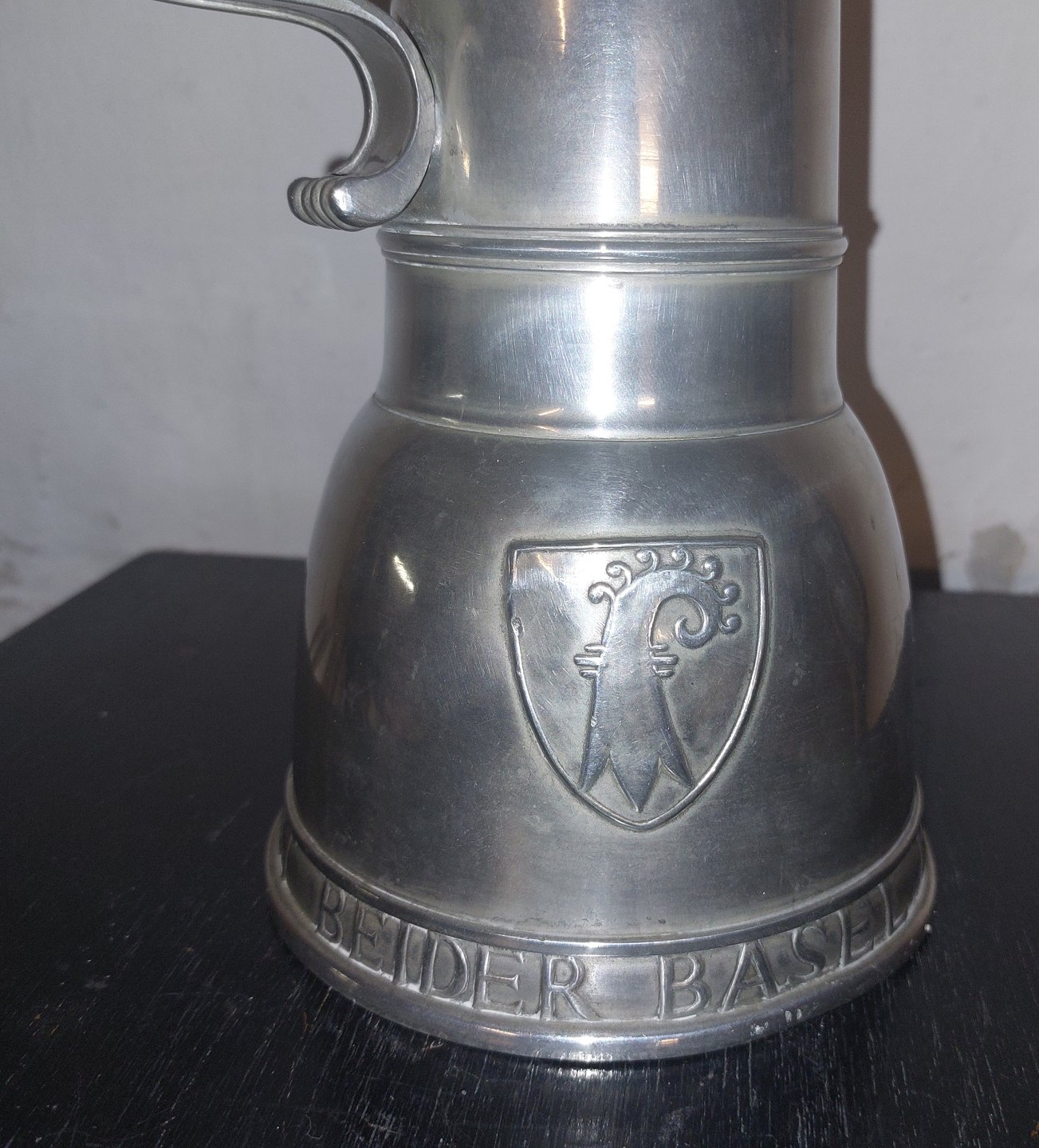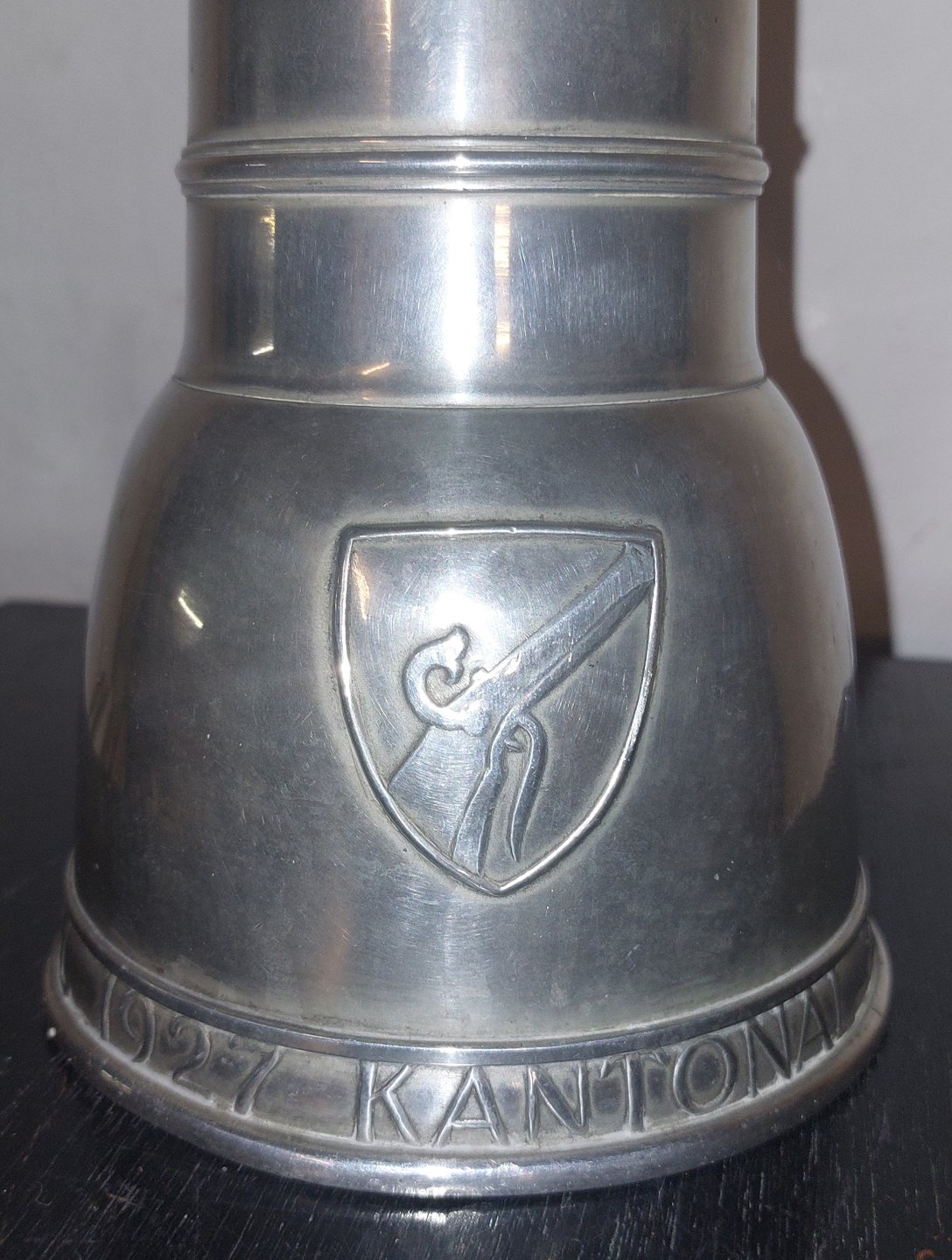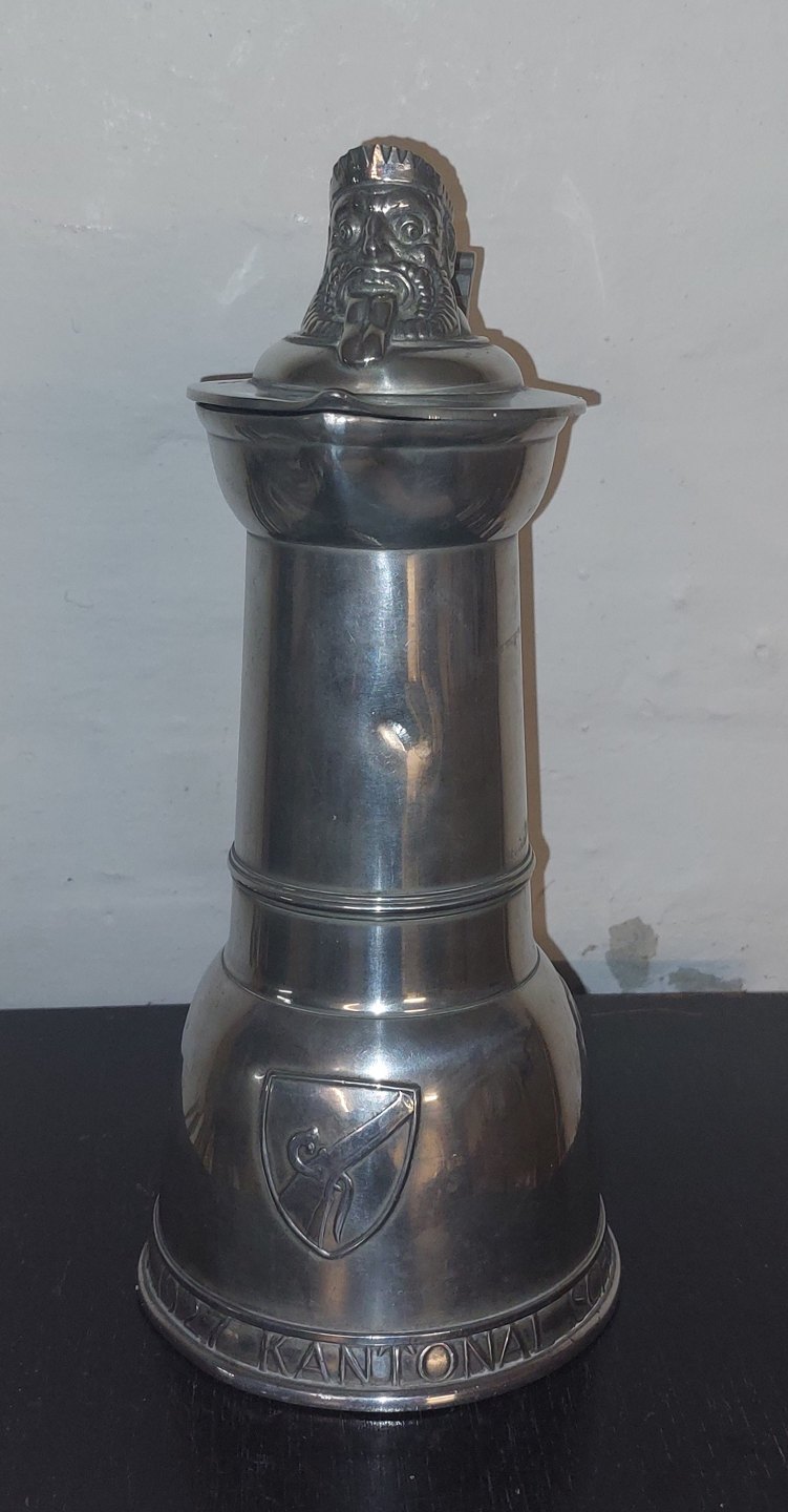 Høj kande i tin fremstillet i Schweitz. Designet af Hans Frei (1868-1947) som præmie til skydefestival. Tekst på bunden:.KANTONAL SCHÜTZENFEST BEIDER BASEL 1927. Har et par mindre buler. Ingen skader eller reparationer. H. 32,5 cm