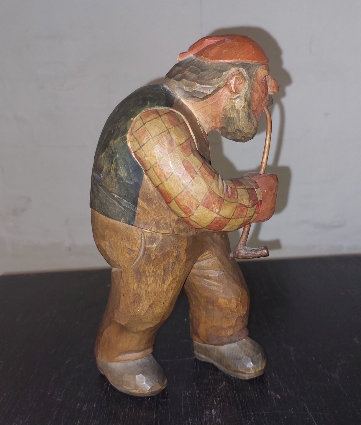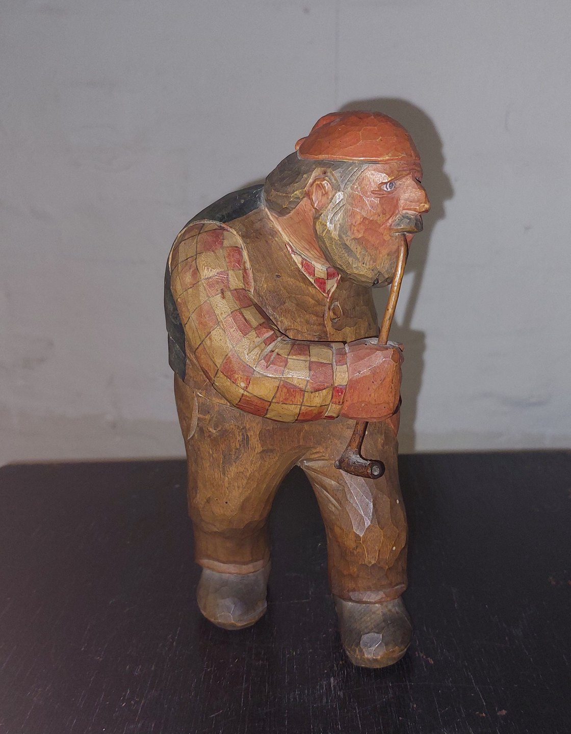 Håndskåret figur af mand der ryger på lang pibe. Iført ternet skjorte, vest samt rød hue på hovedet. Med højre hånd holder han på langpiben. I fin stand uden skader eller reparationer. Formodes fremstillet I Sverige. H. 21,5 cm