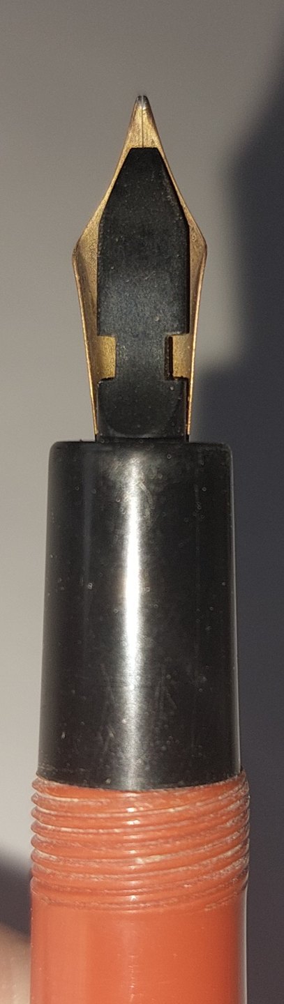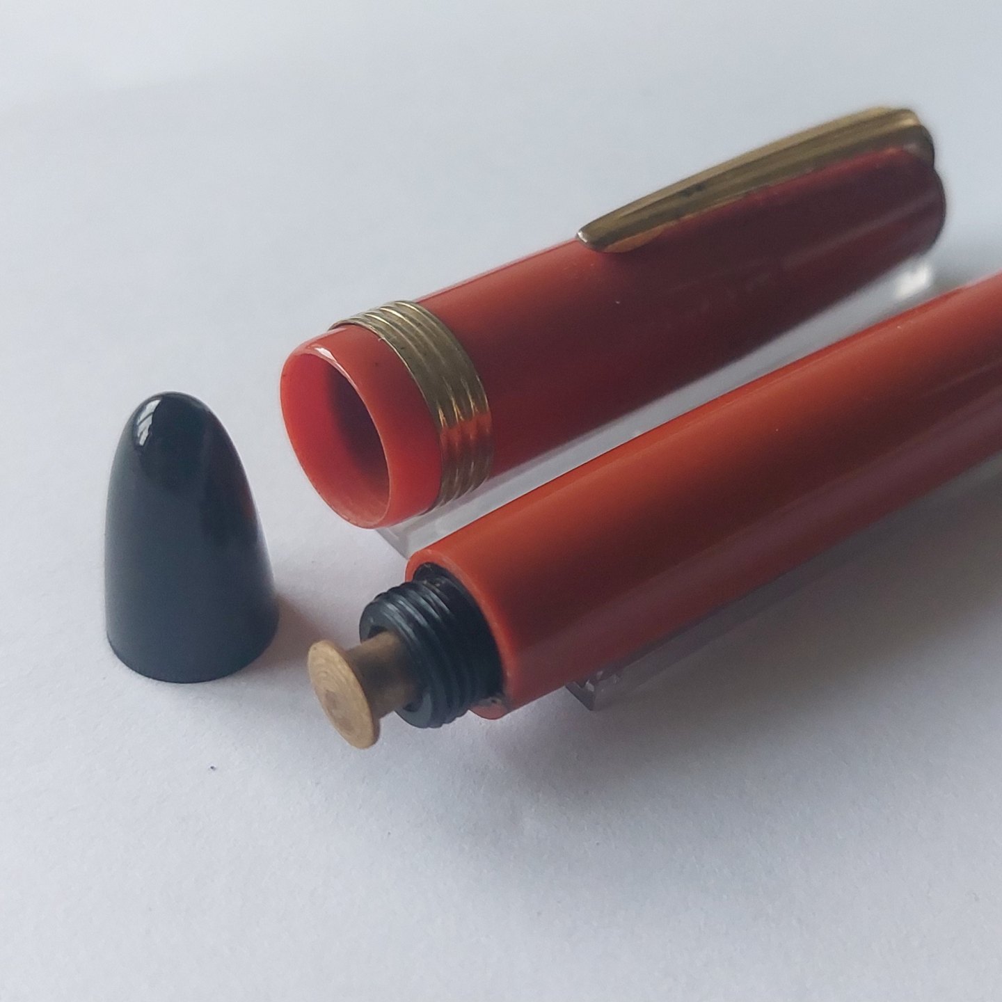 Koralrød Skribent Super 2 fyldepen. Fremstillet som bi-produkt (sub-brand) hos Penol i Danmark. Fremstillet omkring 1950. Fremstår I god stand uden skader eller reparationer. Fungerer ikke. Der skal indsættes ny gummisæk før end der kan påfyldes blæk igen. Ny gummisæk kan indsættes for et tillæg af d.kr. 200,00 Denne fyldepen er 12,5 cm lang