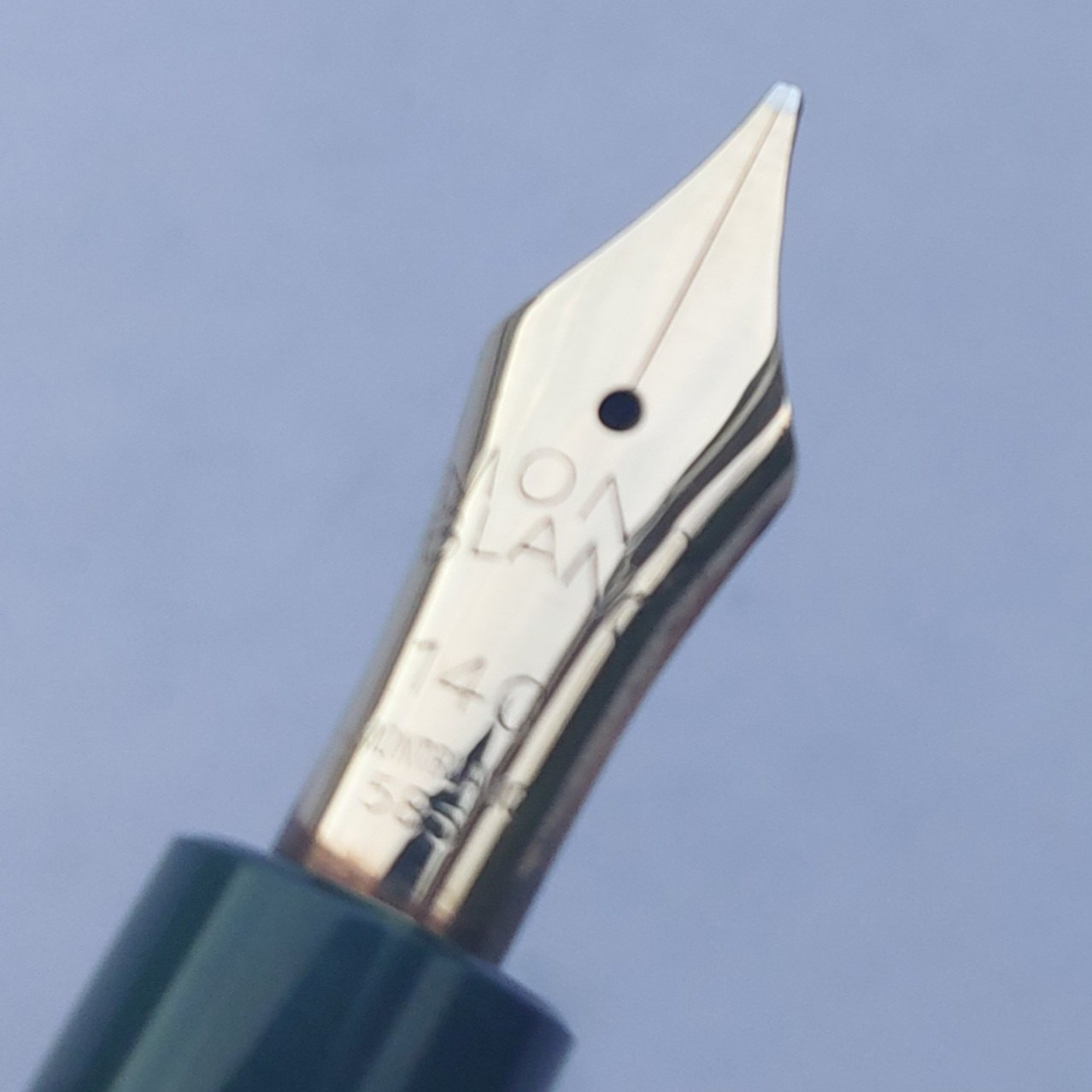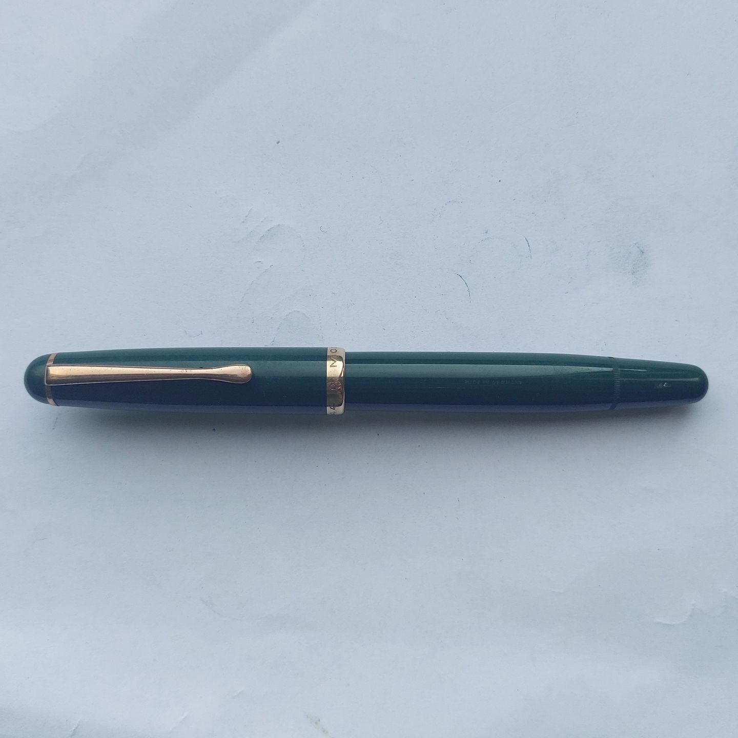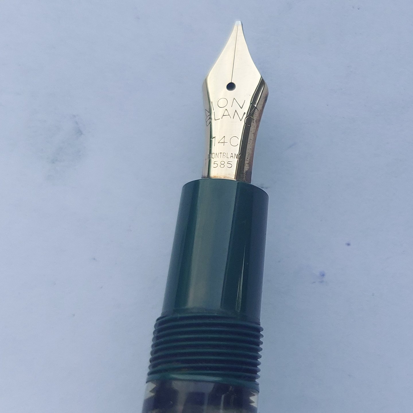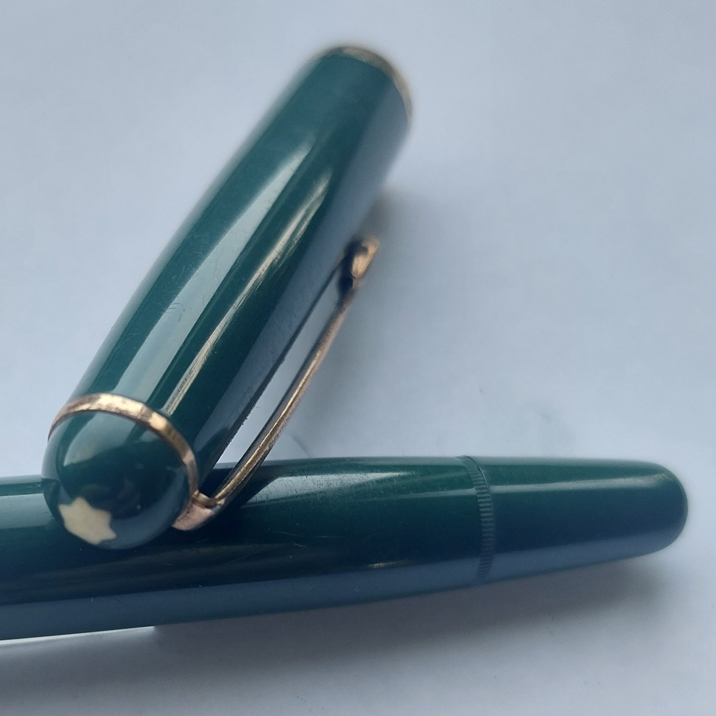 Montblanc nr. 344 fyldepen I grøn farve. Stempel blæk-påfylder. (Piston filler). I fin funktionsduelig stand. Fremstår I god stand uden skader eller reparationer. Alle dele originale Montblanc dele inclusiv 14 karat Montblanc guld spids. Fremstillet I Tyskland I 1950'erne.
