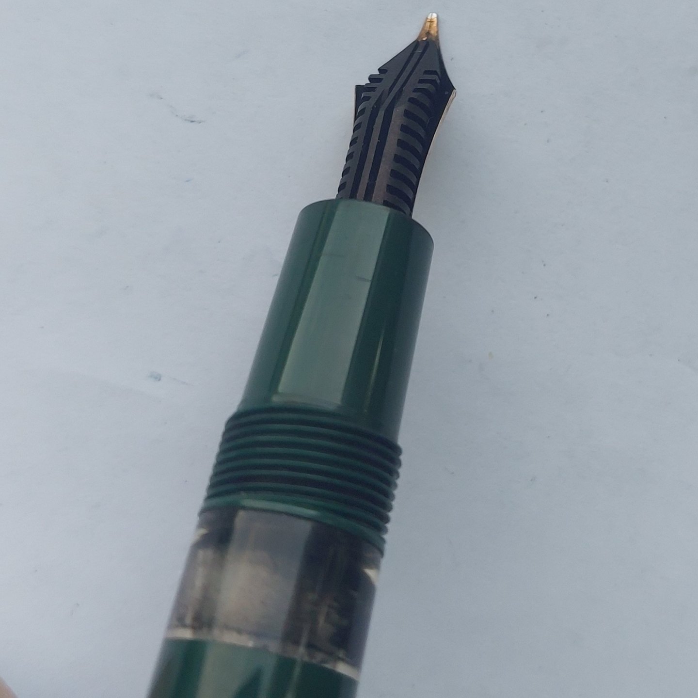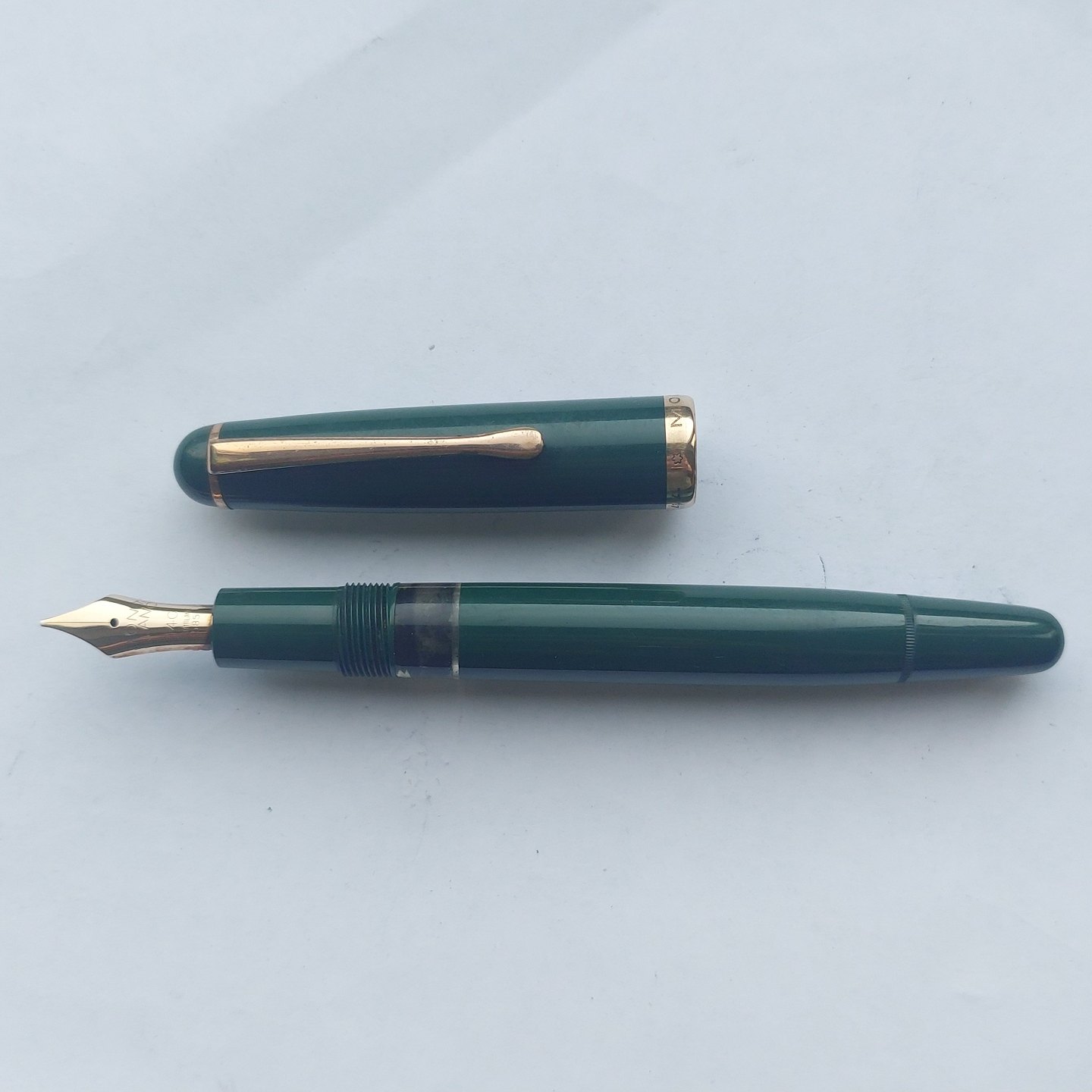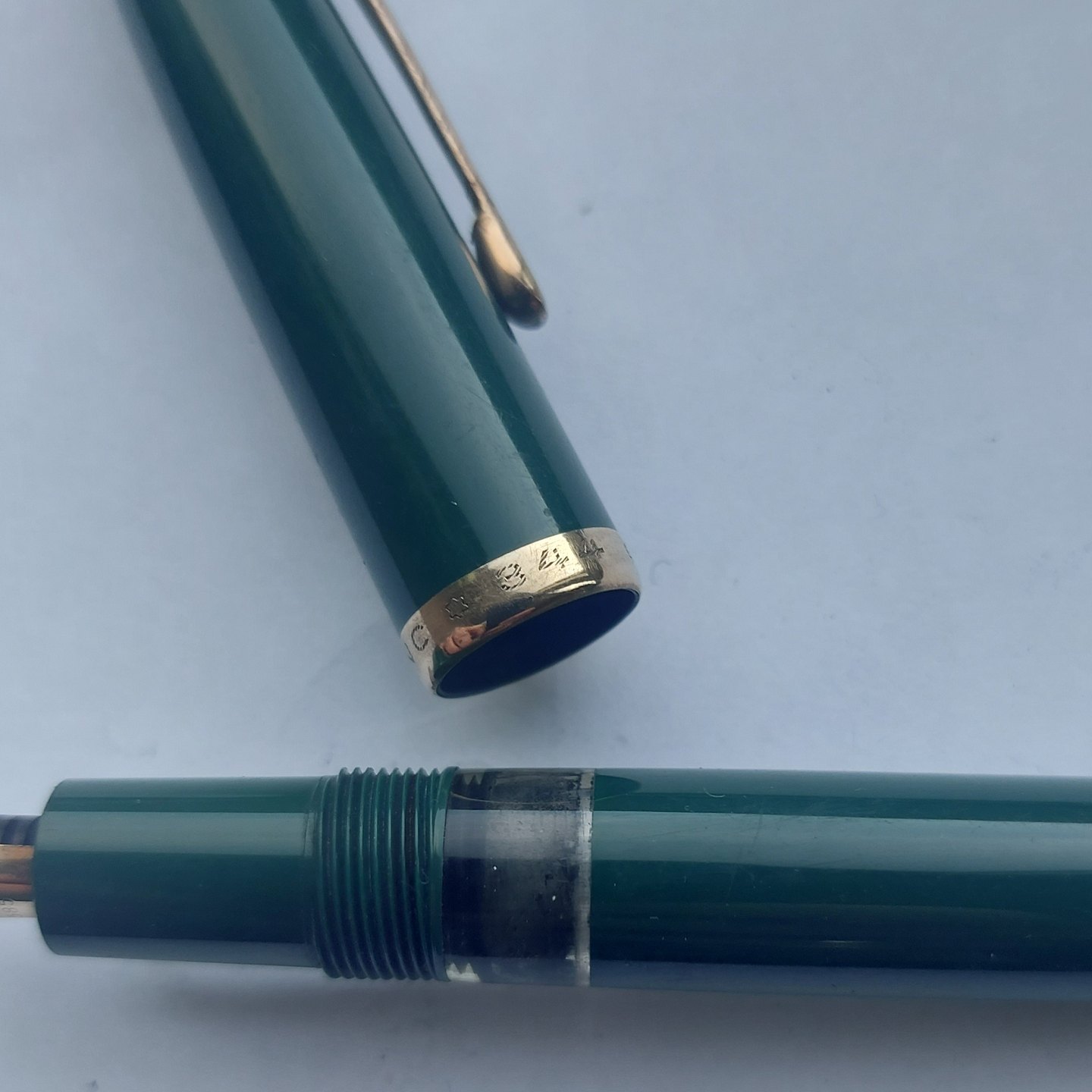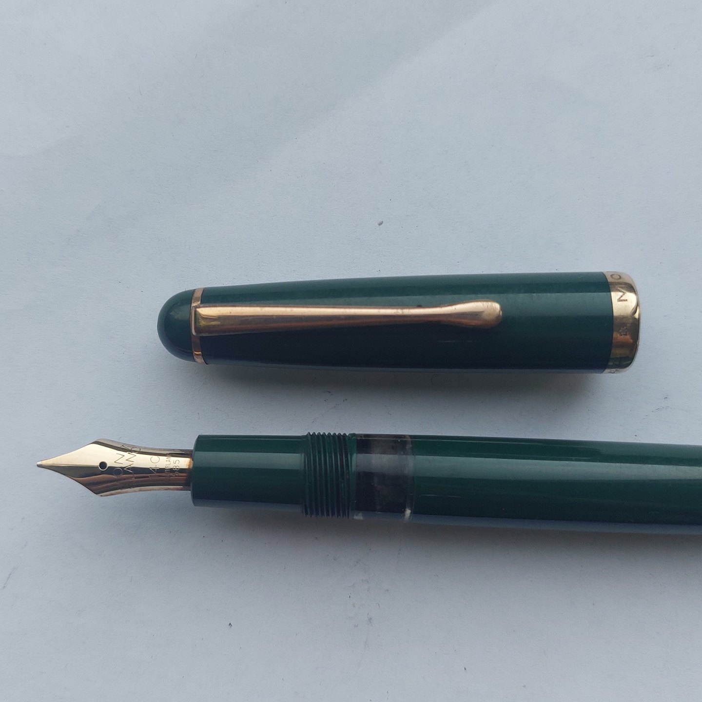 Montblanc nr. 344 fyldepen I grøn farve. Stempel blæk-påfylder. (Piston filler). I fin funktionsduelig stand. Fremstår I god stand uden skader eller reparationer. Alle dele originale Montblanc dele inclusiv 14 karat Montblanc guld spids. Fremstillet I Tyskland I 1950'erne.