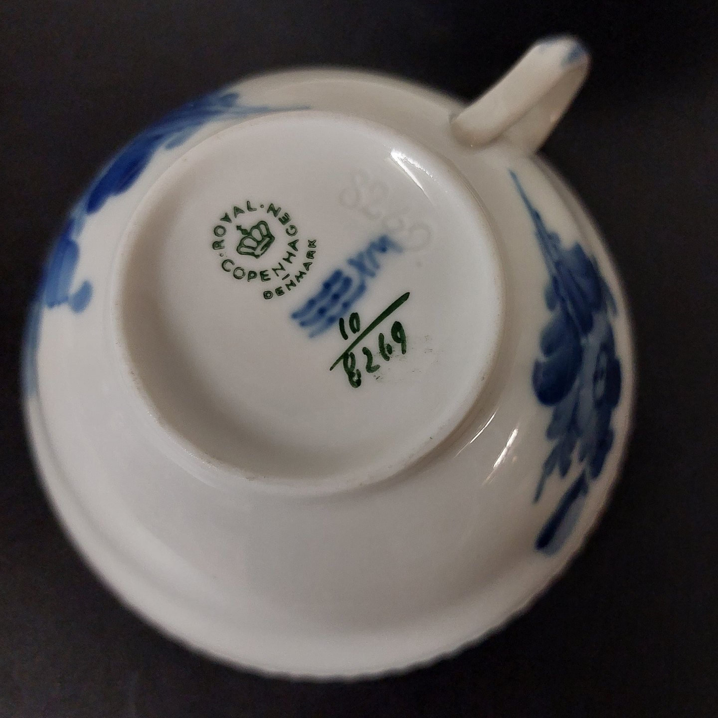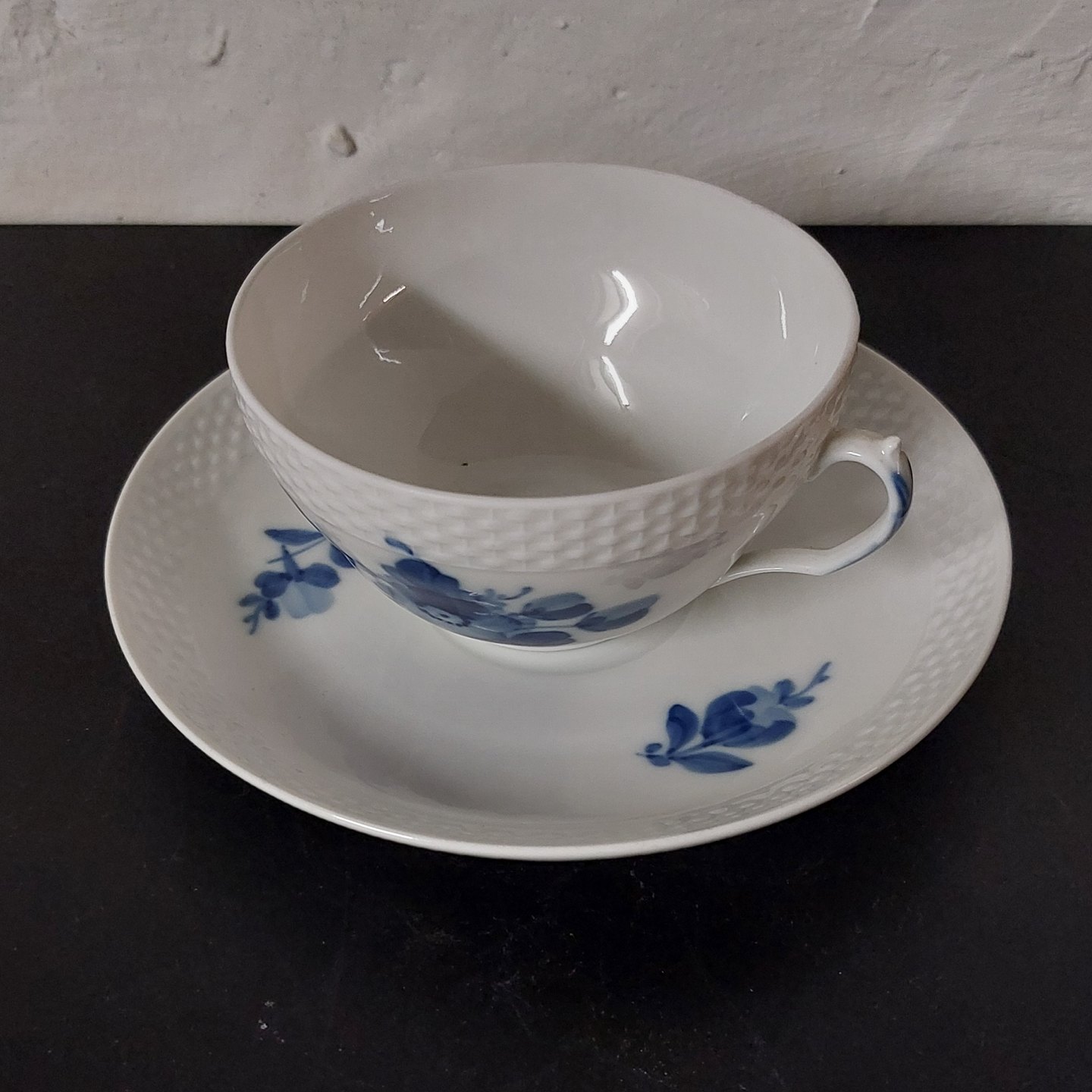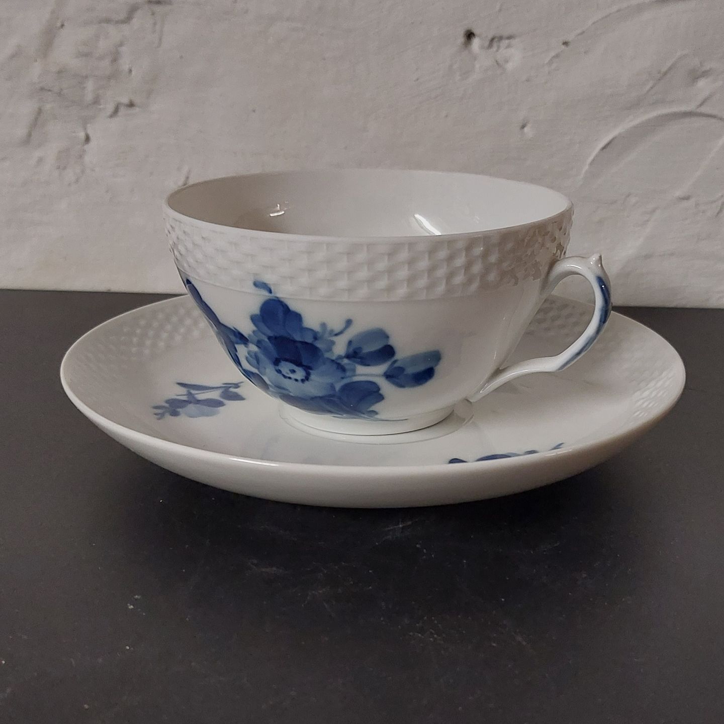 Royal Copenhagen tekop med underkop I Blå Blomst. Fremstår I god stand uden skader eller reparationer. Fabriksmærket på bunden sammen med modelnummer 8269. Begge dele 1. Sortering. Mål: Koppen er 5,7 cm høj med åbnings diameter på 10,5 cm. Underkoppens diameter er 16 cm.