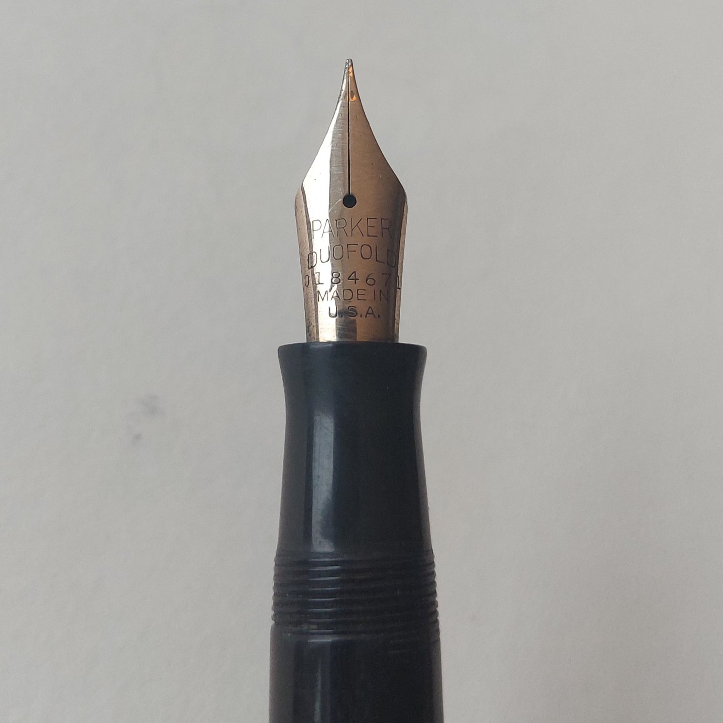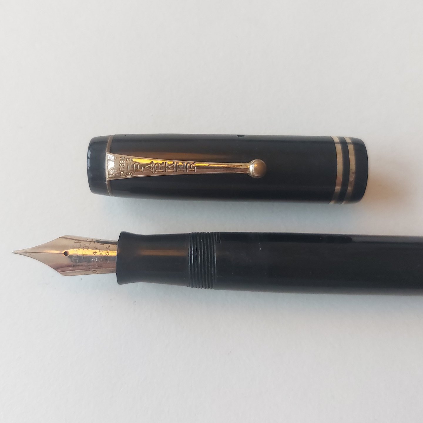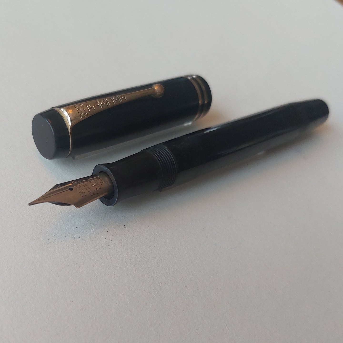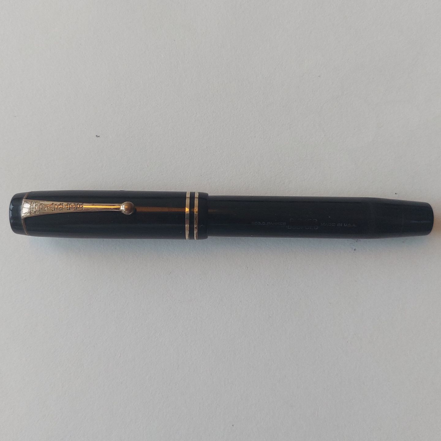 Sort Parker Duofold fyldepen fra 1940'erne. Fremstår I god stand uden skader eller reparationer. Alle dele originale Parker inclusiv en stor Parker Duofold 14 karat guldspids. Der skal indsættes ny gummisæk før end den fungerer igen. Ny gummisæk kan indsættes for et tillæg på kr..200,-