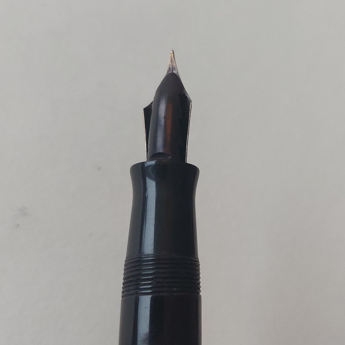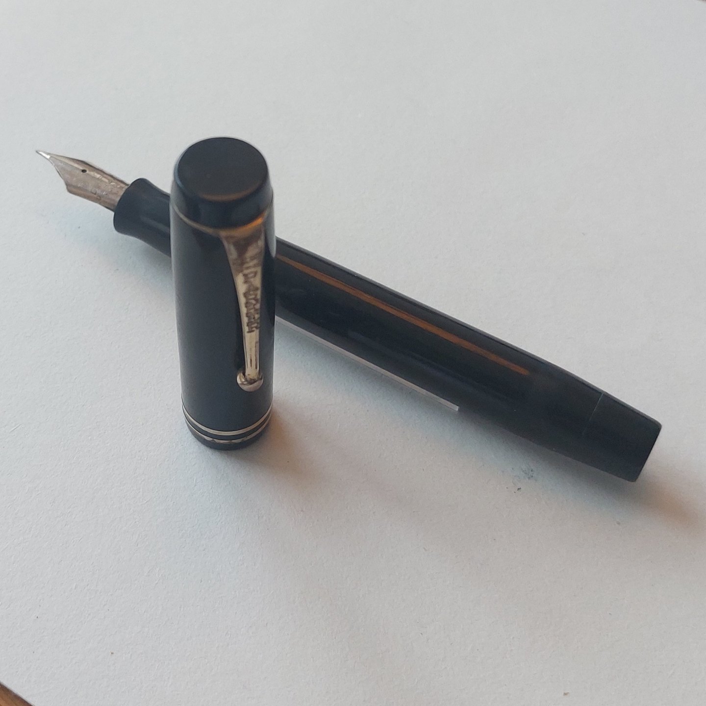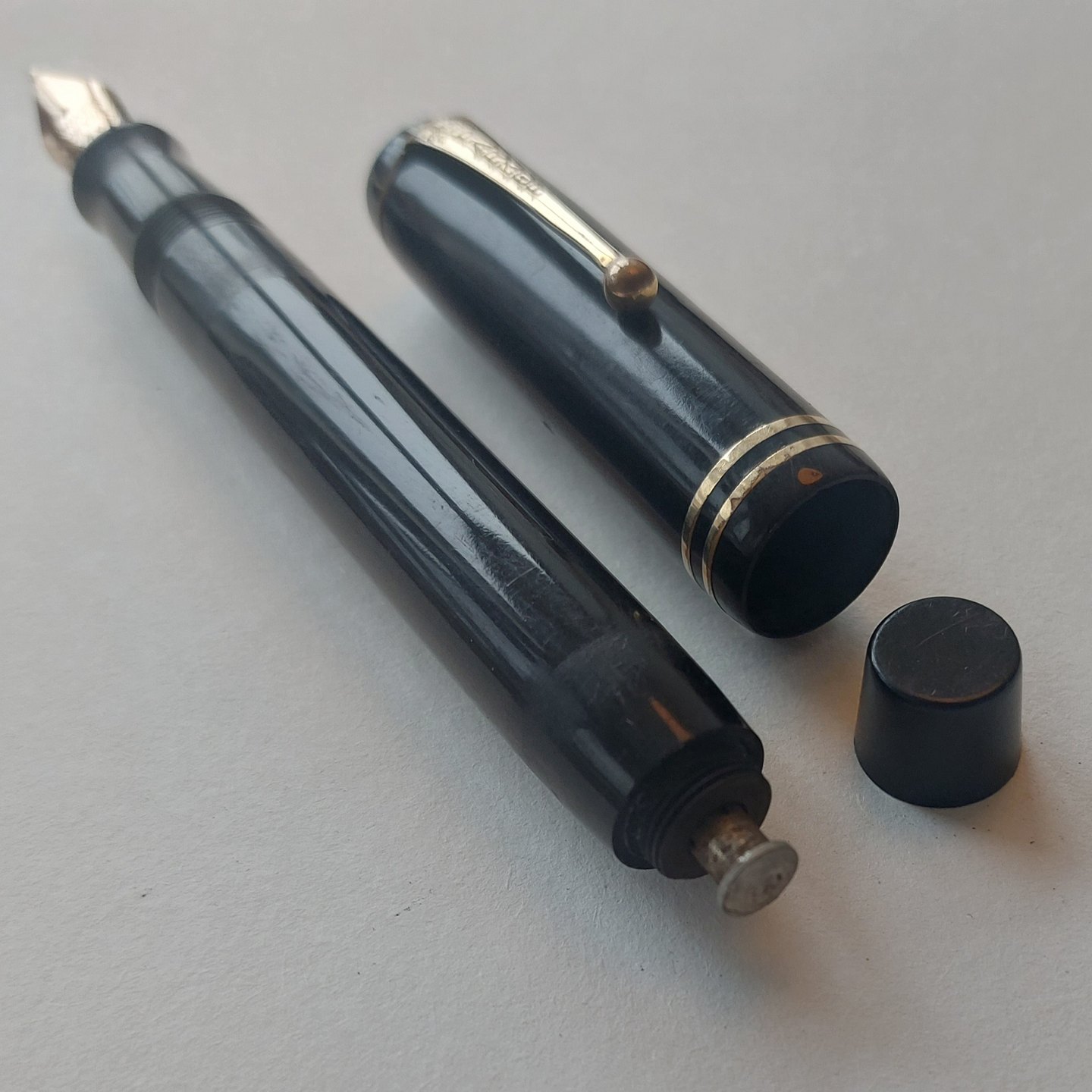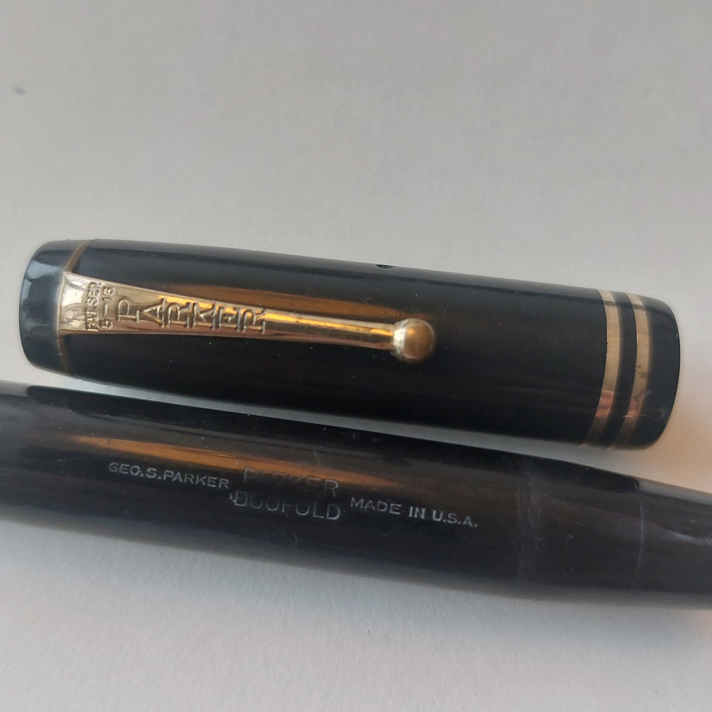 Sort Parker Duofold fyldepen fra 1940'erne. Fremstår I god stand uden skader eller reparationer. Alle dele originale Parker inclusiv en stor Parker Duofold 14 karat guldspids. Der skal indsættes ny gummisæk før end den fungerer igen. Ny gummisæk kan indsættes for et tillæg på kr..200,-