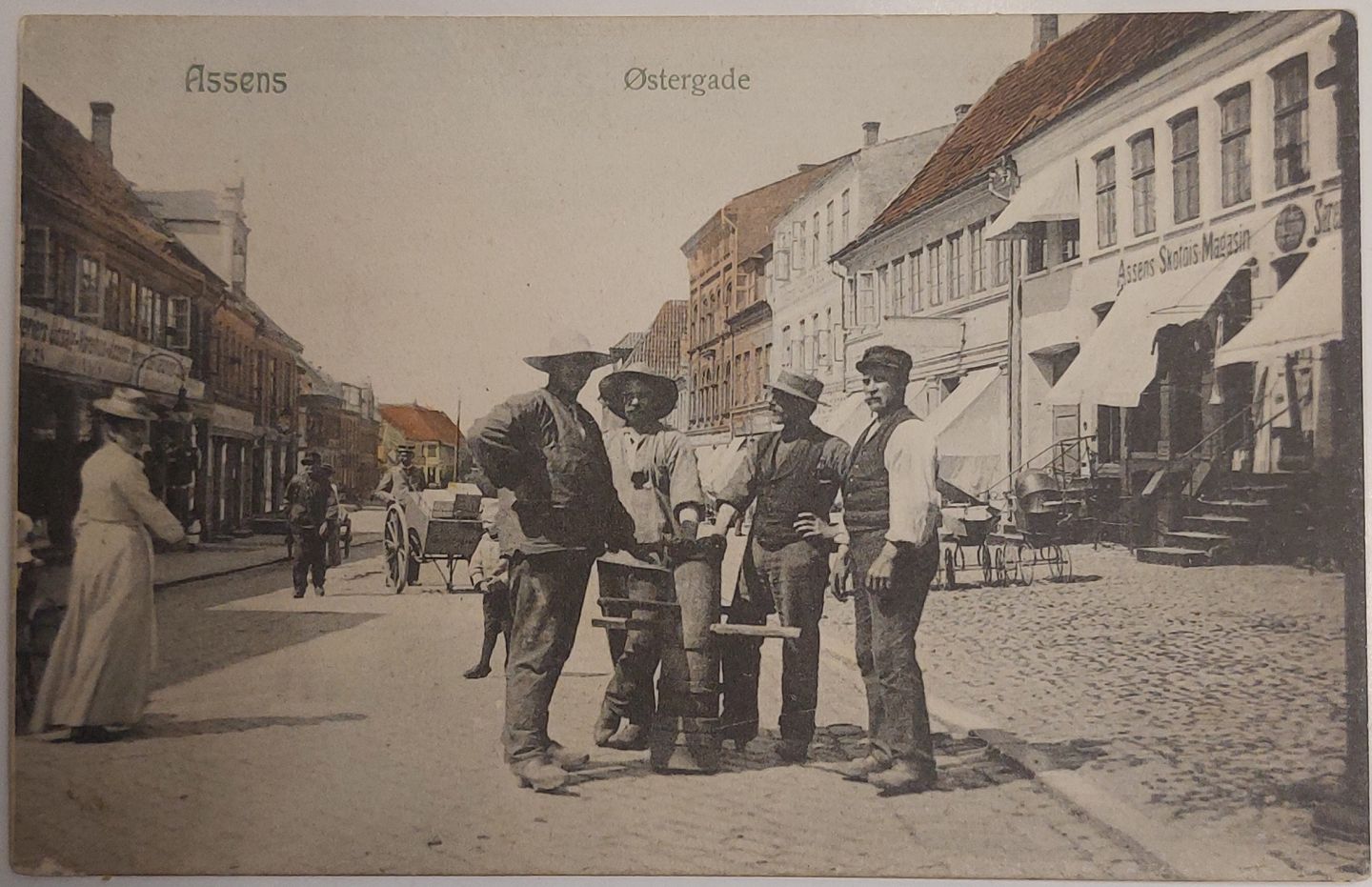 Postkort med motiv fra Østergade i Assens. Arbejdsmænd i Hovedgaden. Brugt men ikke sendt ca. 1910.