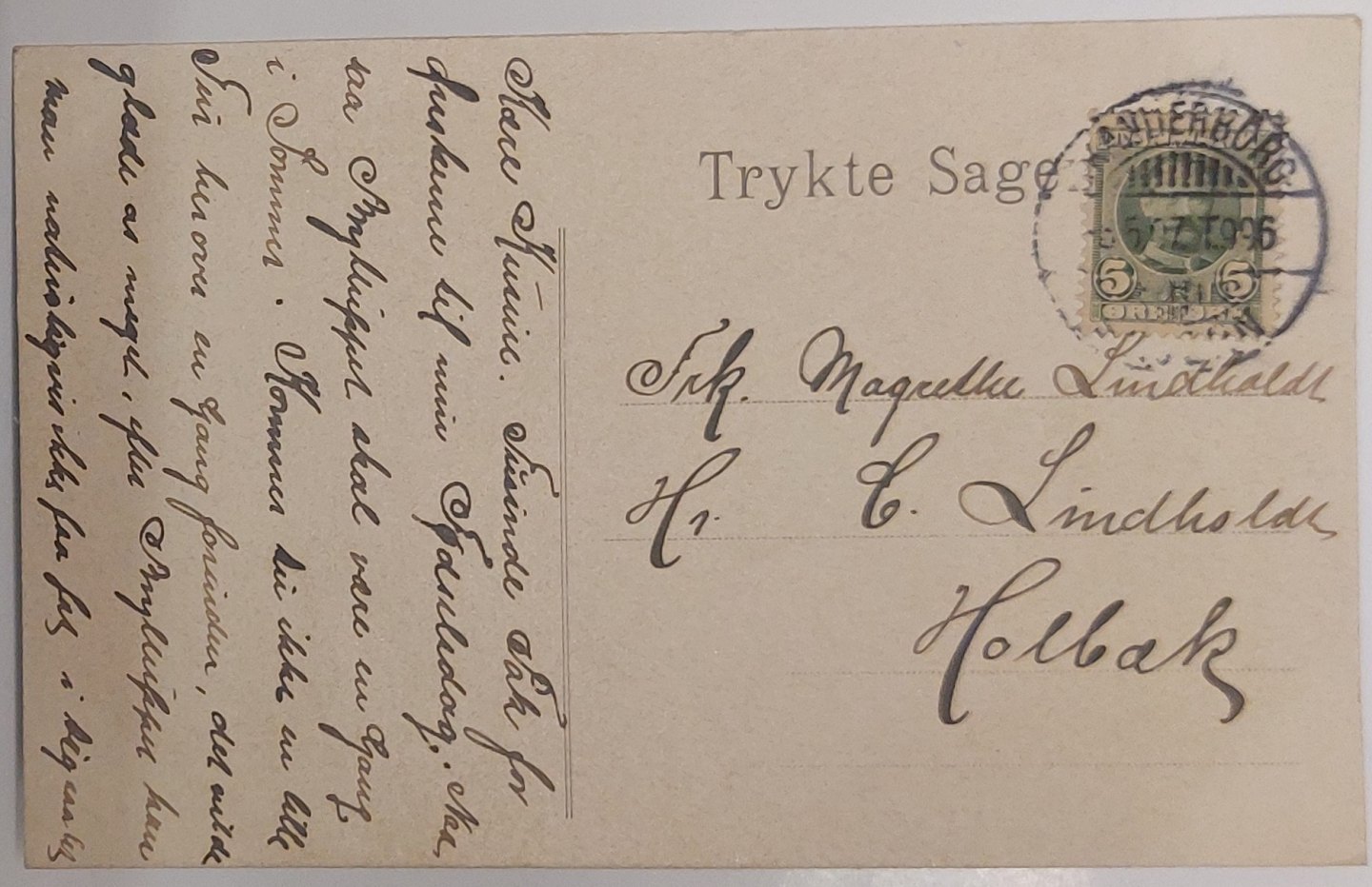Postkort: Motiv med butiksfacade I Bredgade i Herning. Annulleret SKANDERBORG i 1907. I god stand.