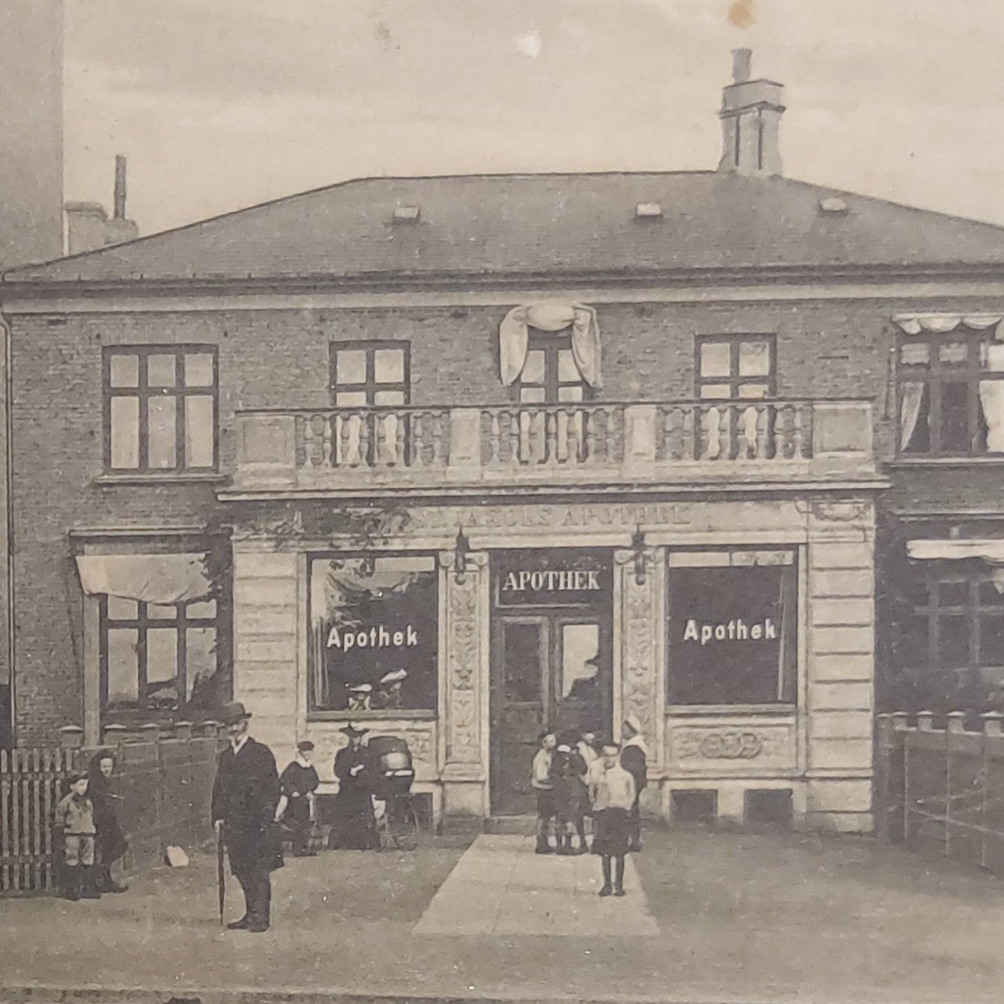 Postkort: Motiv med liv foran Sct. Jakobs Apotek. Annulleret KØBENHAVN I 1906. Brugsspor I hjørnerne.
