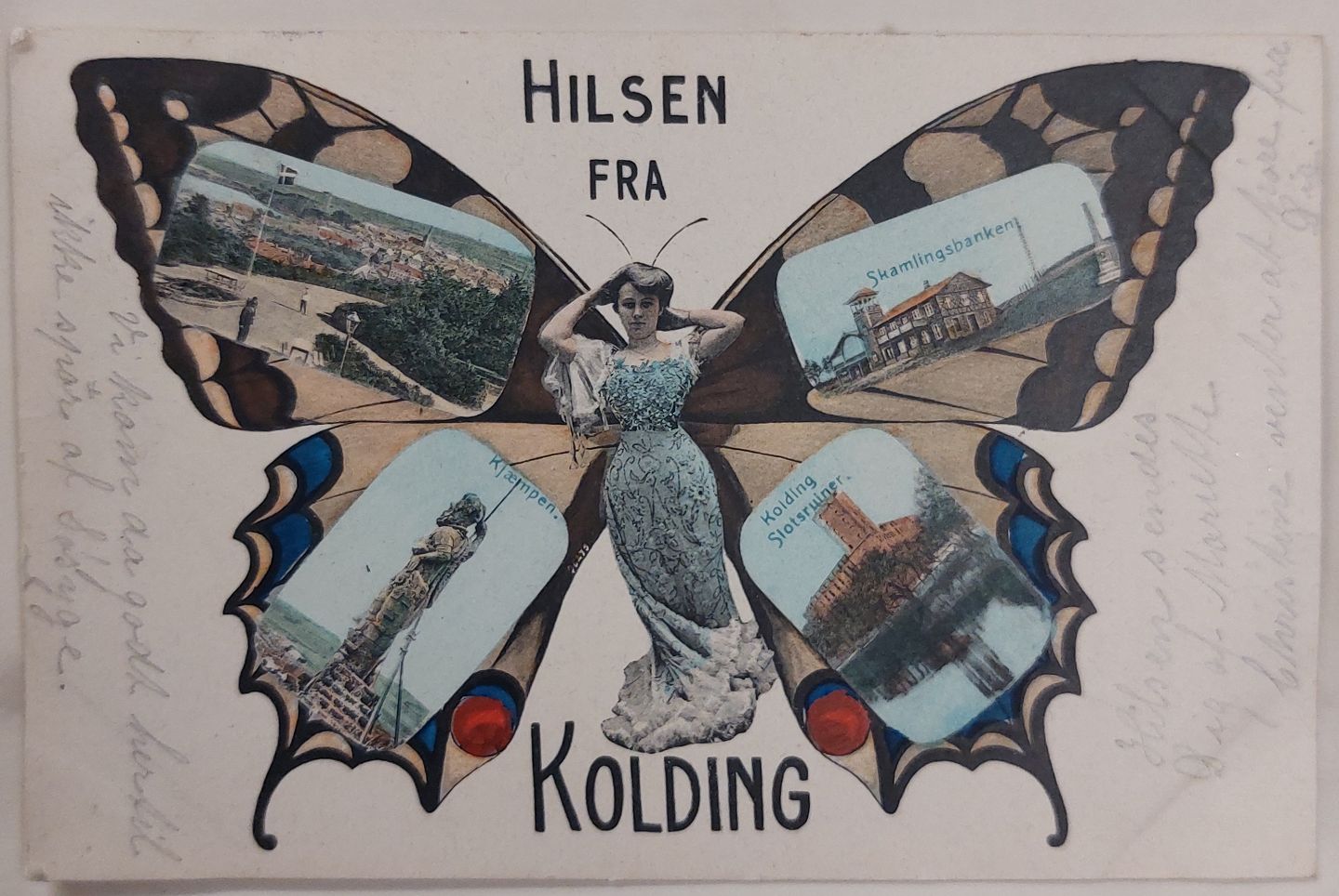 Farvelagt postkort: Hilsen fra Kolding. "Kvindelig sommerfugl" med fire motiver fra Kolding. Annulleret med lapidar KOLDING JB P. E. 9.6.05 TIL HOLBÆK. I god stand