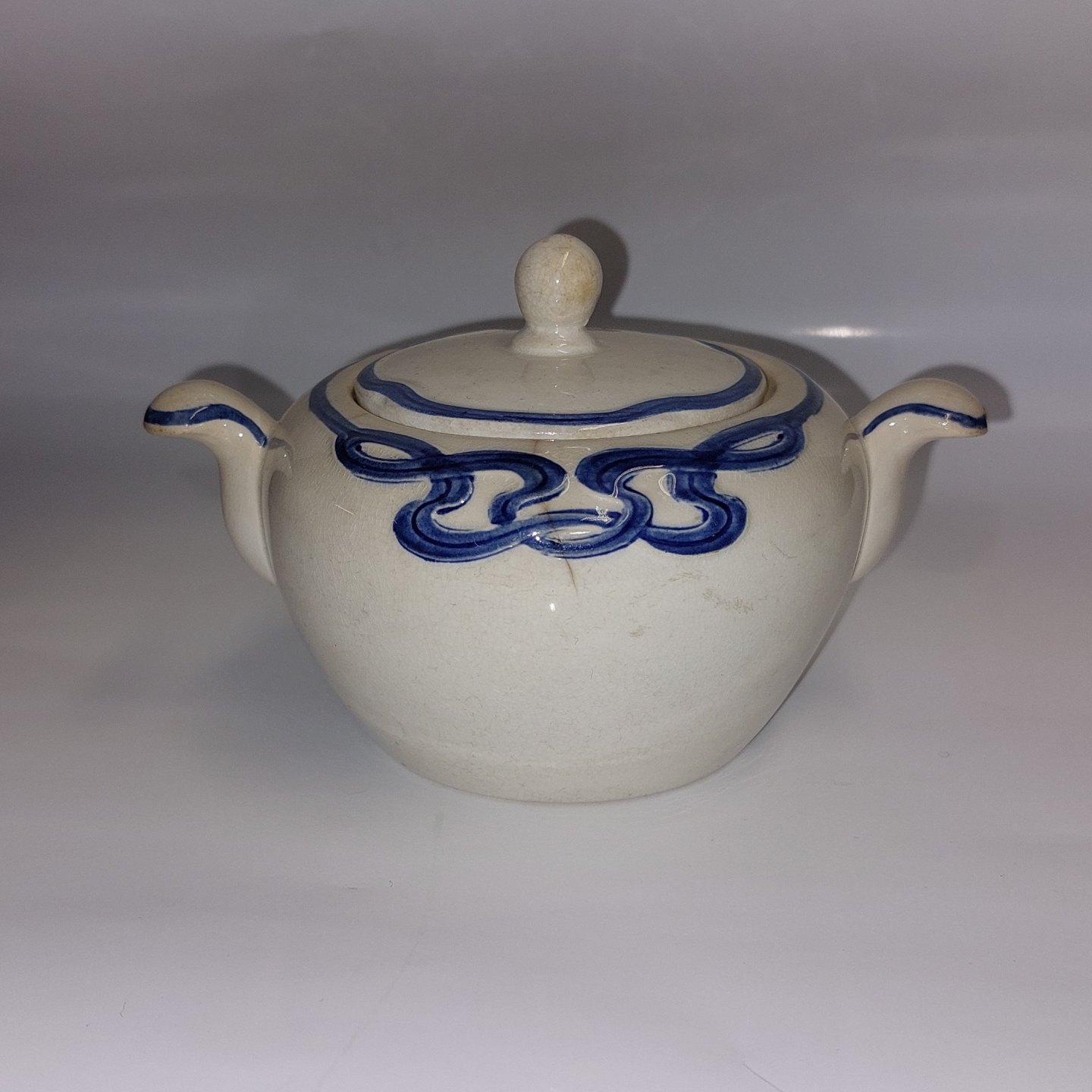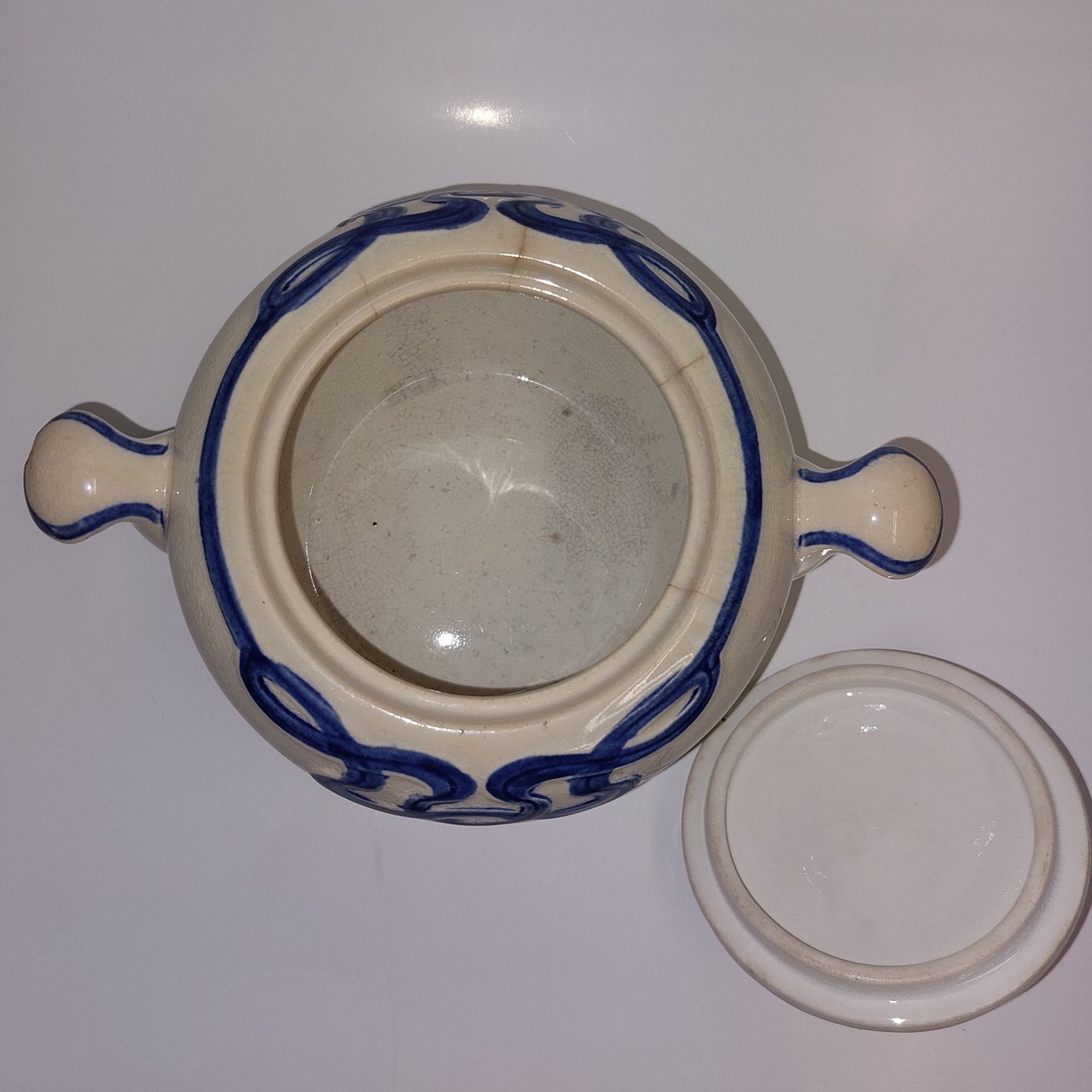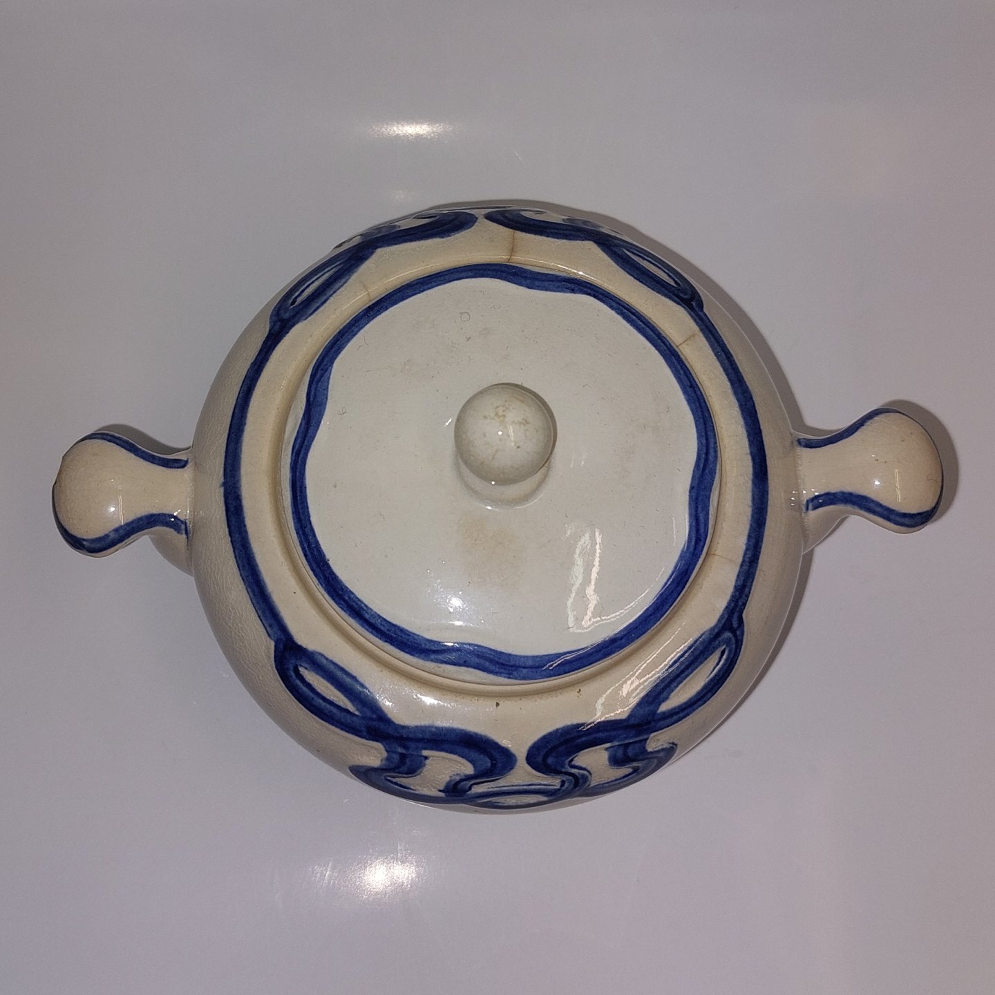 Villeroy & Boch:.Blå Olga sukkerskål med låg. Flere små "hår-revner" ved skålen åbning øverst. Det ene håndtag har et lille skår (se foto). Fabriksmærket på bunden. Mål: H. 10,5 cm Fra øre til Øre 16 cm