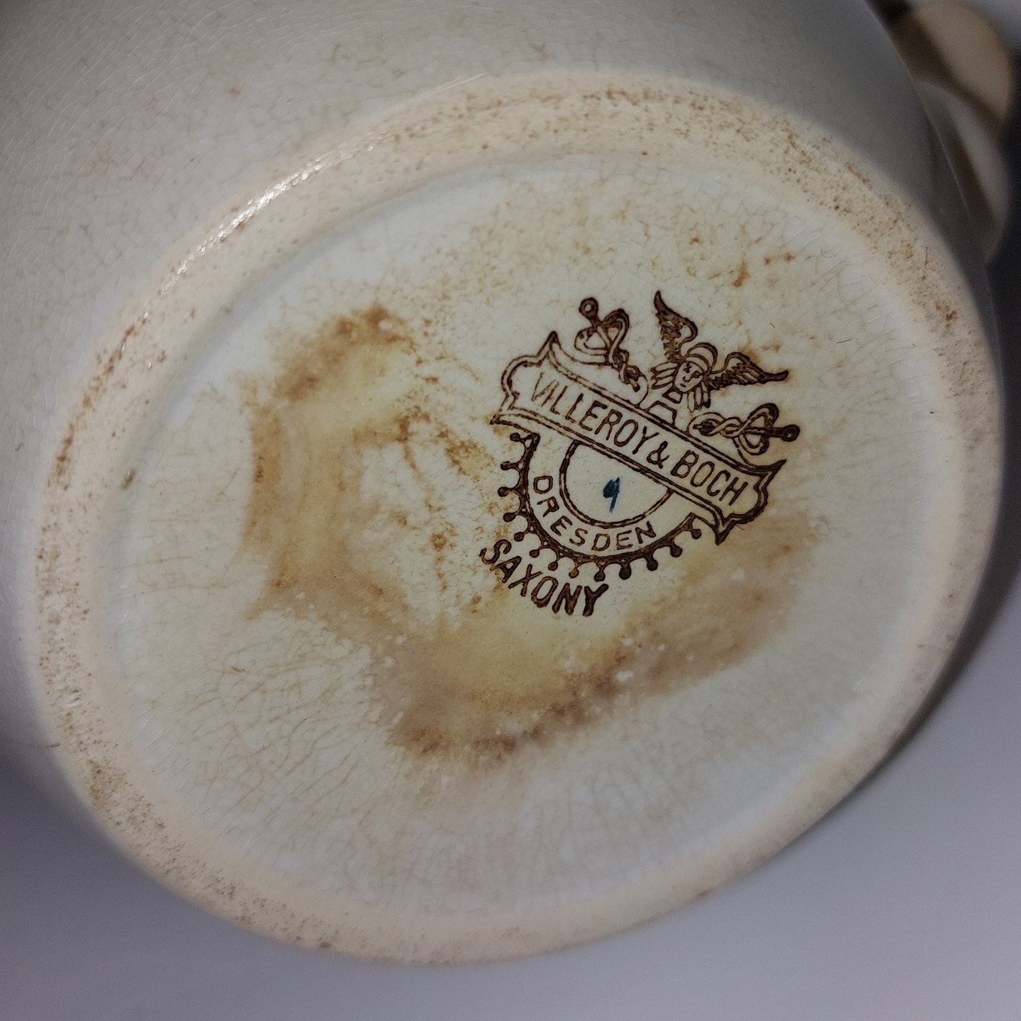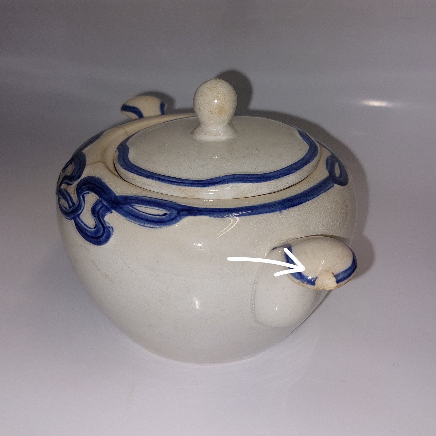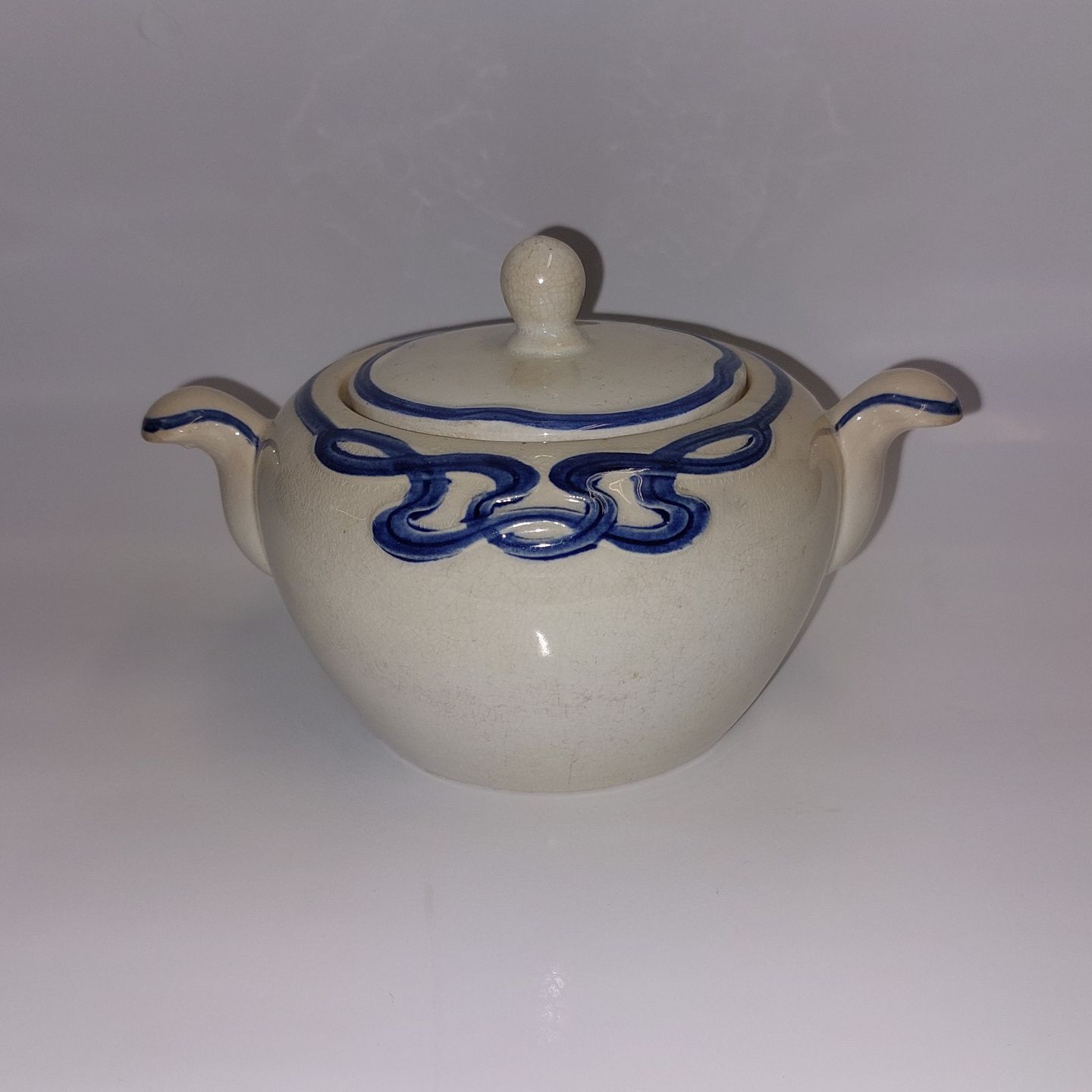Villeroy & Boch:.Blå Olga sukkerskål med låg. Flere små "hår-revner" ved skålen åbning øverst. Det ene håndtag har et lille skår (se foto). Fabriksmærket på bunden. Mål: H. 10,5 cm Fra øre til Øre 16 cm