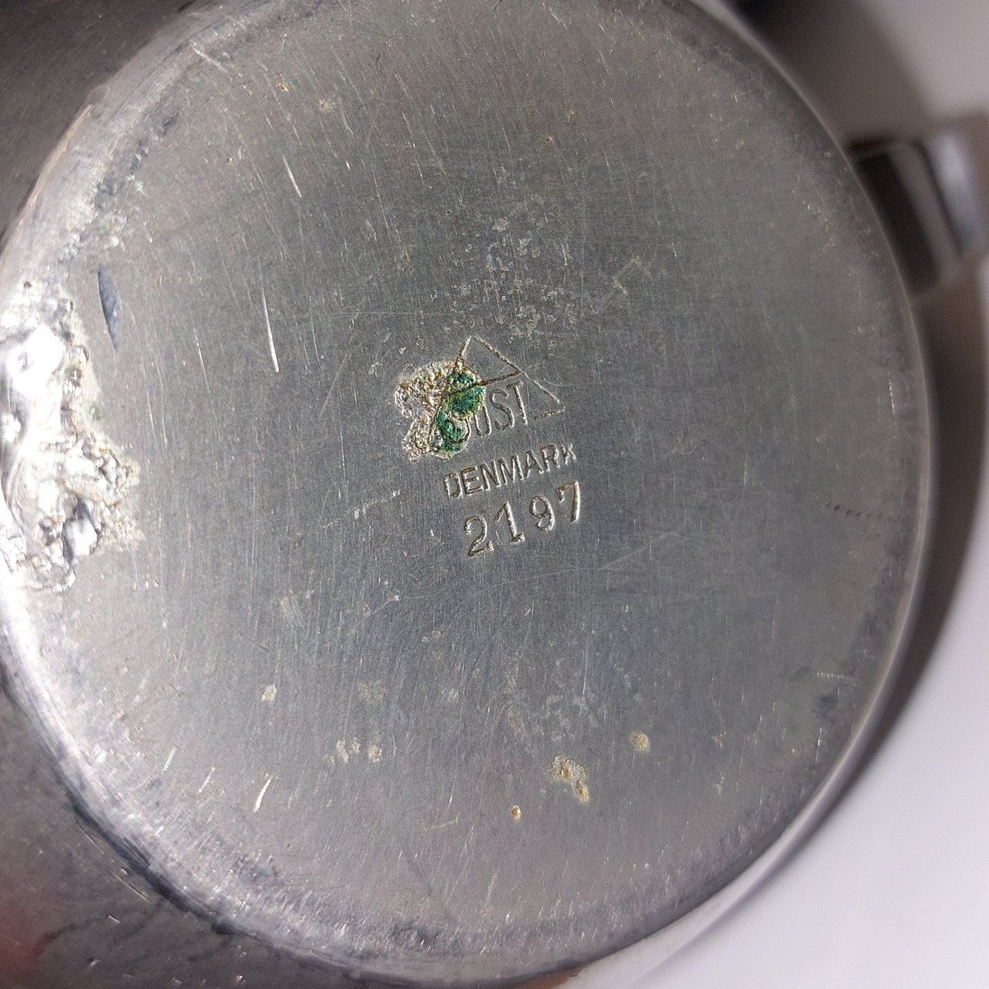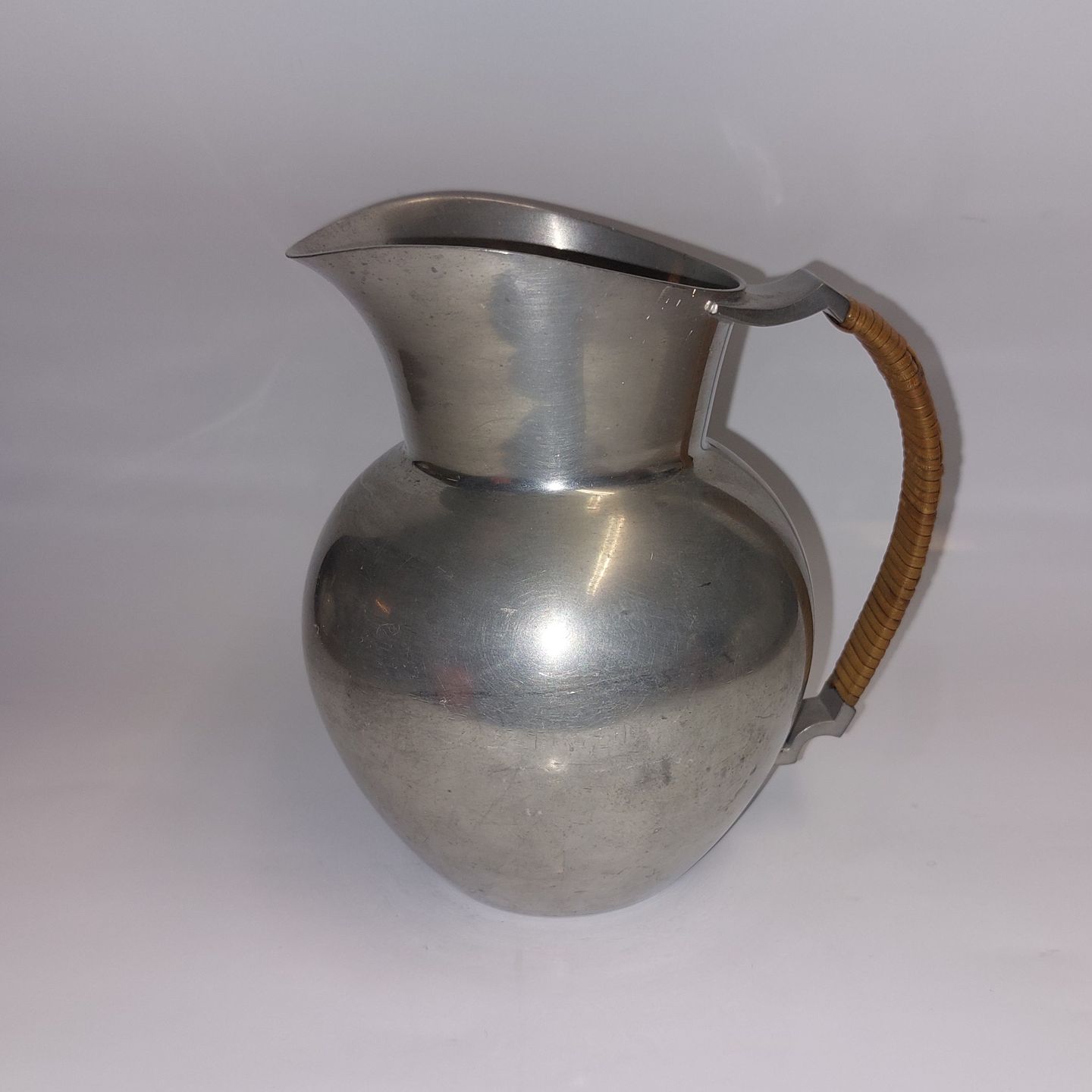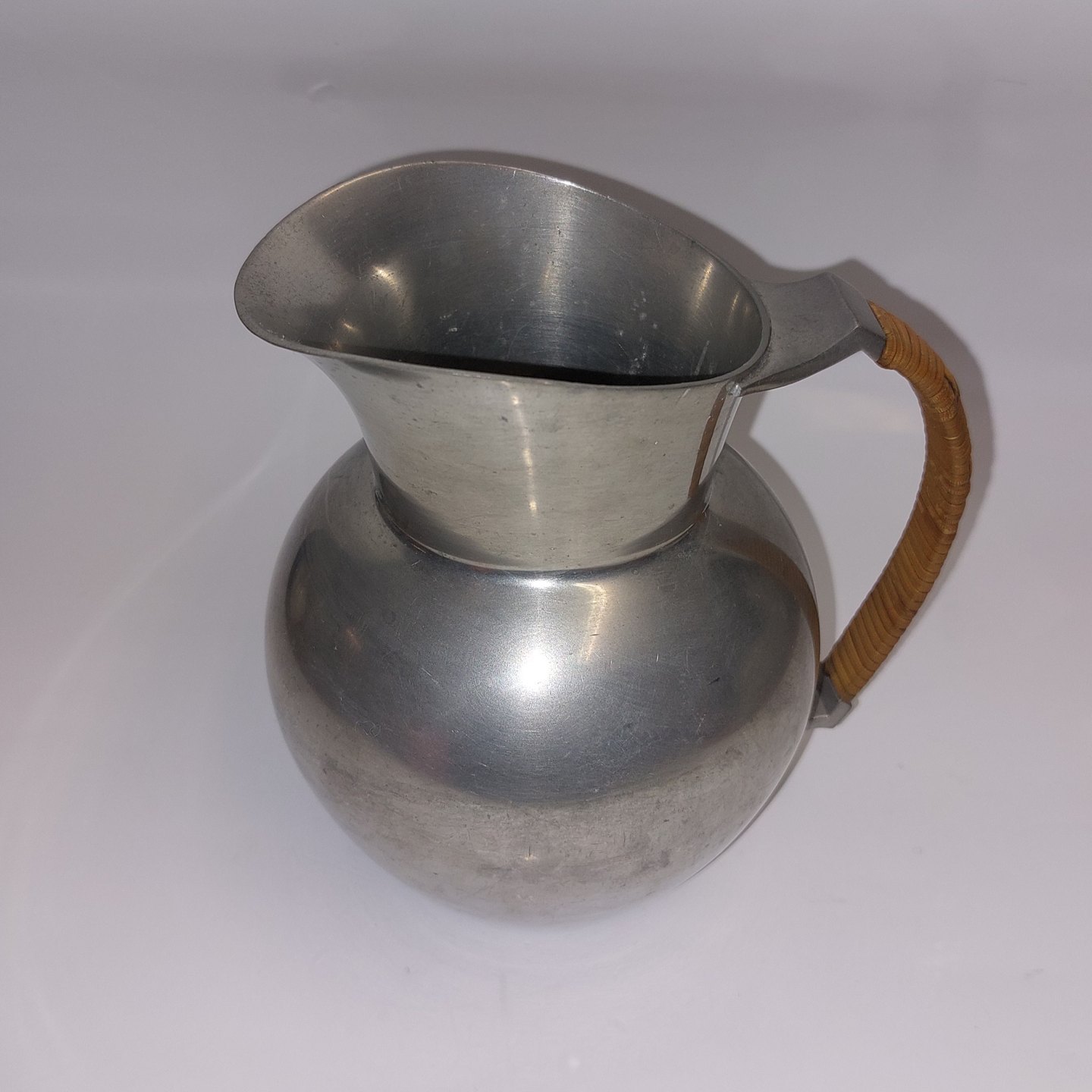 Just Andersen tin: Mælkekande med flettet bambus. I god stand uden skader eller reparationer. Fabriksmærket på bunden. H. 15 cm