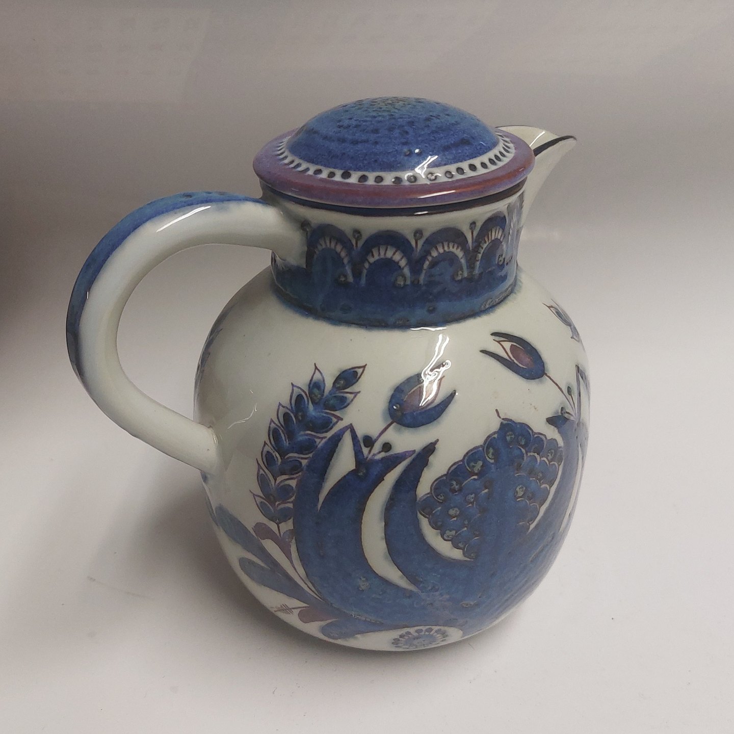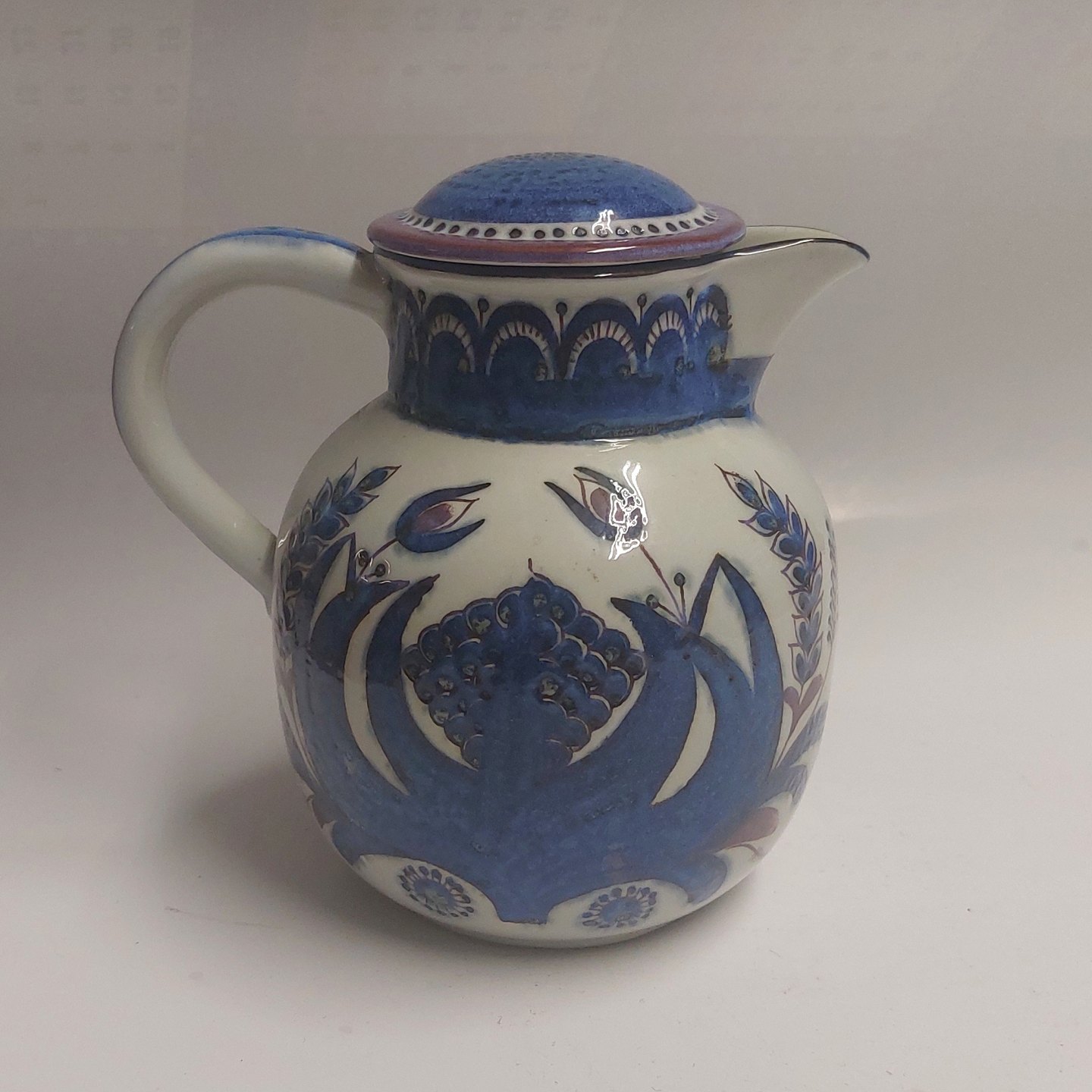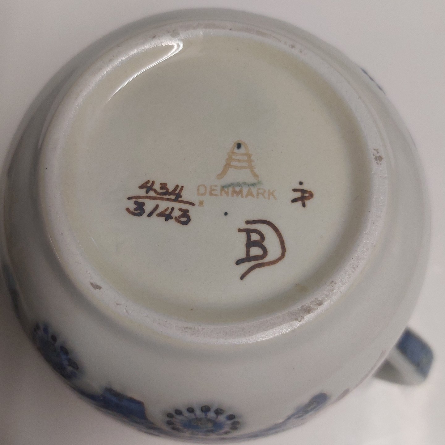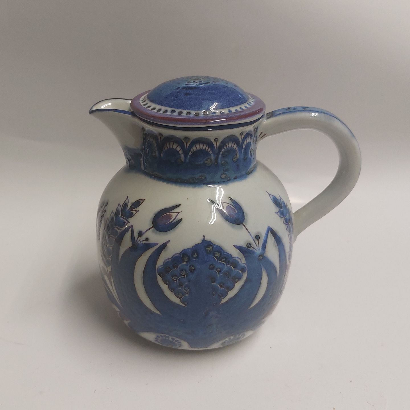 Berte Jessen: Aluminia. tenera kande i fajance. Modelnummer 434/3143. Kande med låg, dekoreret med blå blomster og bladværk. Fremstår I god stand uden skader eller reparationer. 1. sortering. Fabriksmærket på bunden. H. 13,5 cm.