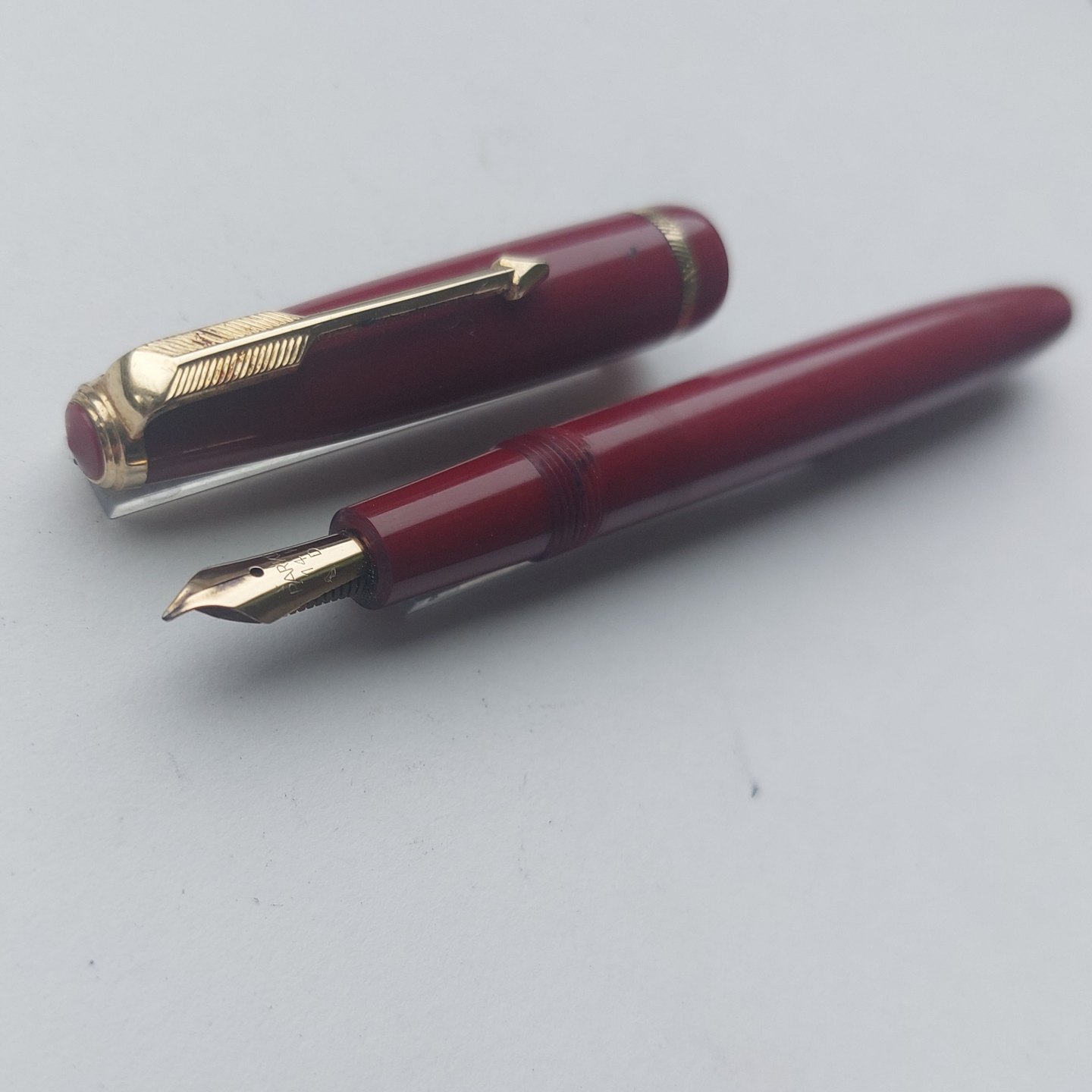 Slank bordeaux Parker Slimfold 6..M.I.D. (Made In Denmark) fyldepen. Fremstillet omkring 1960. Fremstår I god funktionsduelig stand uden skader eller reparationer. Alle dele originale Parker dele. L. 12,7 cm.