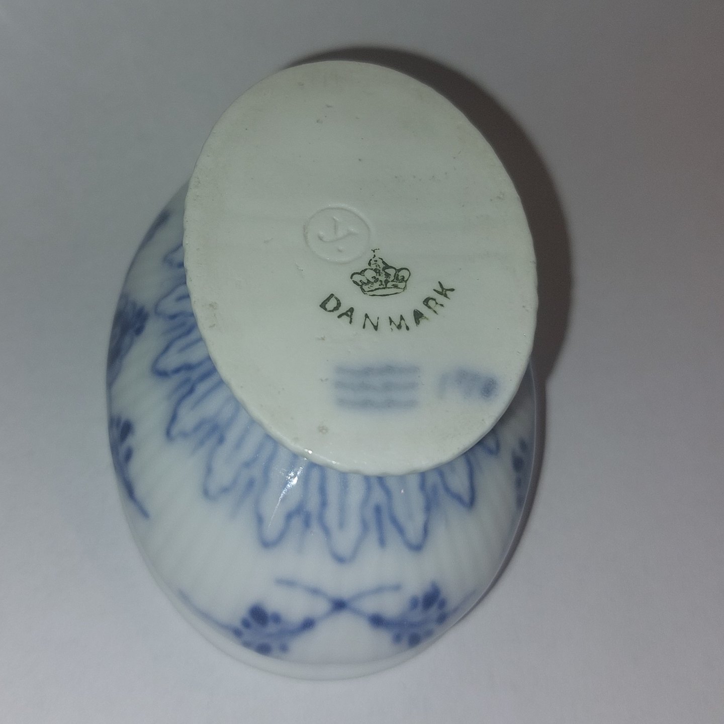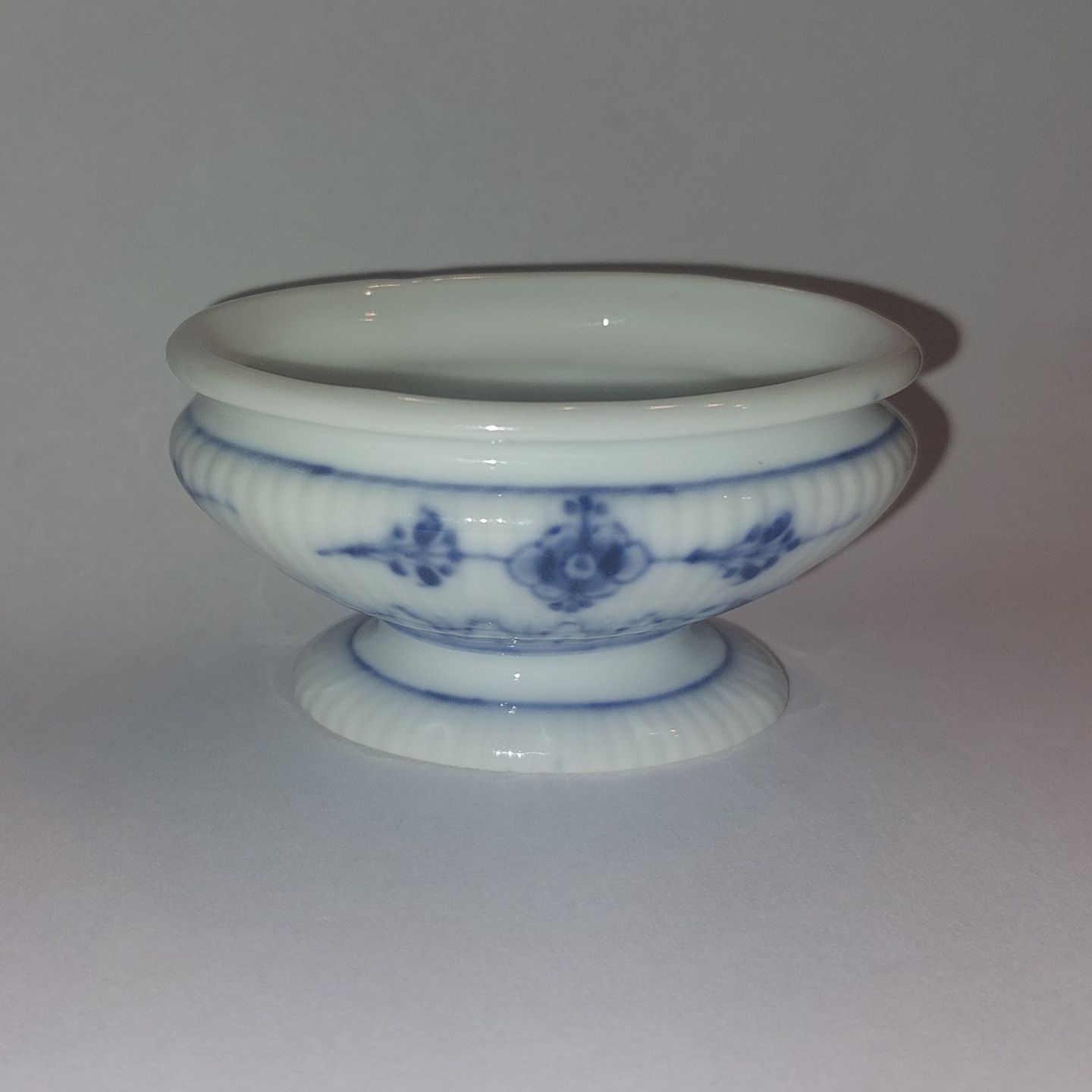 Royal Copenhagen:.Musselmalet saltkar på fod. I perfekt stand uden skader eller reparationer. Fremstillet i slutningen af 1800-tallet. Tilsvar modelnummer 1/196. Fabriksmærket på bunden. Mål: H. 3,5 cm L. 7,5 cm