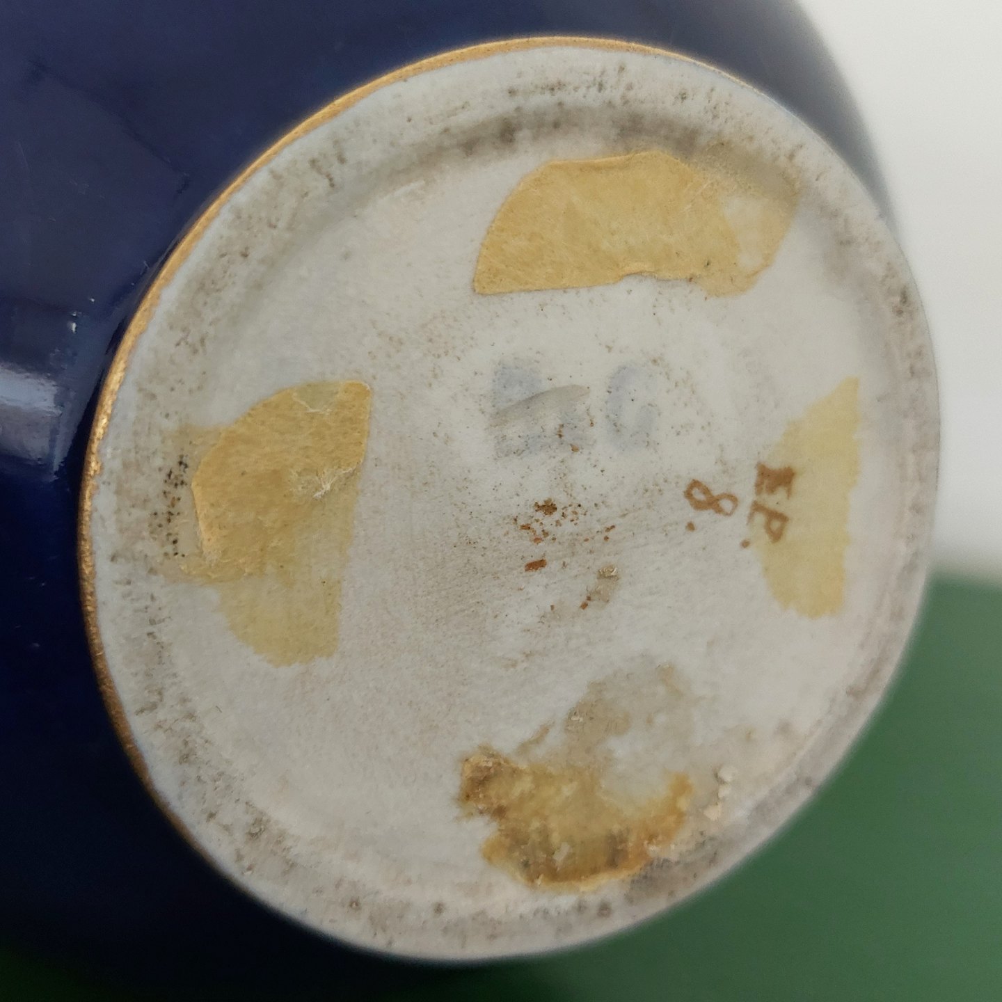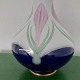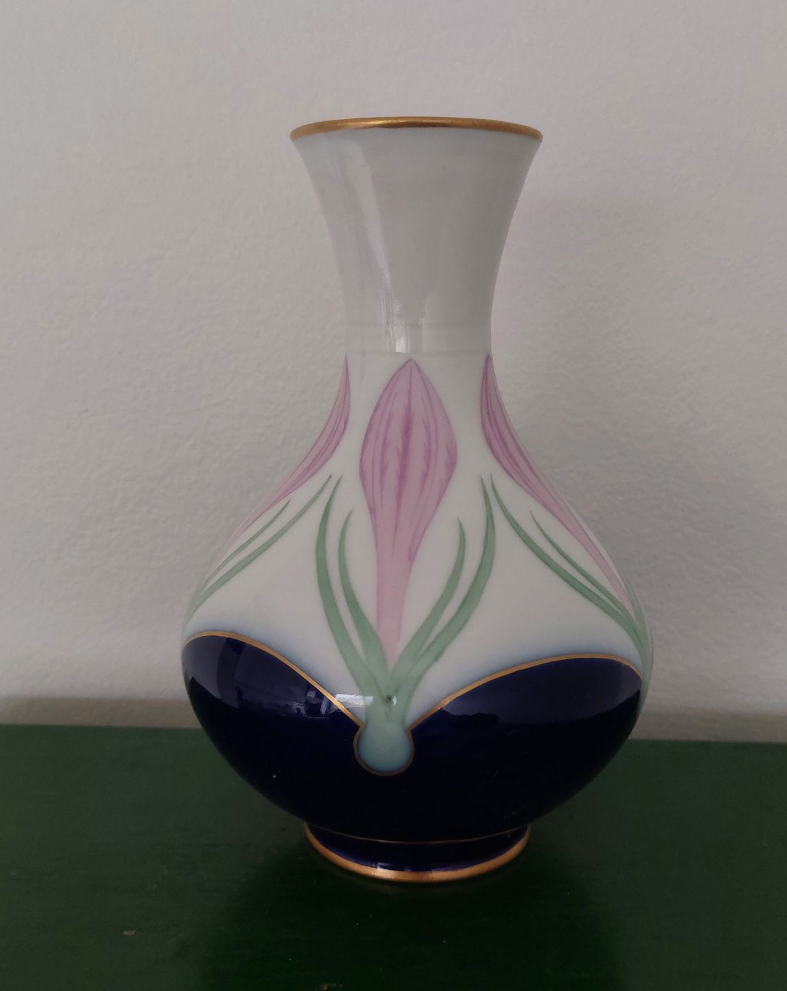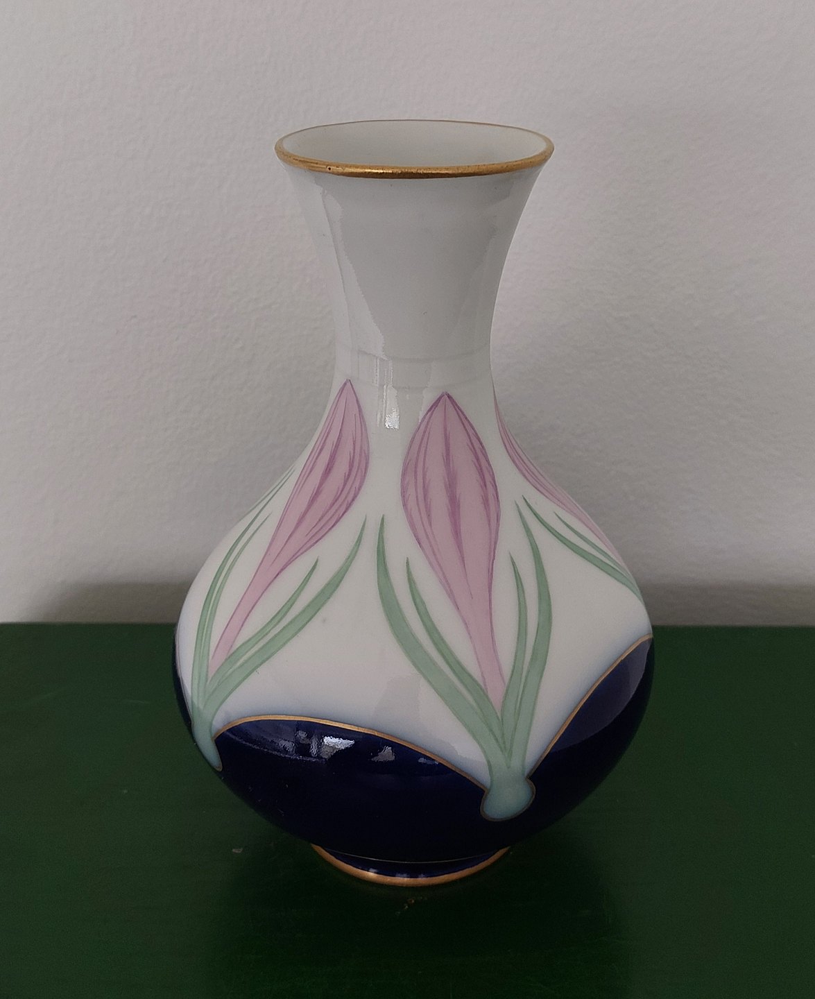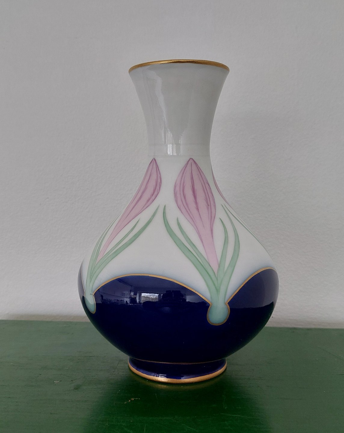 Vase I porcelæn fra Bing & Grøndahl med dekoration I skønvirkestil. Fremstillet I slutningen af 1890'erne. Mindre "nålestik" I overfladen (se den hvide pil). Smart dækket under dekorationen, så fejlen nærmest passer til dekorationen. Ingen skader eller reparationer. Fabriksmærket på bunden med B&G i blåt. H. 19,5 cm
