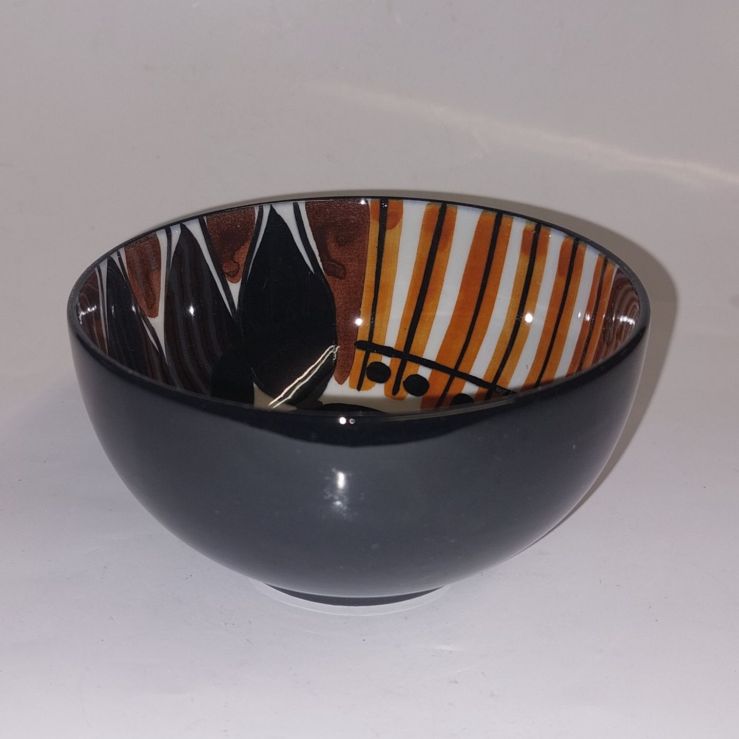 Skål i fajance fra Royal Copenhagen. Farverig dekoration indvendigt sort på ydersiden. Designet af Inge-Lise Kofoed. 1. sortering. I god stand uden skader eller reparationer. Fabriksmærket på bunden. Modelnummer 184 / 2186