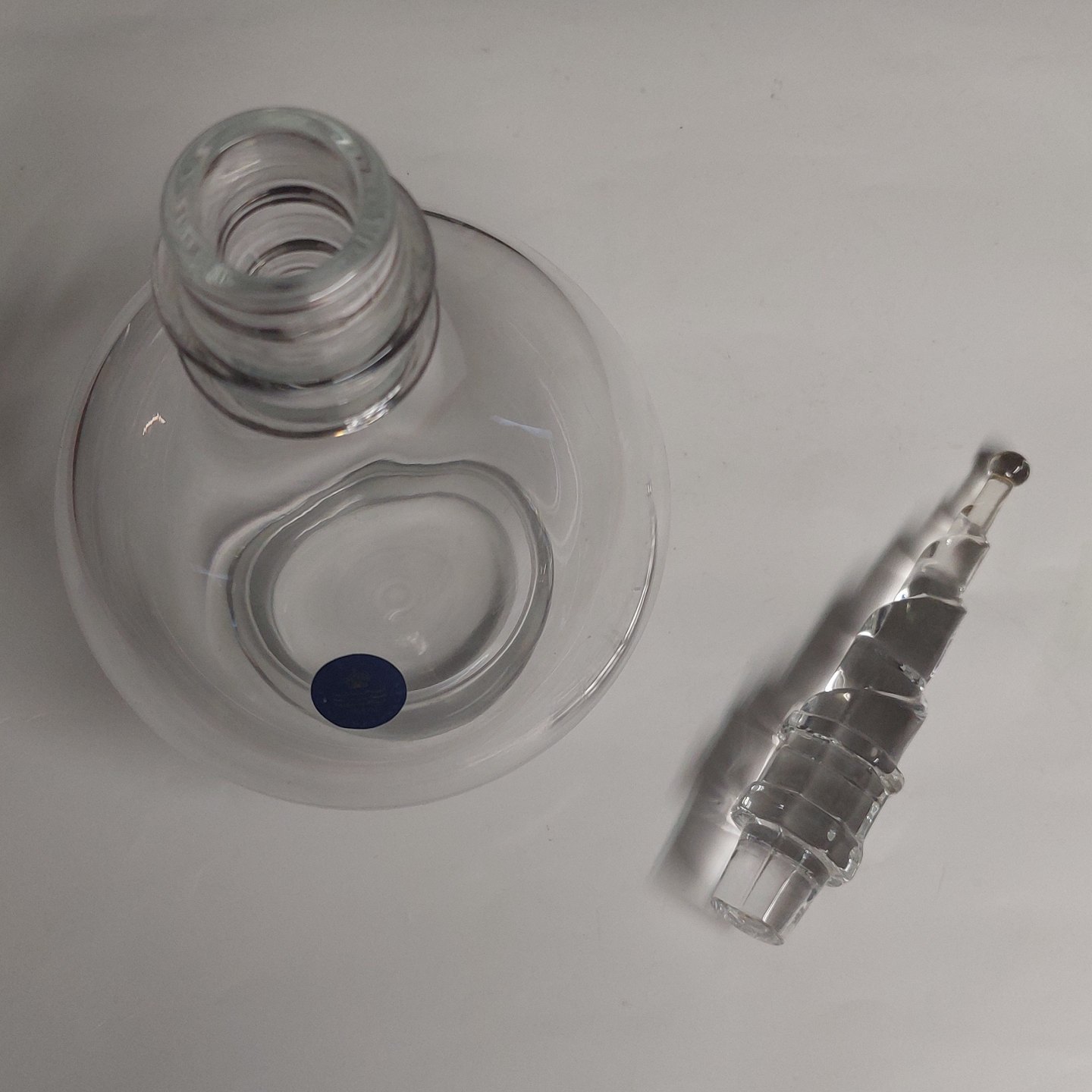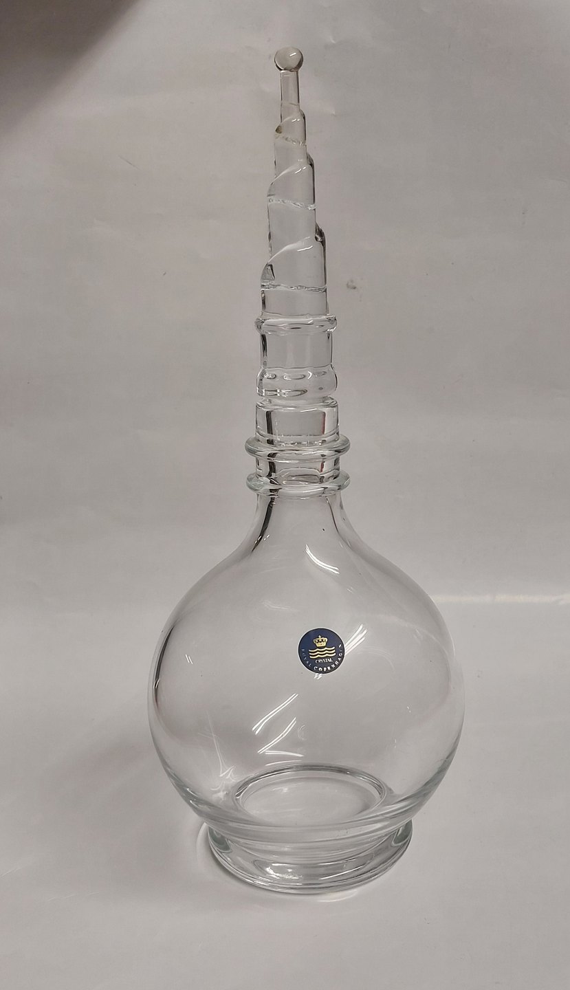 Karaffel i glss fra serien Byens Tårne, "Vor frelser Kirke". Rund kugleformet karaffel i glas med prop af "Vor Frelser Kirkes" spir. På siden ses Royal Copenhagens label,. H. 30 cm