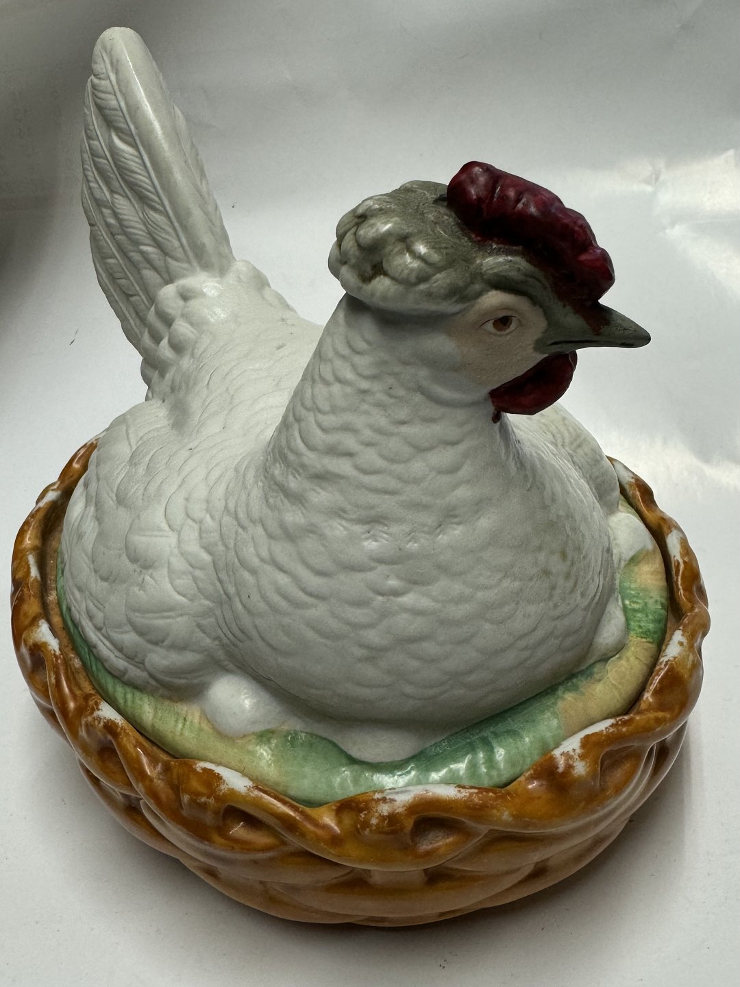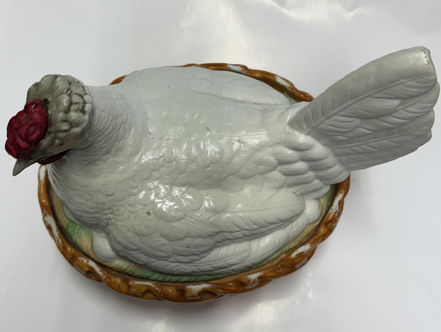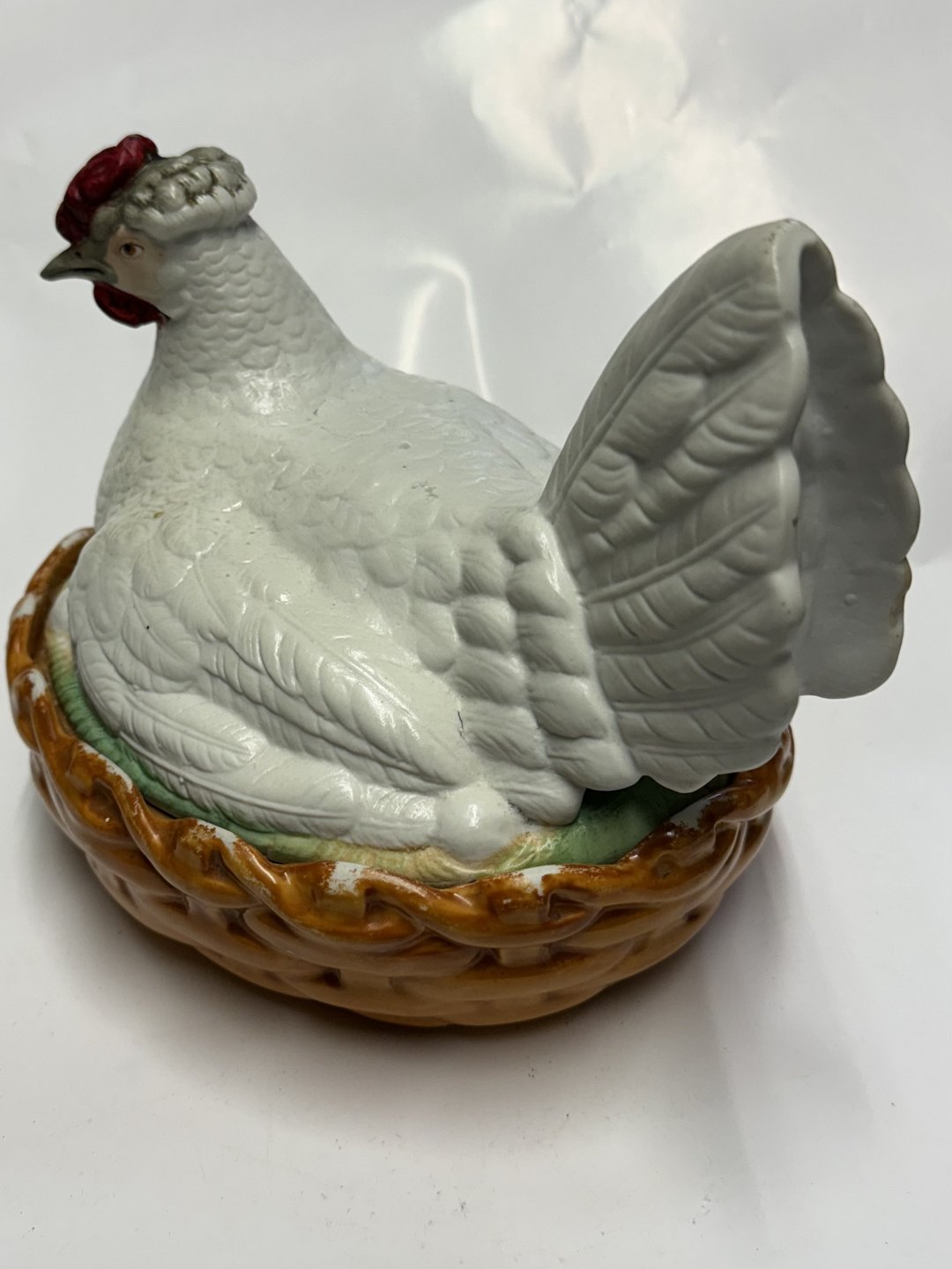 Bemalet bisquit høne fra slutningen af 19. Århundrede. I to dele. Underdel/skål. Overdel/låg i form af den liggende høne. I god stand. Ingen særlige brugsspor. Smuk patina på overfladen. Mål: 17,5 høj og 23 cm lang.