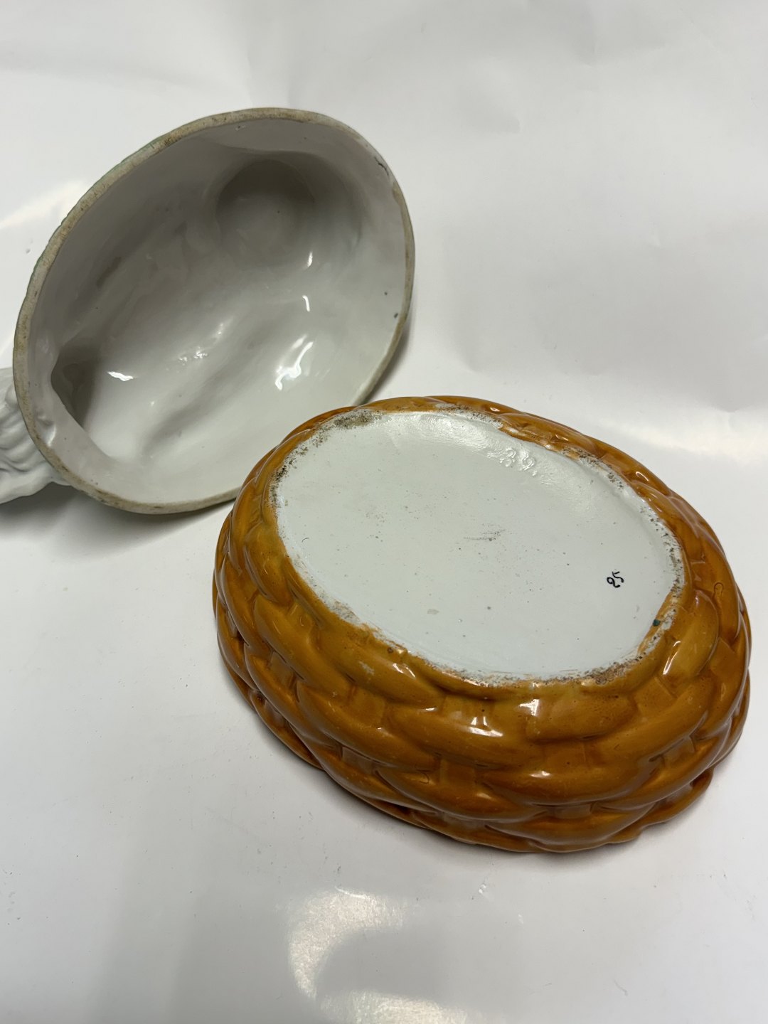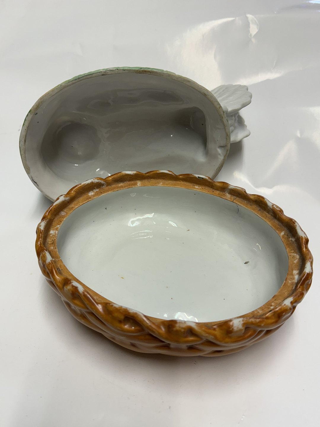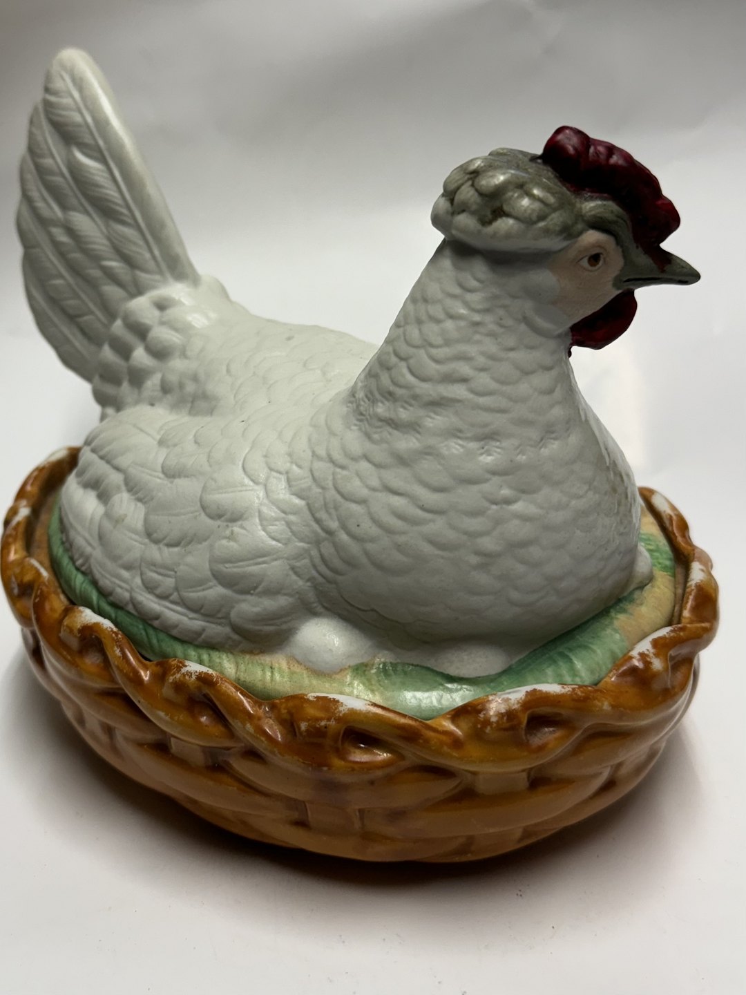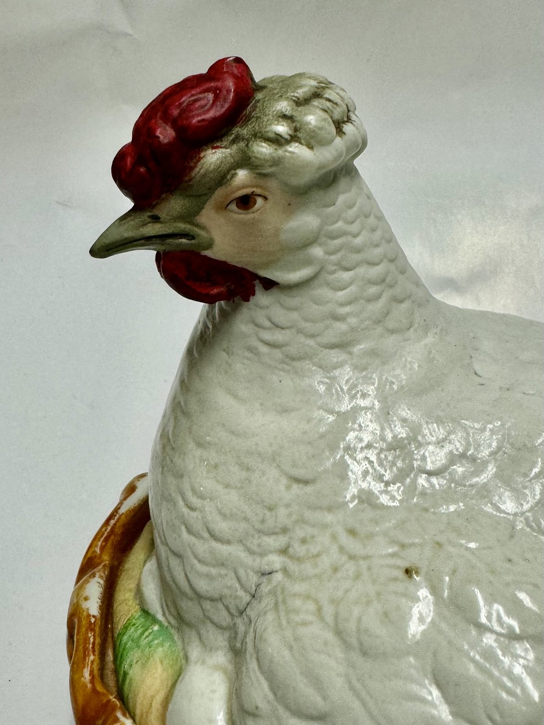 Bemalet bisquit høne fra slutningen af 19. Århundrede. I to dele. Underdel/skål. Overdel/låg i form af den liggende høne. I god stand. Ingen særlige brugsspor. Smuk patina på overfladen. Mål: 17,5 høj og 23 cm lang.