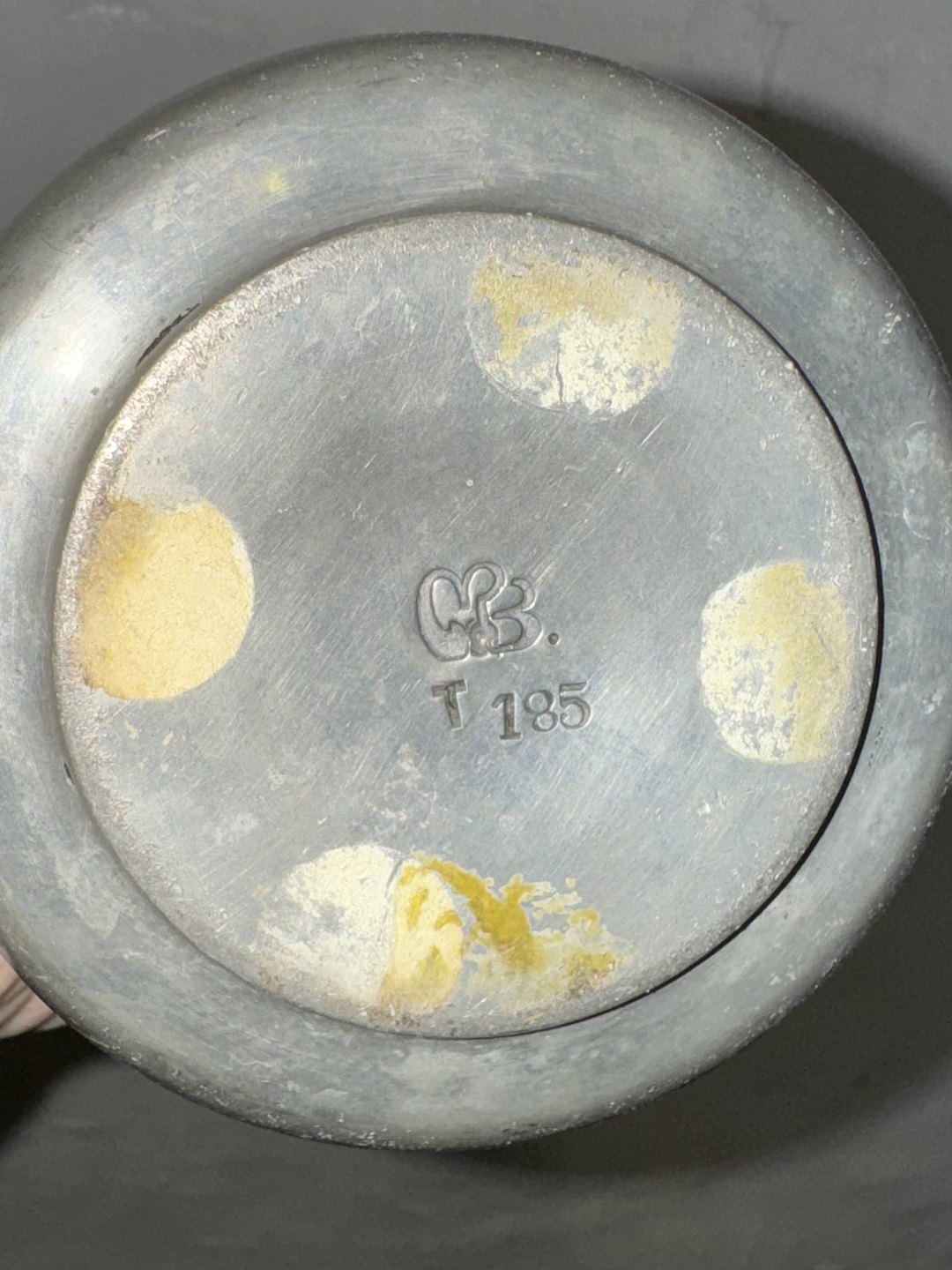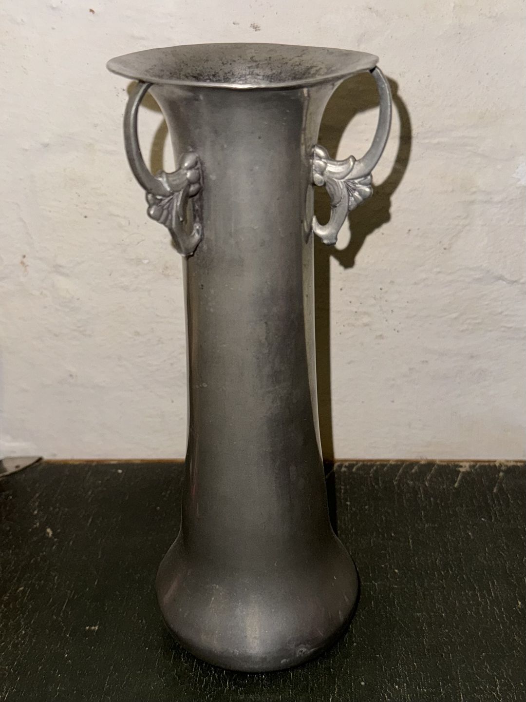 Vase med hanke i tin. Fremstillet hos Mogens Ballin omkring 1900. Ingos stand. Fabeiksmærket på bunden. H. 24 cm