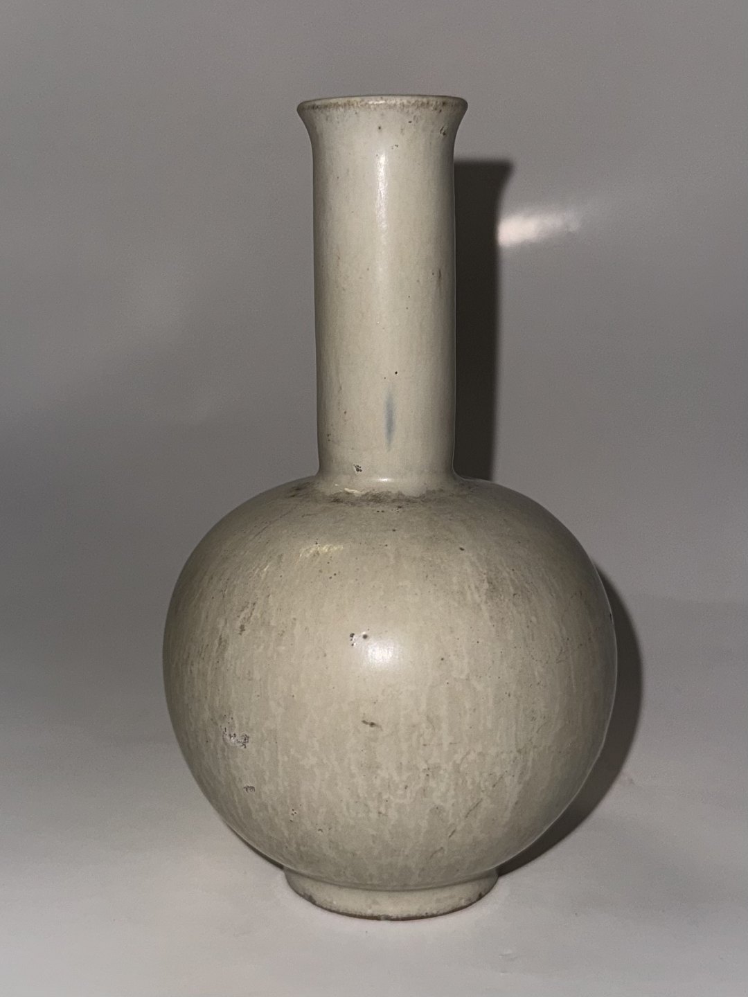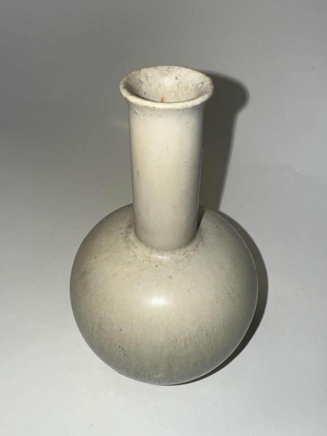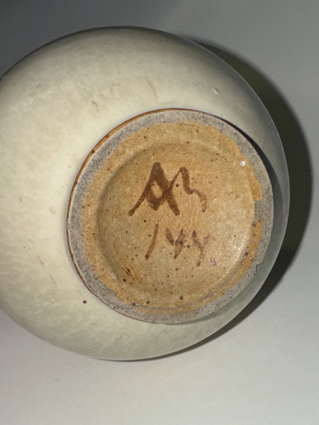 Vase i keramik fra Arne Bang. Rund krop og lang hals. Dækket af en lys creme glasur. I fin stand. Fabriksmærket med kunstner-monogram på bunden. H. 15,5 cm.