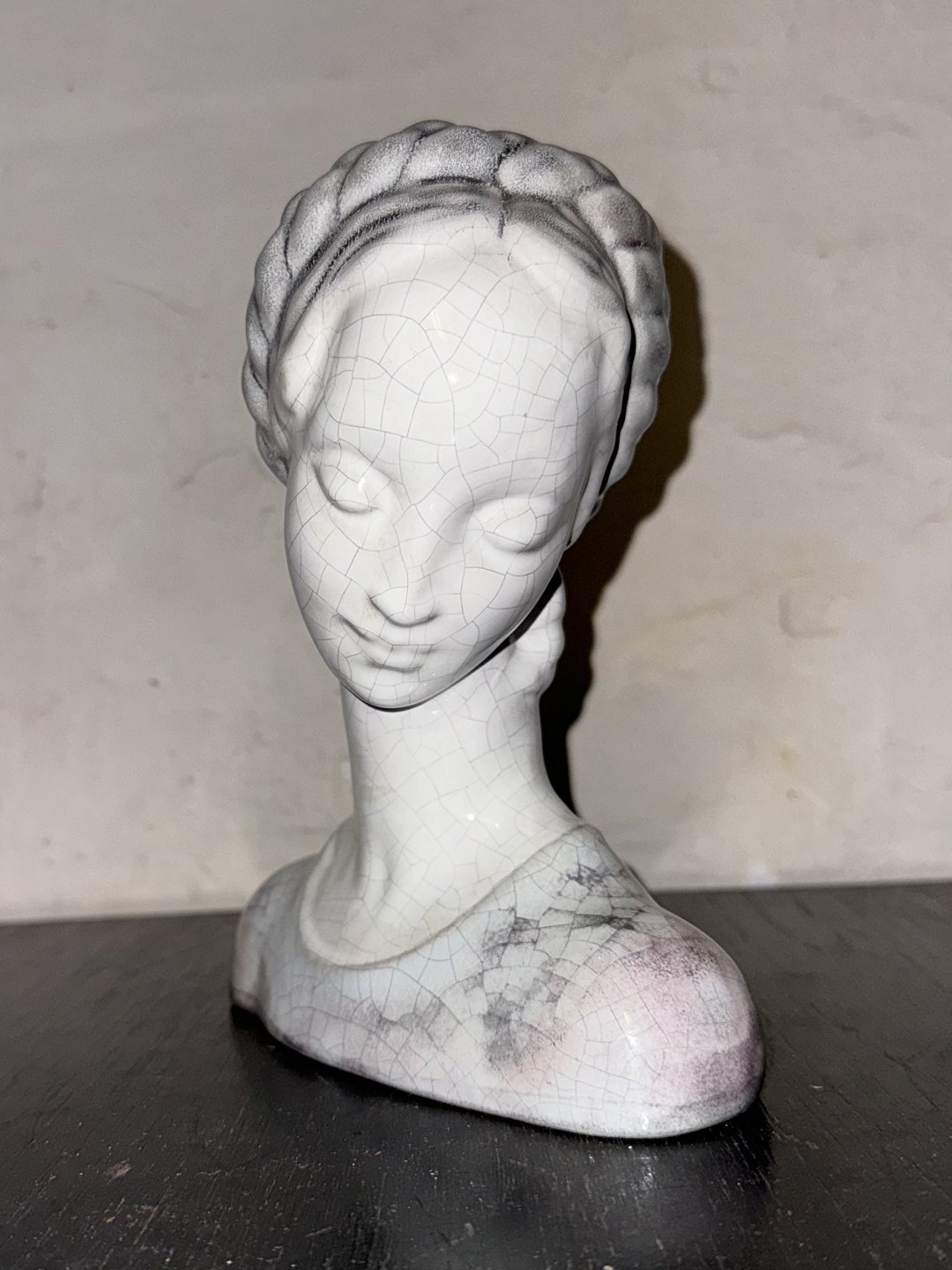 Buste af kvinde i keramik. Fremstillet hos Michael Andersen & Søn. Dækket i persisk-glasur. Fabriksmærket på bunden. Mål: H. 19,5 cm L. 16,2 cm