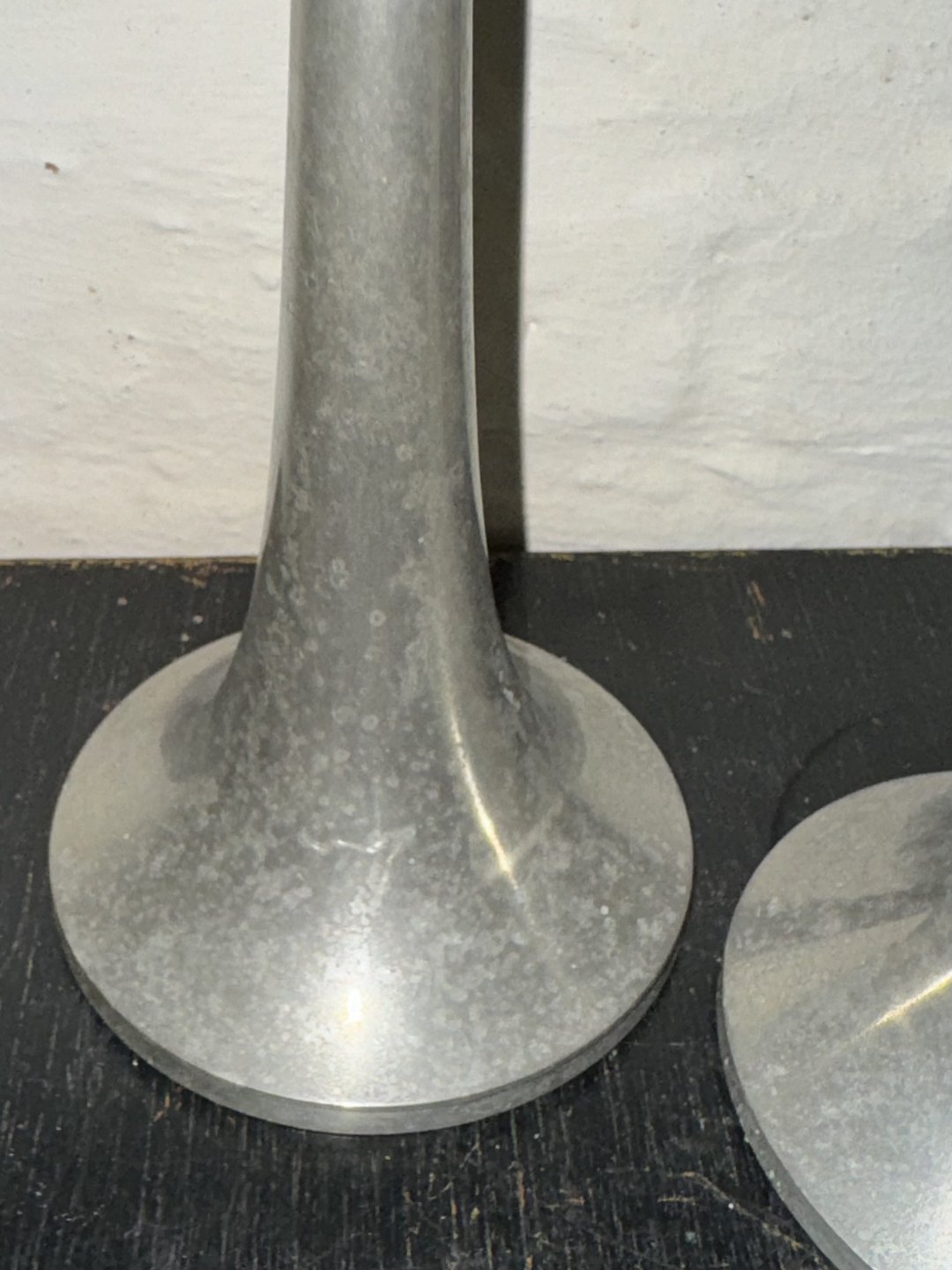 Par trompet-formede lysestager i tin fra Just Andersen fabrikken. Danmark i 1950’erne. Overfladen anløbet. Ellers intet at bemærke. Fabriksmærkede på bunden. H. 22 cm