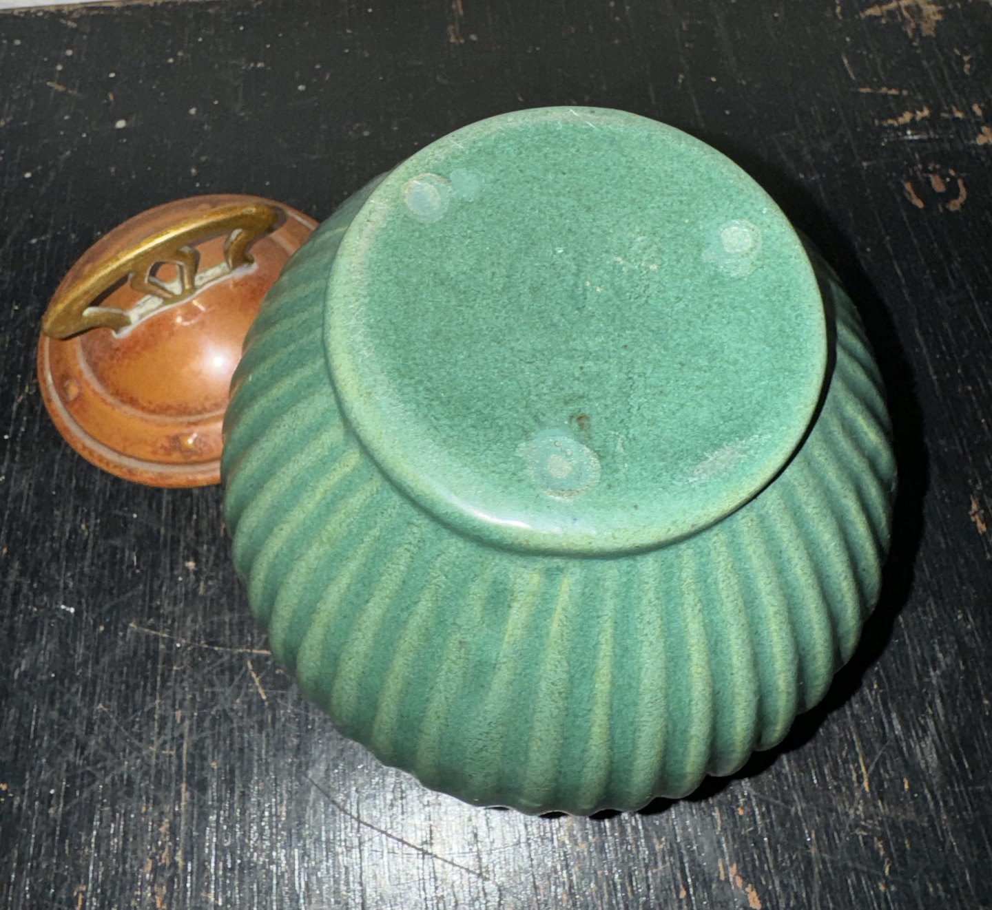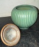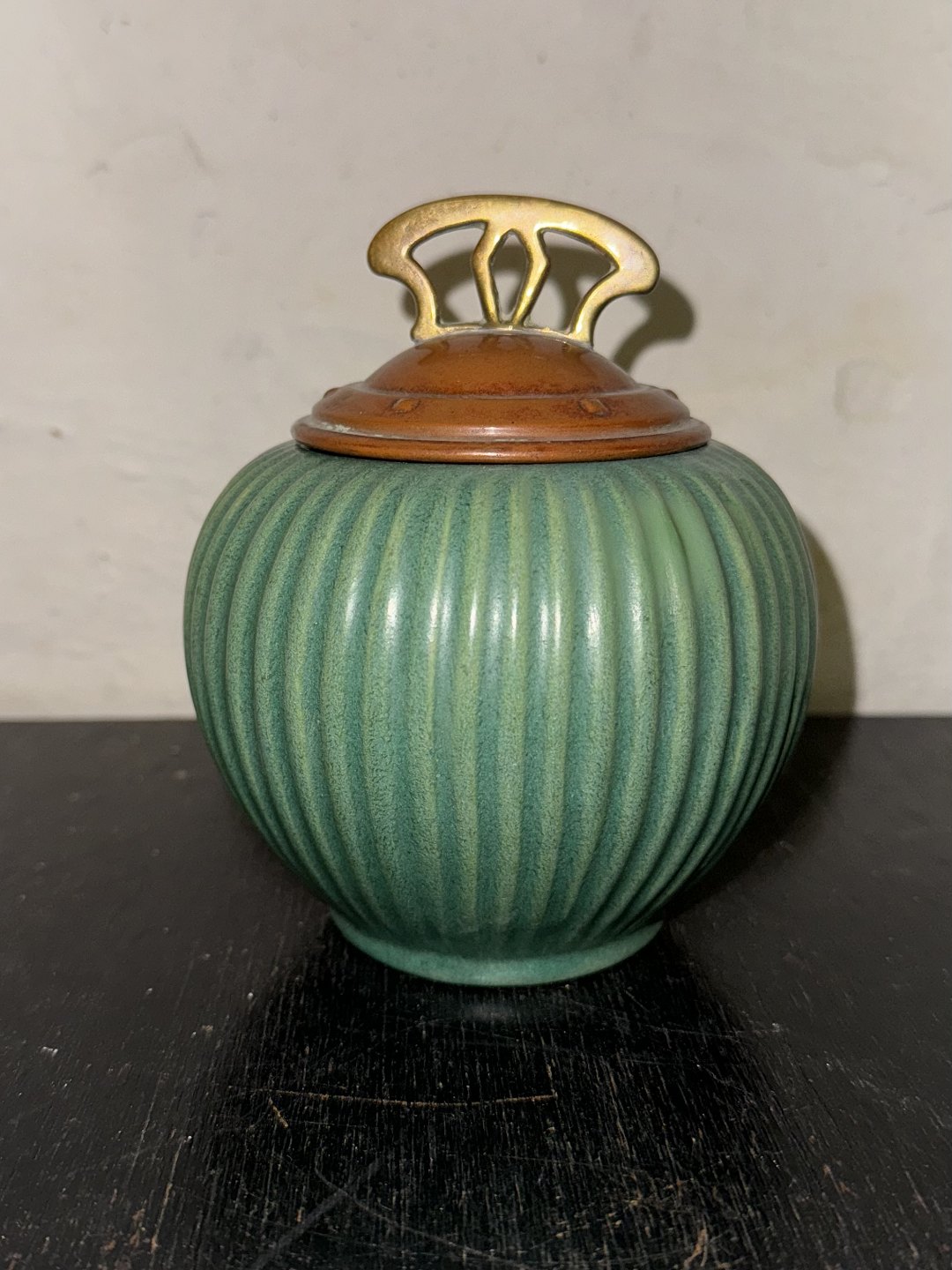 Grøn krukke med riller i keramik fra Michael Andersen & Søn. På toppen af krukken et låg i metal. Begge dele i god stand. Krukken fabriksmærket på bunden med det velkendte logo . Rønne’s byvåben. Mål: H. 14,3 cm incl. låg
