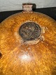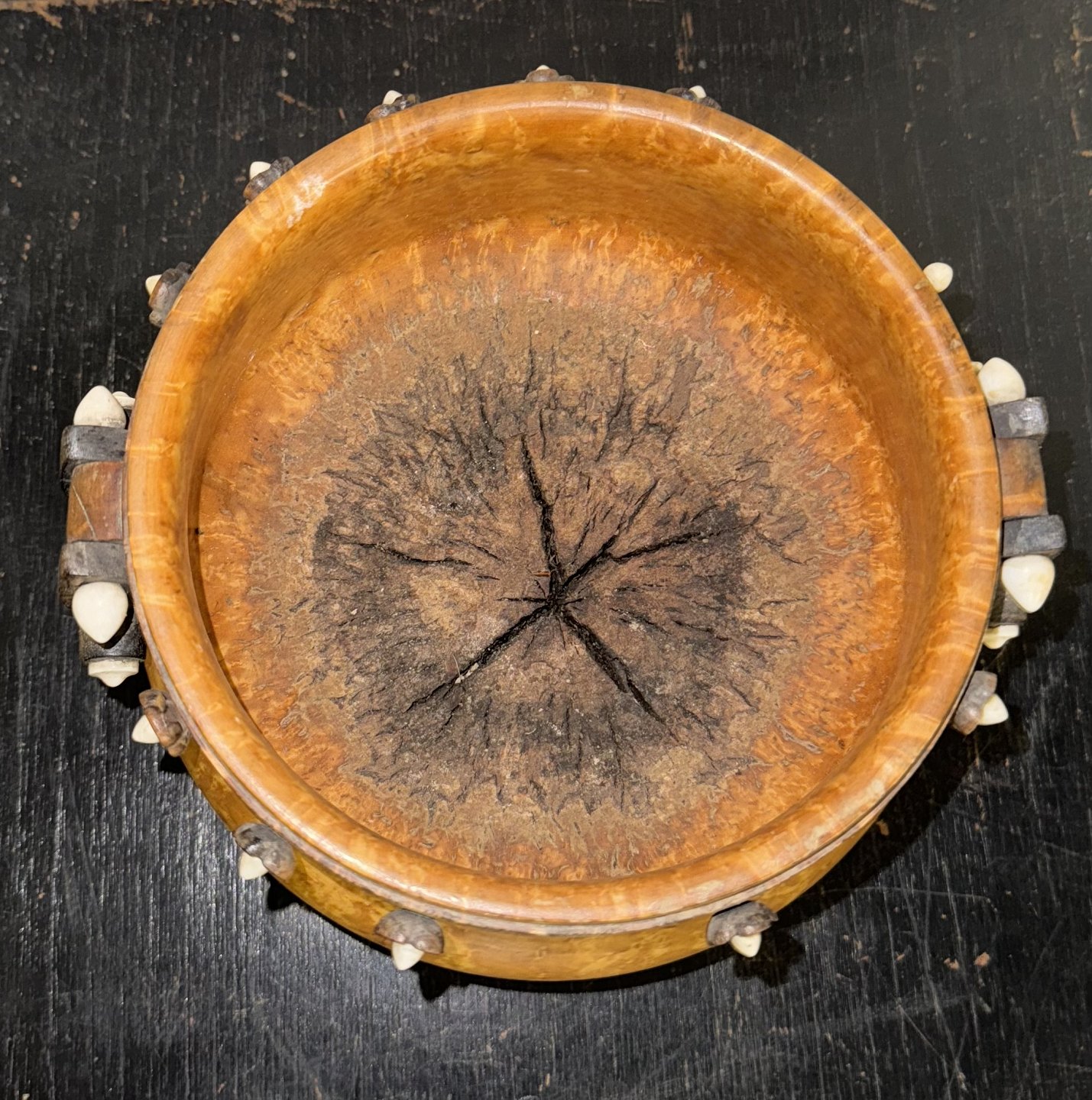 Skål på tre ben i Masur Birk. Formodes fremstillet i Norge i 19. århundrede. Dekoreret med hank samt med ben-perler som blomster rund i kanten. Flere dog forsvundet. Alderrelateret brugsspor. Bl.a. revner i bunden af skålen. Har sikkert været et kært brugsobjekt i generationer. Mål:H. 12,3 cm Ø. 16,5 cm