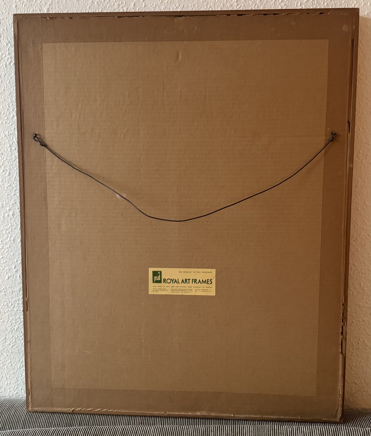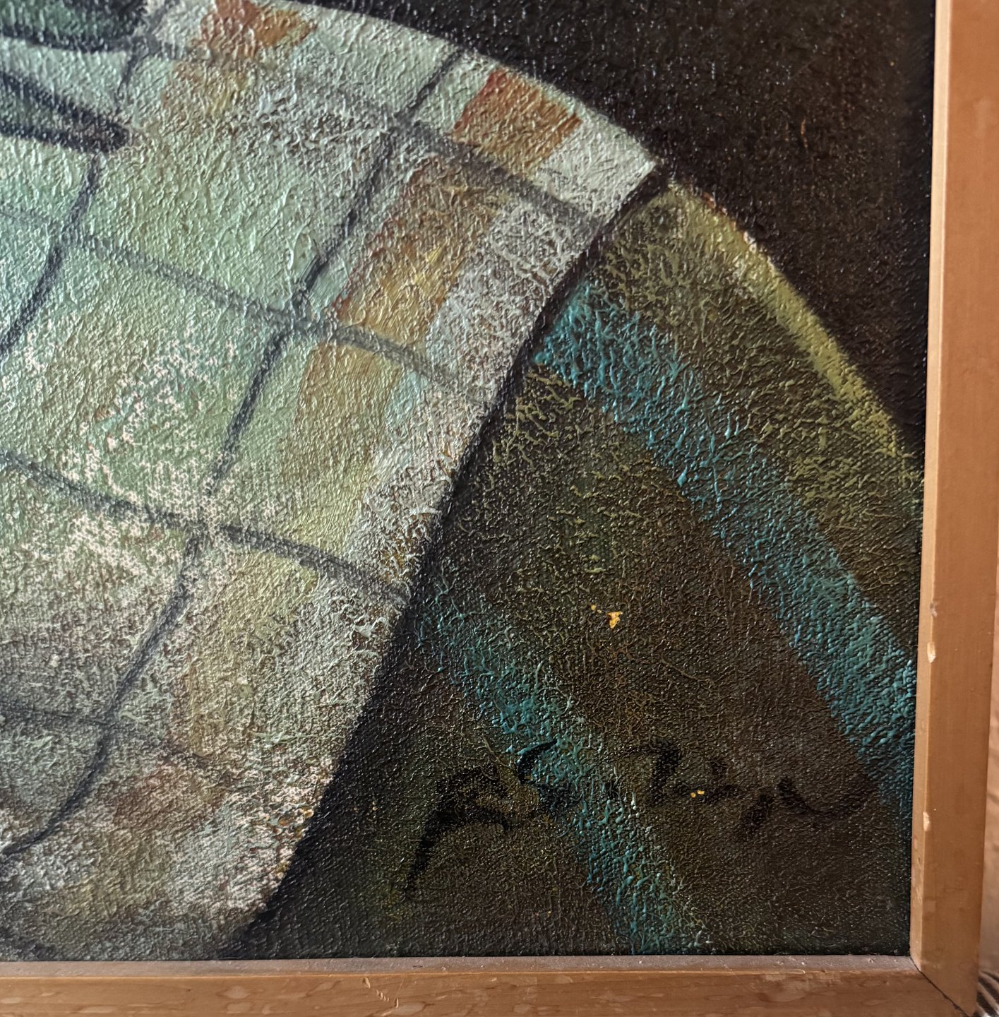 Portræt af en ung kvinde med buket af blomster og kurve med æbler omkring sig. Mål: 61,5 x 75,5 cm.