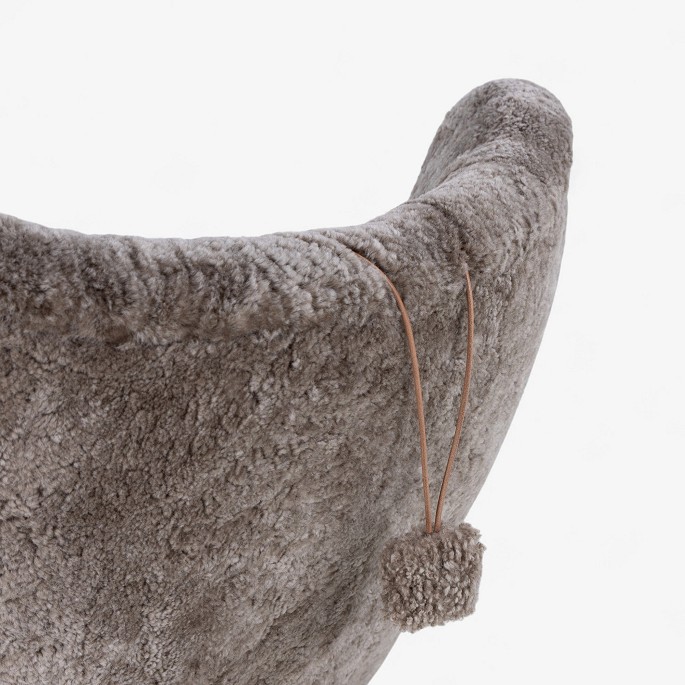 Nybetrukket lænestol med skammel i Scandilock-lammeskind (farve: Cork 19) og ben i hhv. teak og elm.