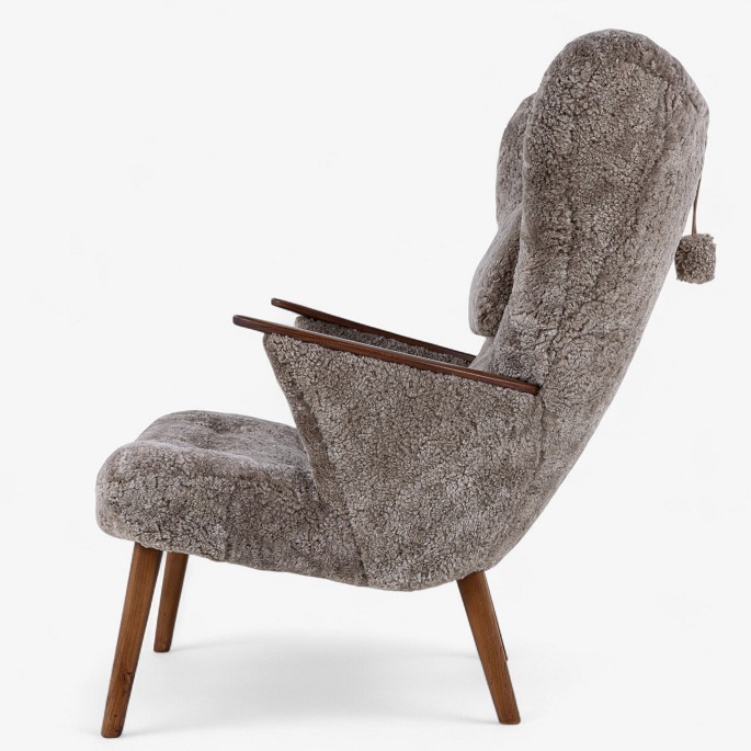 Nybetrukket lænestol med skammel i Scandilock-lammeskind (farve: Cork 19) og ben i hhv. teak og elm.