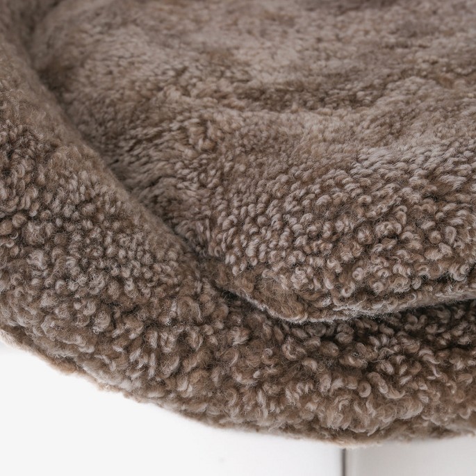 AJ 3316 - Nybetrukket 'Ægget'-lænestol med skammel i lammeskind med (Sahara 07, Curly 17mm) med helstøbt aluminiumsfod.