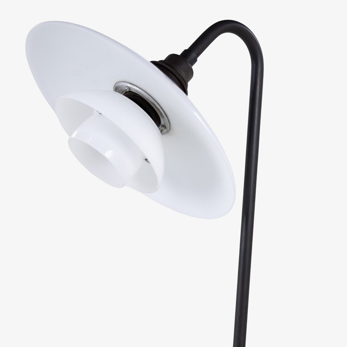 PH 3/2 - 'Syvtallet' gulvlampe med stel i bruneret messing og skærme i hvidt opalglas. Stemplet 'Patented'.