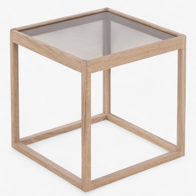 'Kubebord' med stel i lyst egetræ og røgfarvet glasplade.