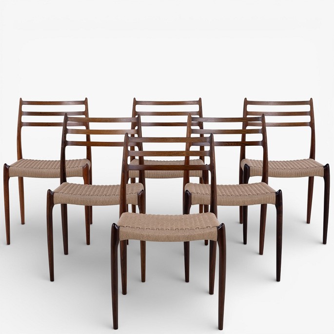 NO 78 - Sæt á 6 spisestole i palisander med sæde i papirgarn. Mærket fra producent.