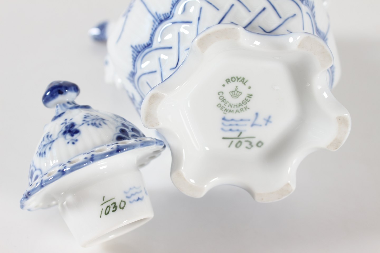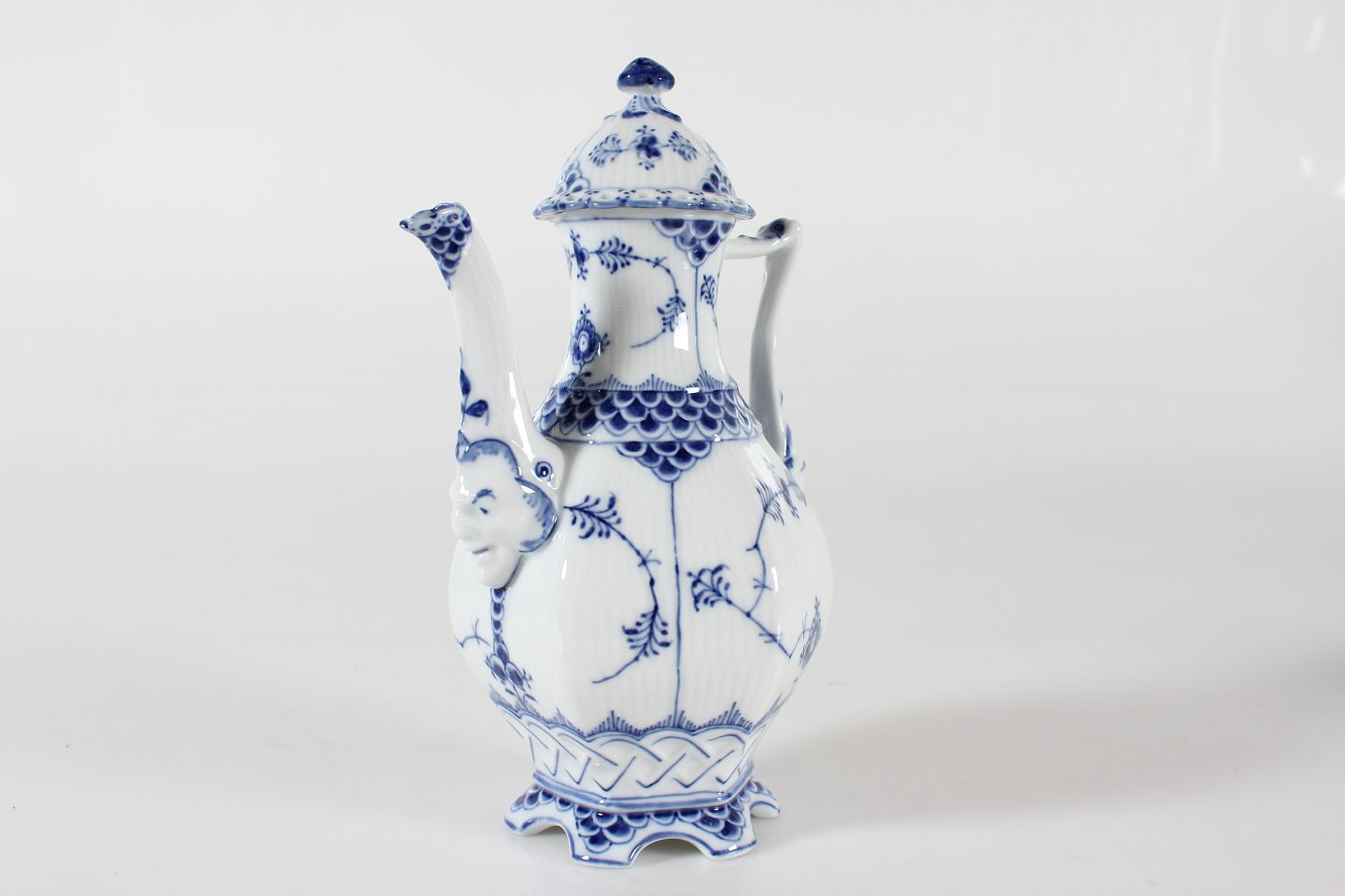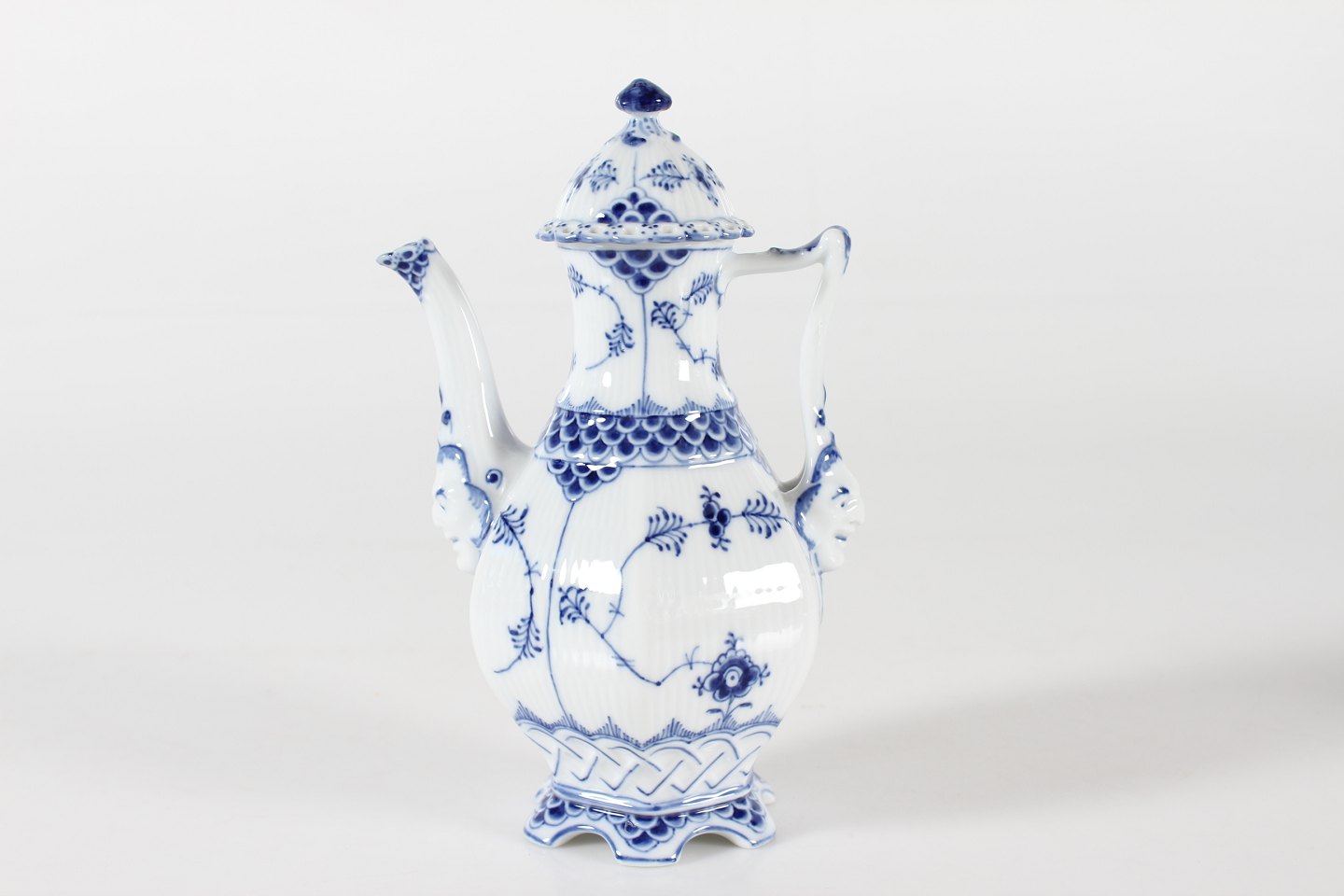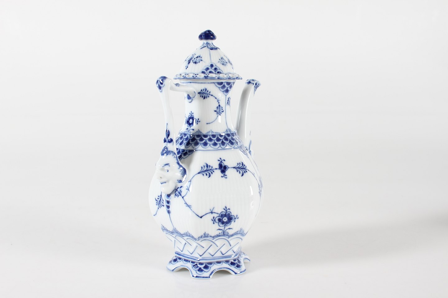 Royal Copenhagen Musselmalet Helblonde Moccakande nr. 1/1030 med djævlehoveder og blondekant på låget, stempel fra 1957 Højde 21 cm Fin fejlfri 1. sortering