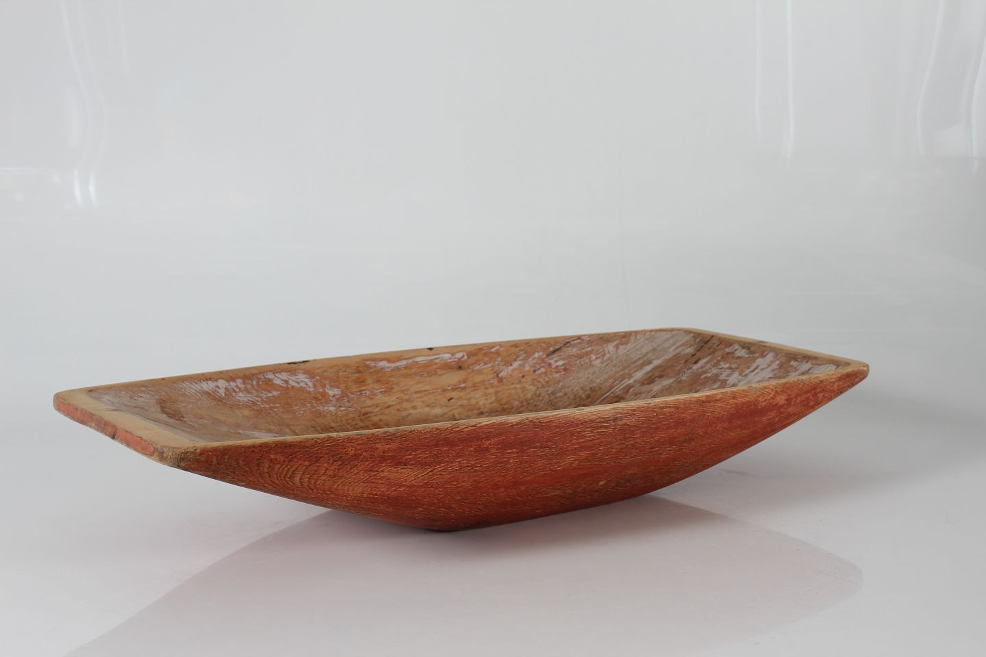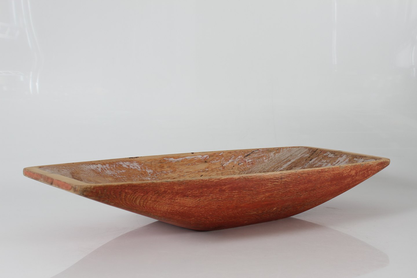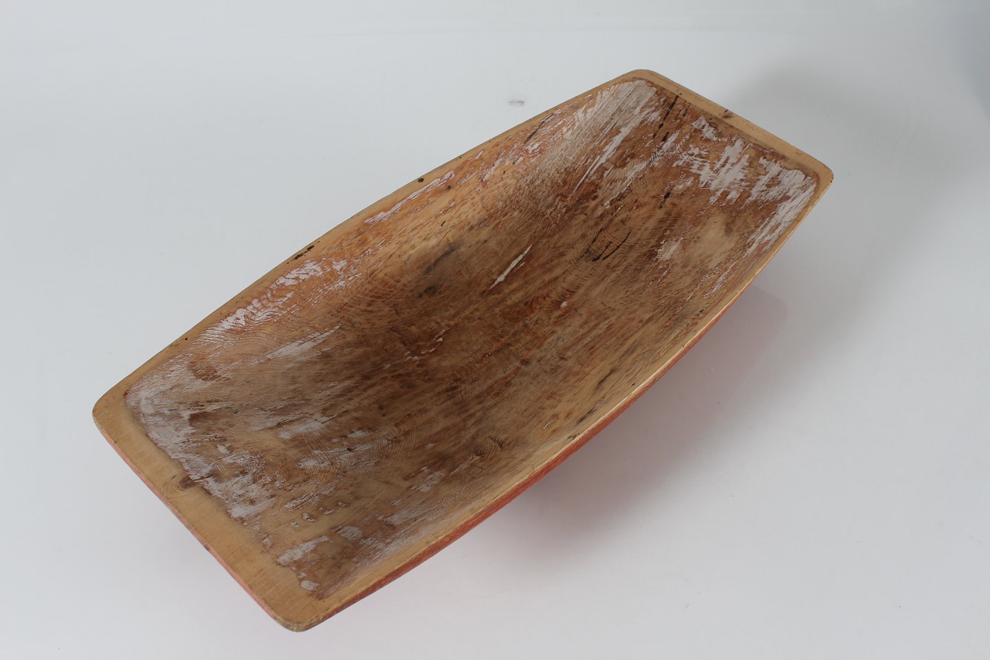 Antik Svensk Landstil Stor massiv trætrug delvist bemalet med rød og hvid maling Håndfremstillet i Sverige i perioden 1850-1900 Sign. JFL Længde 65 cm Bredde 29 cm Højde 10,5 cm Fin stand med brugsspor og patina