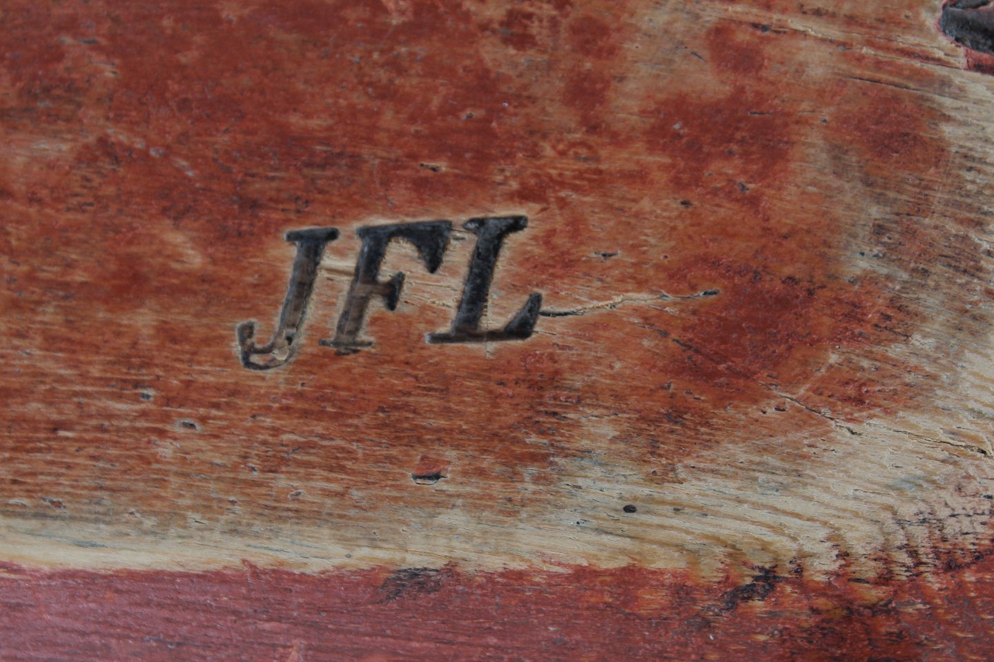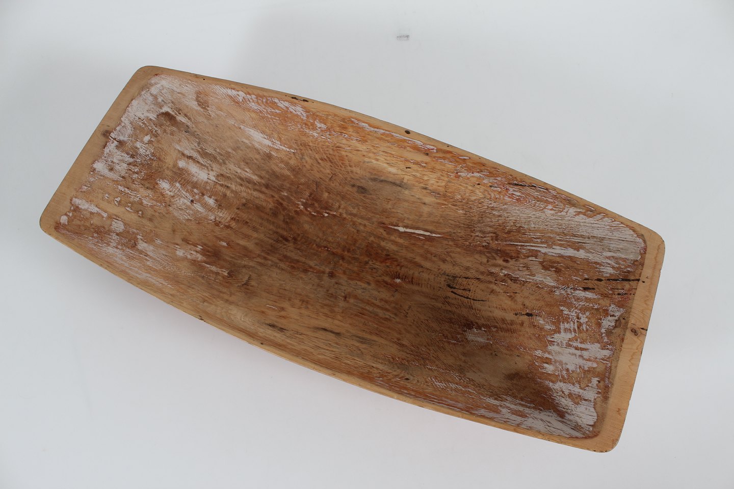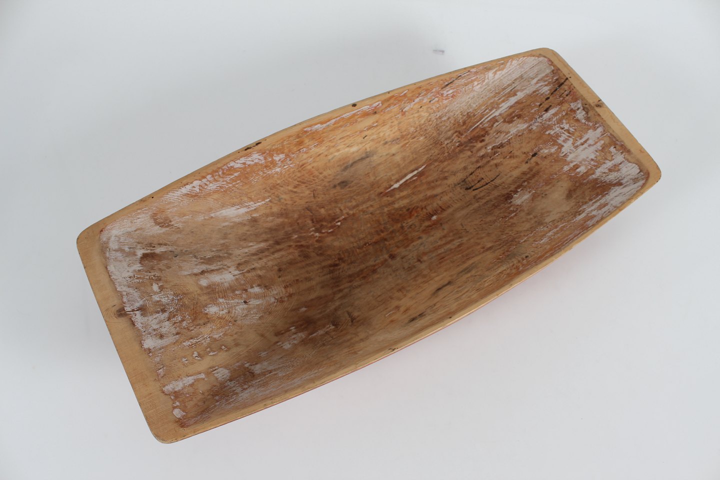 Antik Svensk Landstil Stor massiv trætrug delvist bemalet med rød og hvid maling Håndfremstillet i Sverige i perioden 1850-1900 Sign. JFL Længde 65 cm Bredde 29 cm Højde 10,5 cm Fin stand med brugsspor og patina