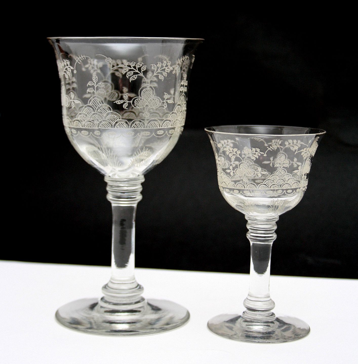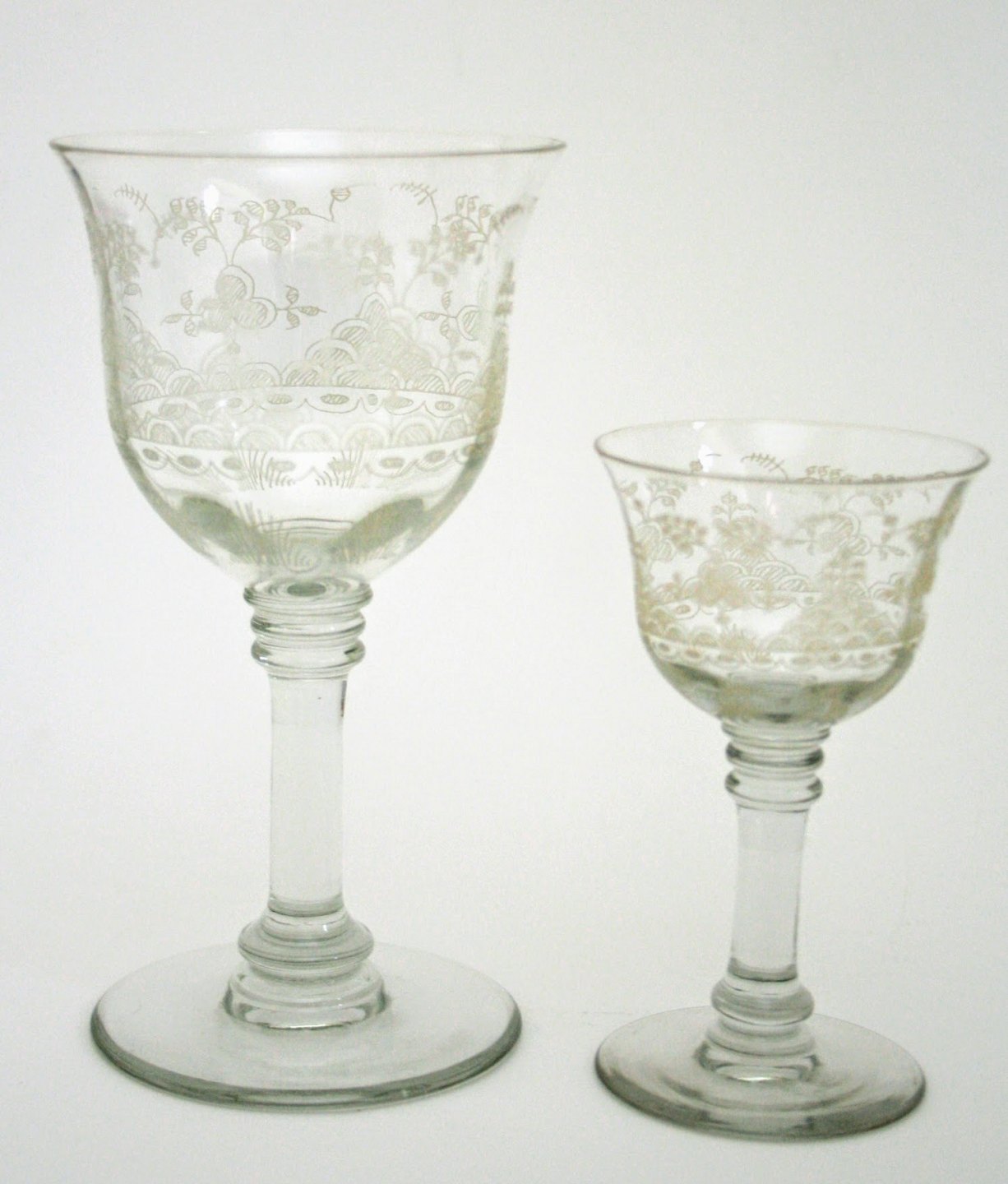 Holmegaard Glasværk, Knipling med ætset motiv. Designet af Oluf Jensen i 1924, produceret frem til 1935. Første service er udført til den kongelige porcelænsfabrik som match til det musselmalede porcelænsstel.