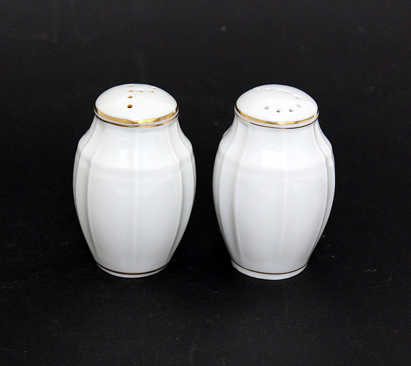Bing & Grøndahl, Offenbach, Salt og Peber sæt. Hvidt kantet porcelæn med guld. Højde 7,5 cm. Salt og peber med original B&G propper. Pris: 375 kr. for sættet.