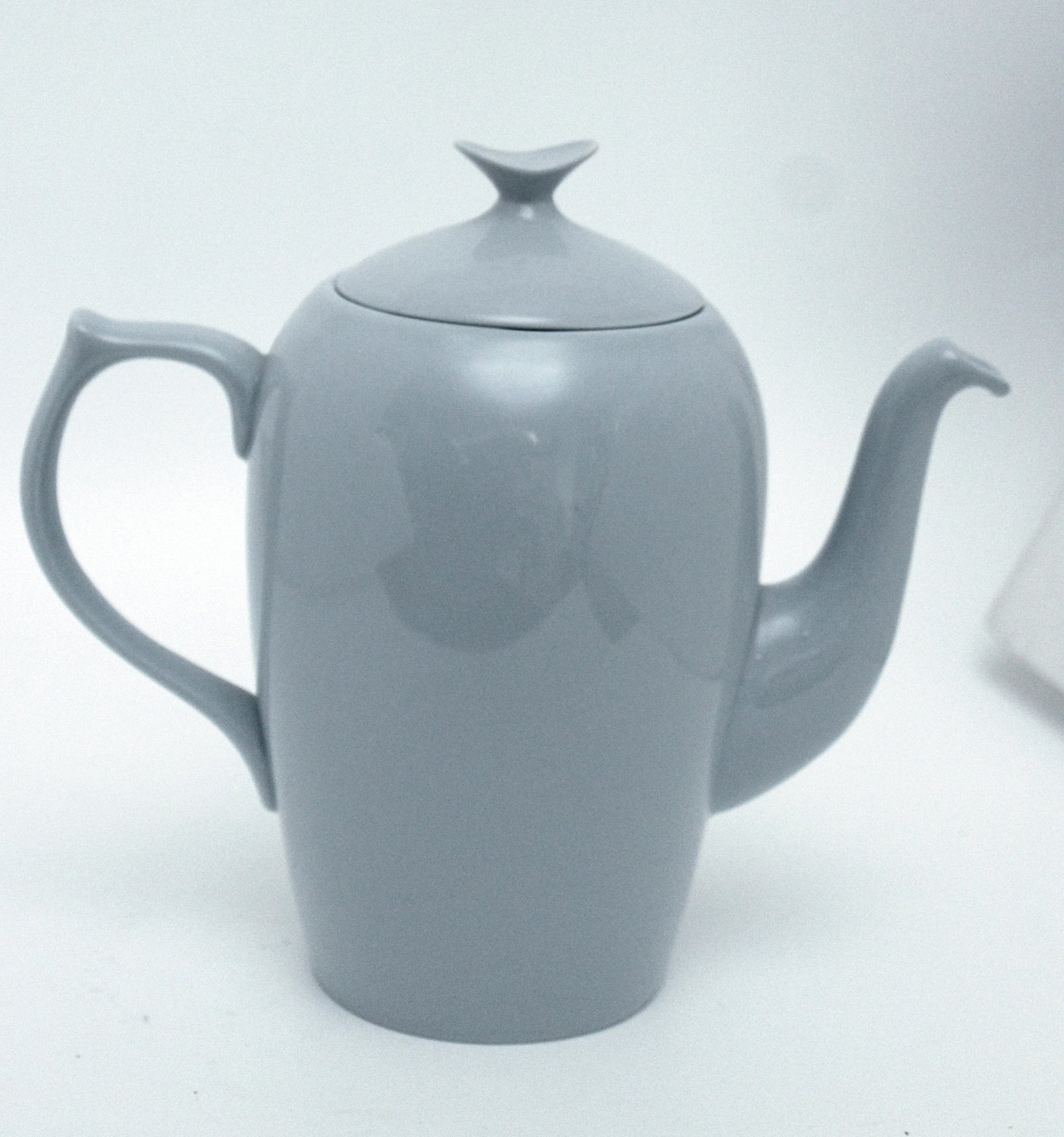 Bing & Grøndahl, Leda, Sart lysegrå/lyseblå stel. Kaffekande. Farven snyder meget, på billederne ser det lyseblåt ud og alt efter lyset ser det gråt ud. Kaffekande. Nr. 301. Højde 20,5 cm. Længde 22 cm. Bredde 10 cm. Pris: 250 kr.